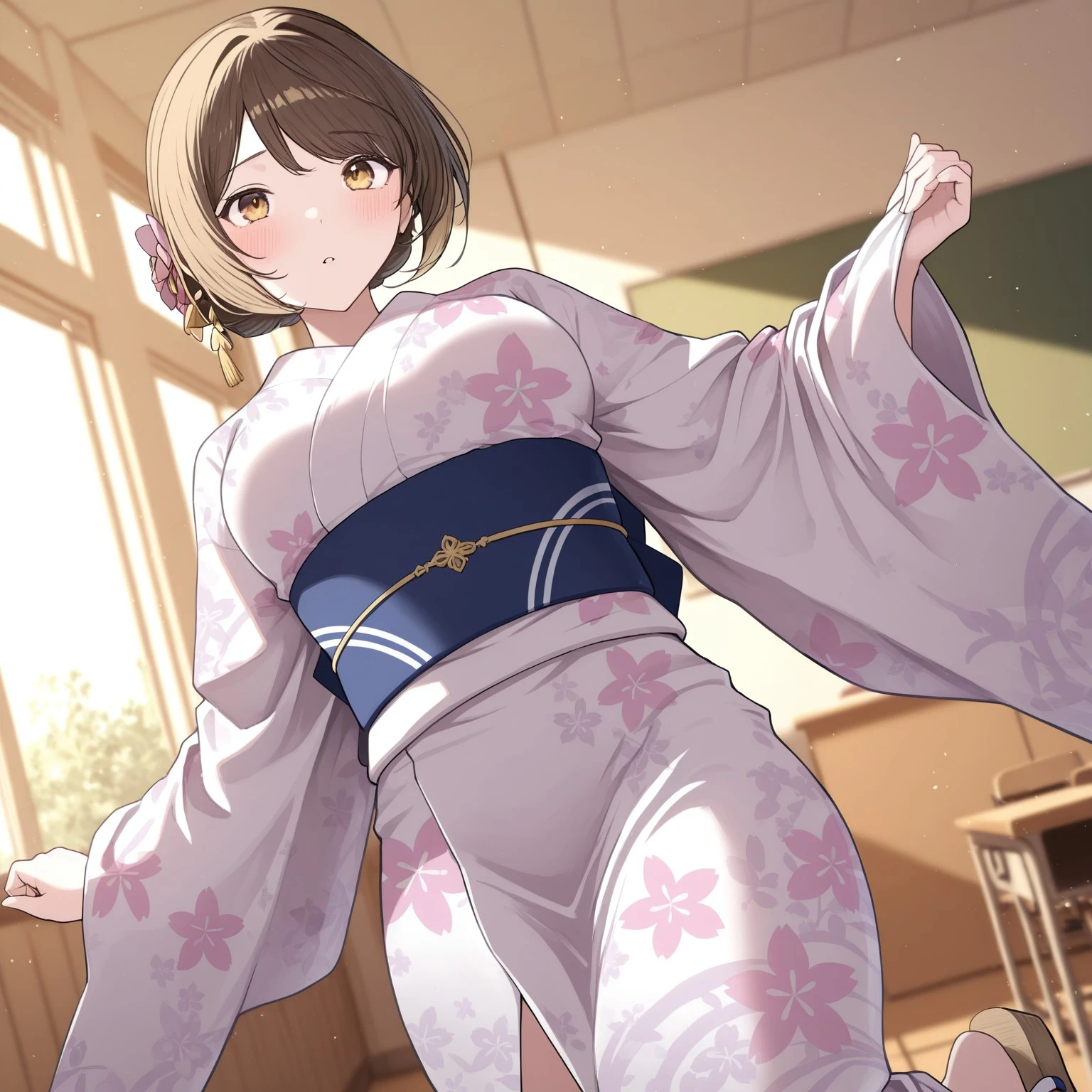 outfit2: harukim, floral print, japanese clothes, hair bun, hair ornament, hair flower, obi, sandals, sash, kimono