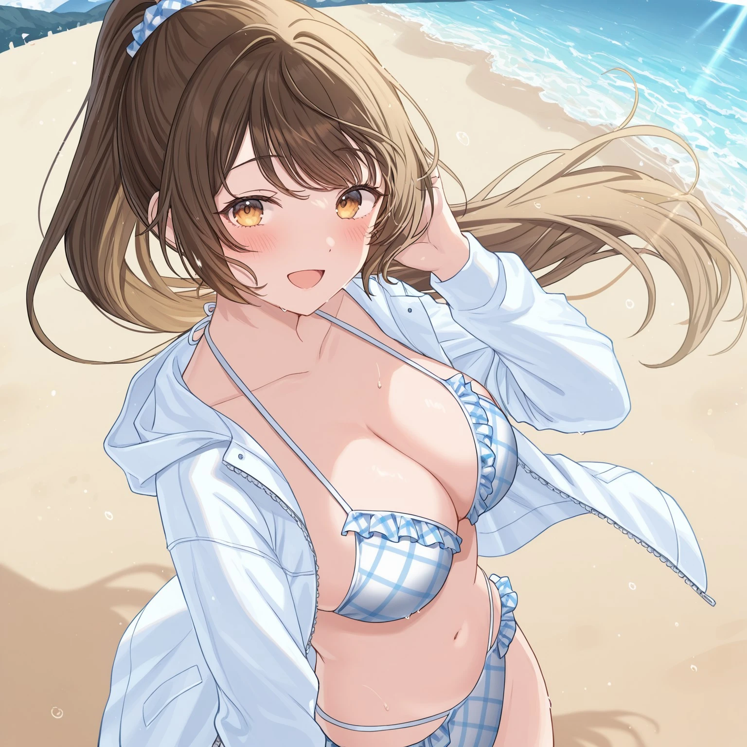outfit4: haruswi, swimsuit, plaid bikini, frilled bikini, navel, hair scrunchie, blue bikini, cleavage, open jacket, jacket, white jacket, unzipped jacket