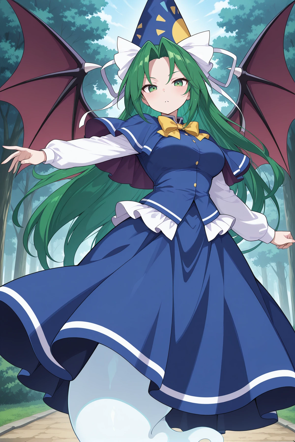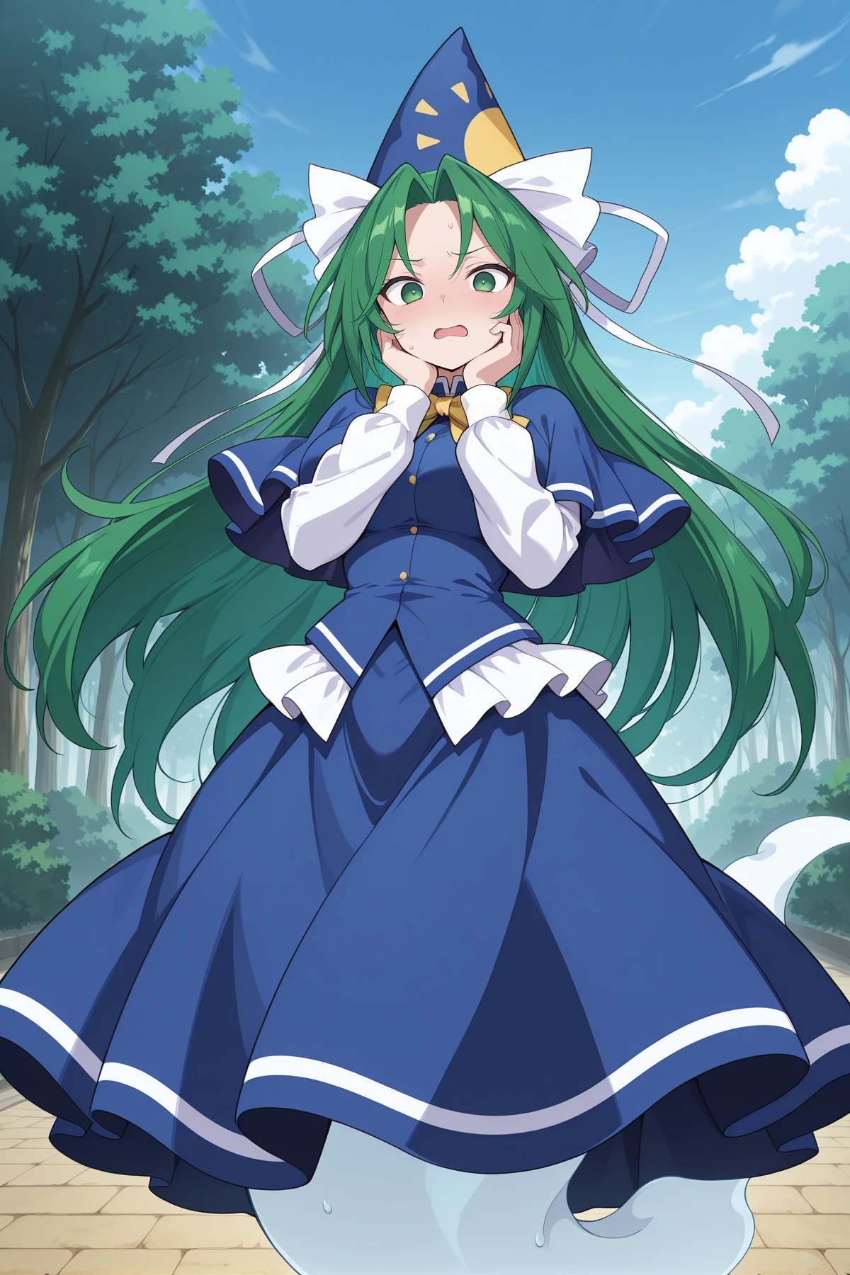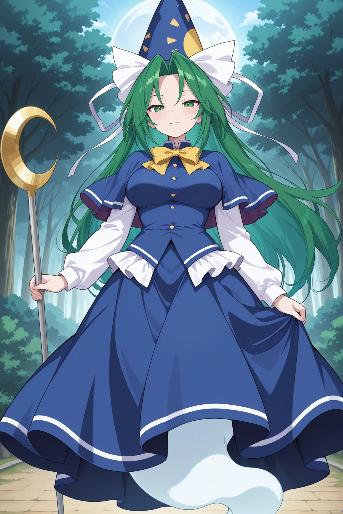 mima, 1girl, solo, green eyes, green hair, long hair, medium breasts,wizard hat, blue capelet, yellow bow, blue dress, white sleeves, long sleeves, blue skirt, ghost tail,Optional :