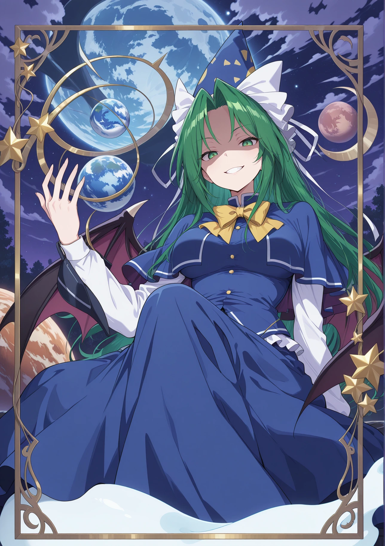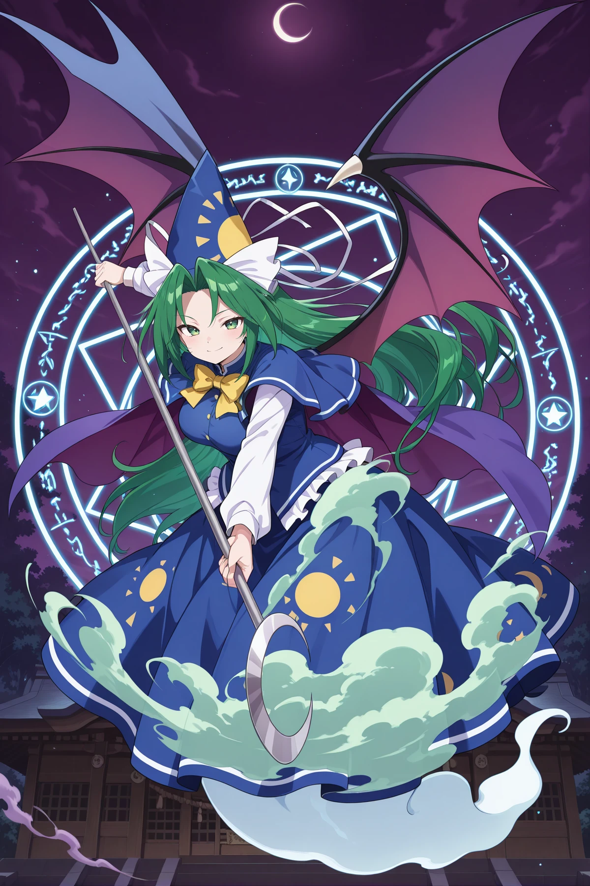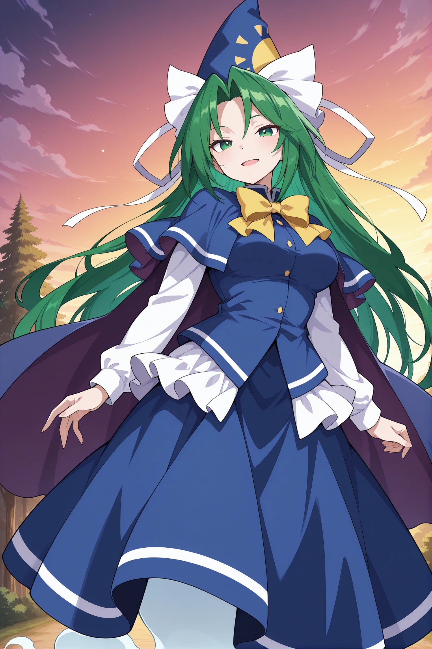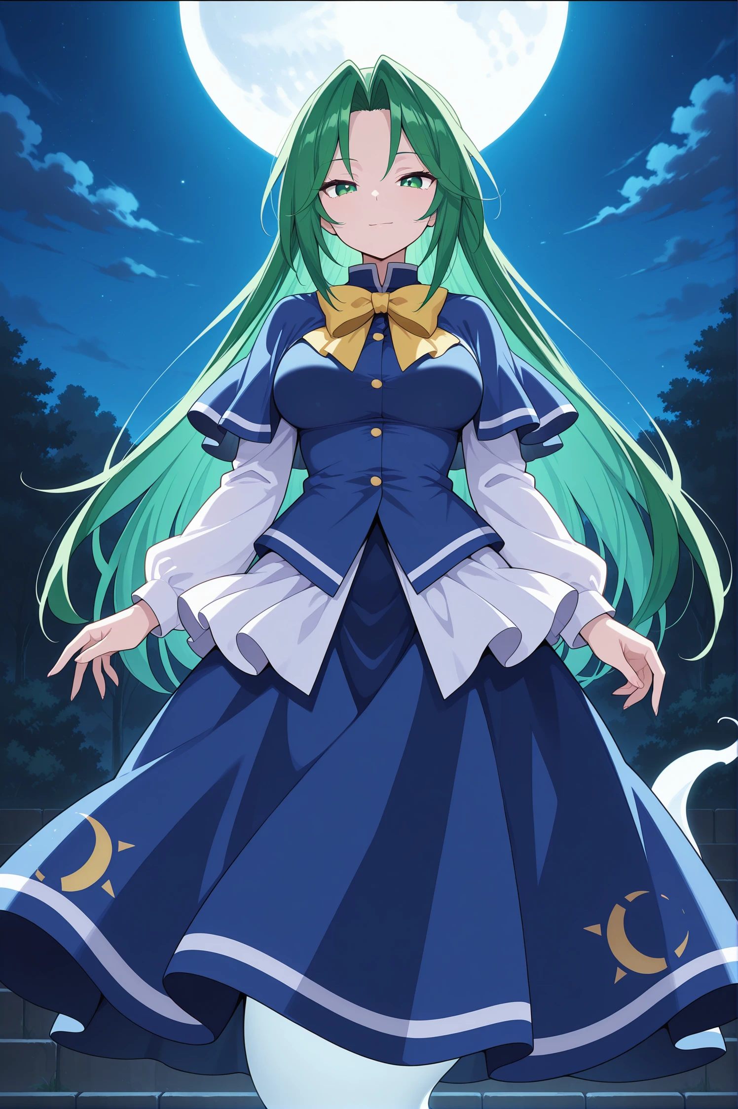 mima, 1girl, solo, green eyes, green hair, long hair, medium breasts,wizard hat, blue capelet, yellow bow, blue dress, white sleeves, long sleeves, blue skirt, ghost tail,Optional :