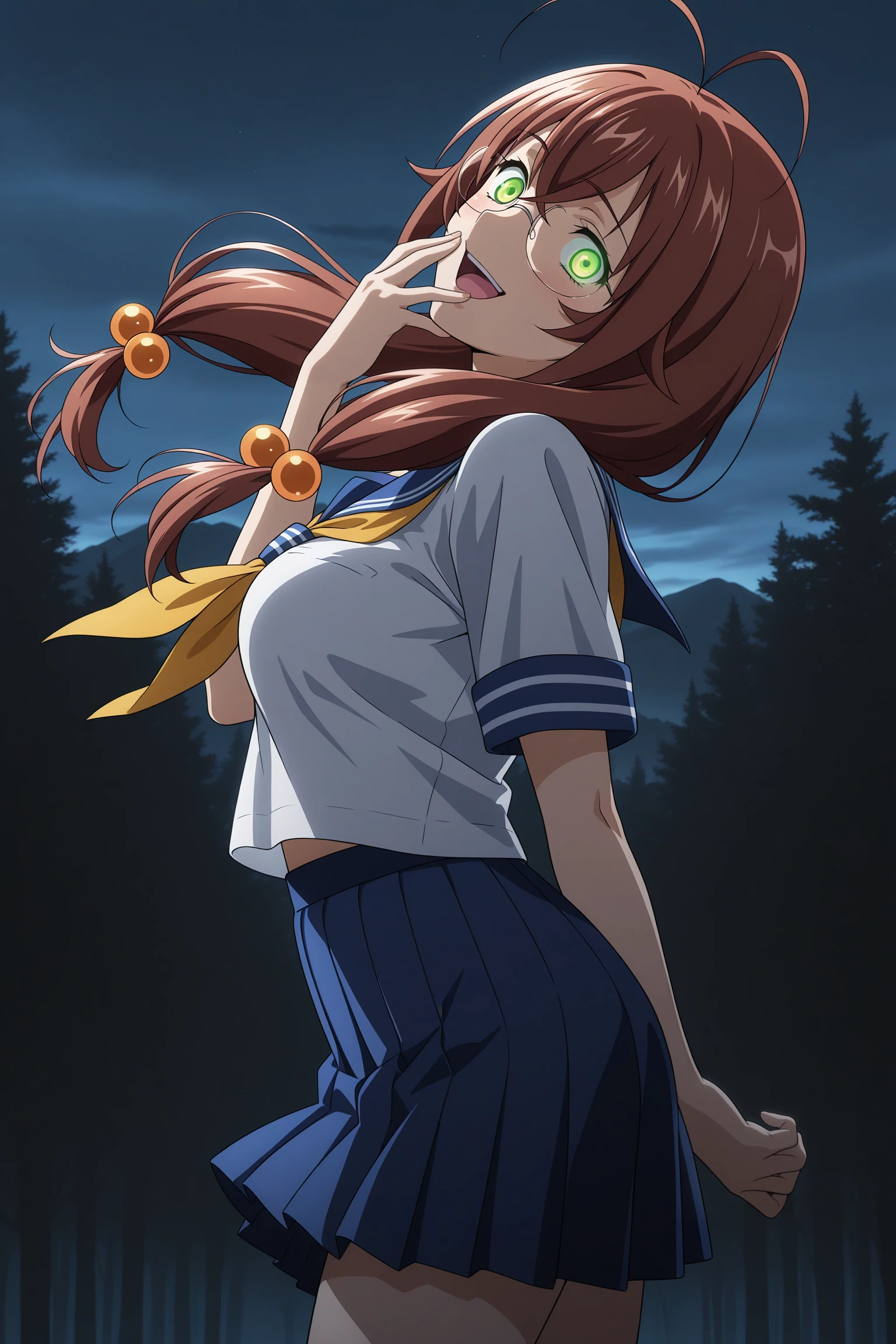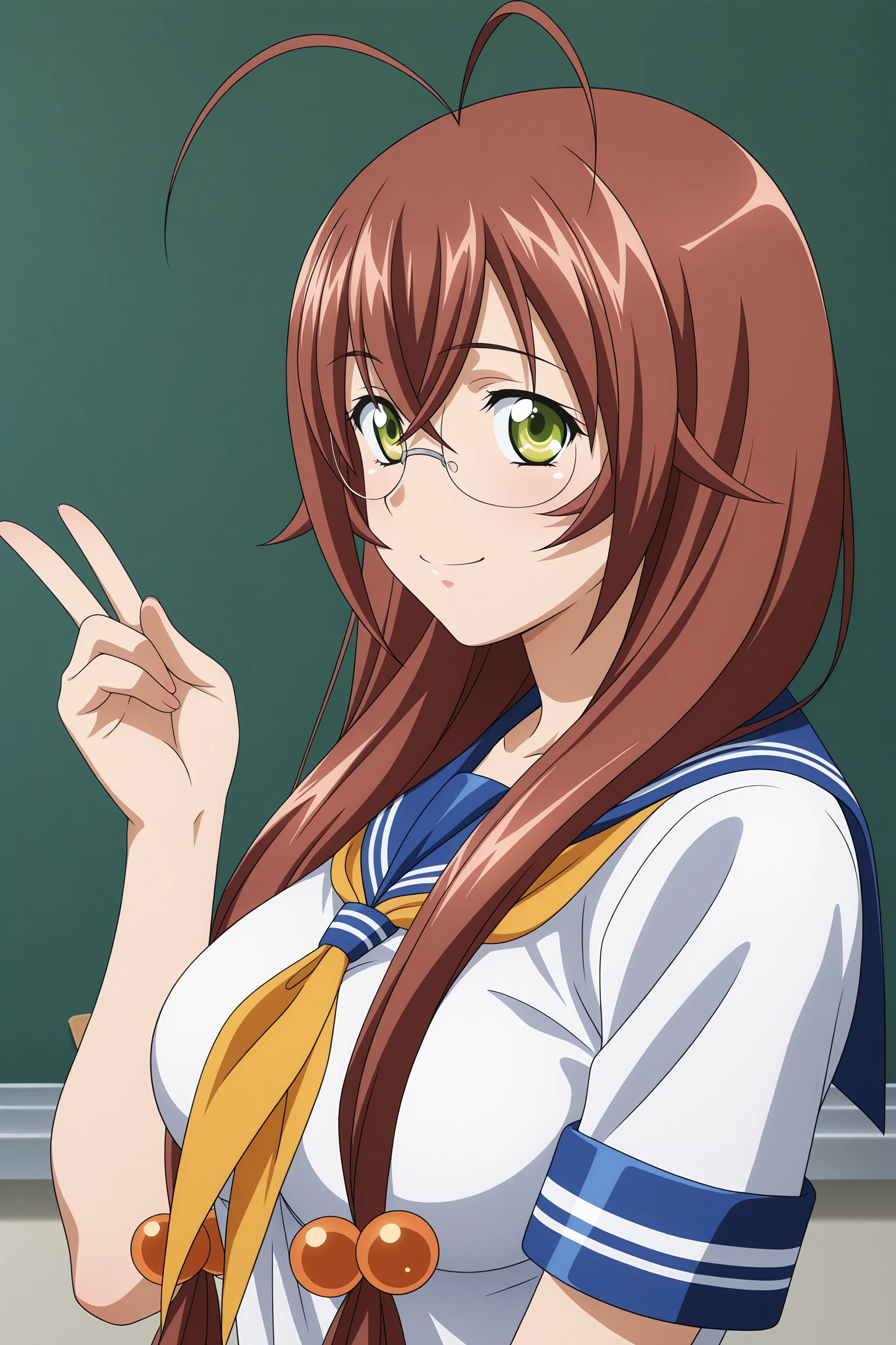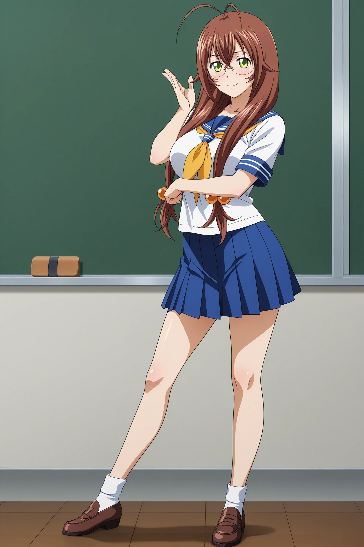 ryuubi gentoku, long hair, brown hair, low twintails, hair bobbles, antenna hair, crossed bangs, green eyes, rimless eyewear, short sleeves, white shirt, blue sailor collar, yellow neckerchief, blue skirt, pleated skirt, white socks, ankle socks, brown footwear, loafers