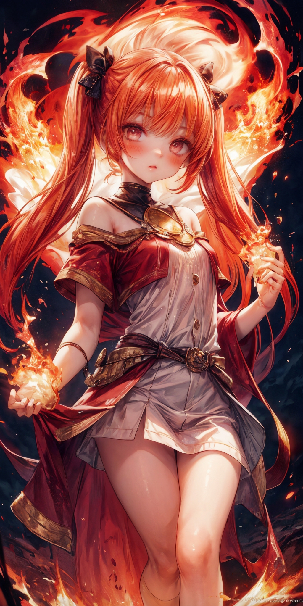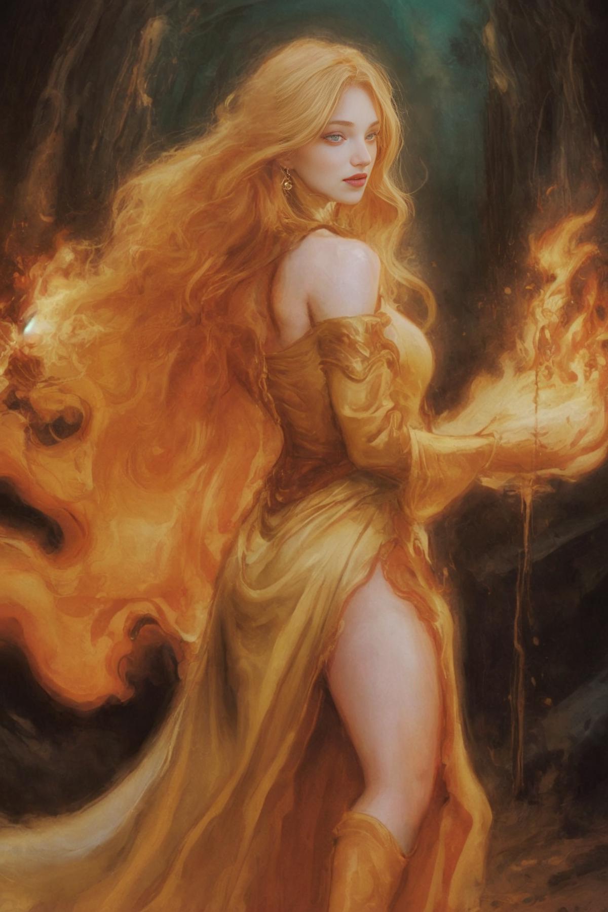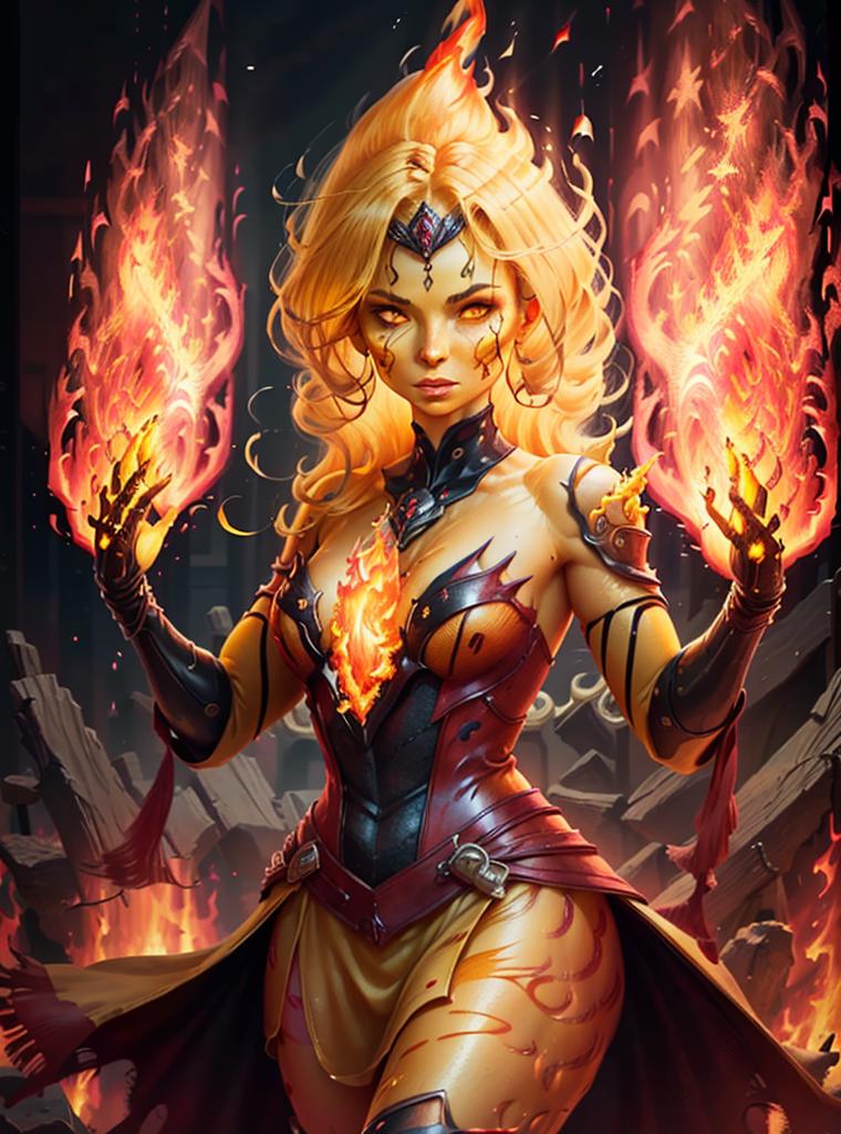 The larger the weight of the Lora, the model will acquire a stone or limestone armor, that’s what I’ve been able to observe while testing it. If you want a more flaming and clean body, reduce the Lora to (0.4). To invoke the Lora I recommend using the following keywords (FireFull) and also works (girl by FireFull) for greater precision. Additionally use the following keywords to get a better flaming body (fire skin, yellow skin:2).”