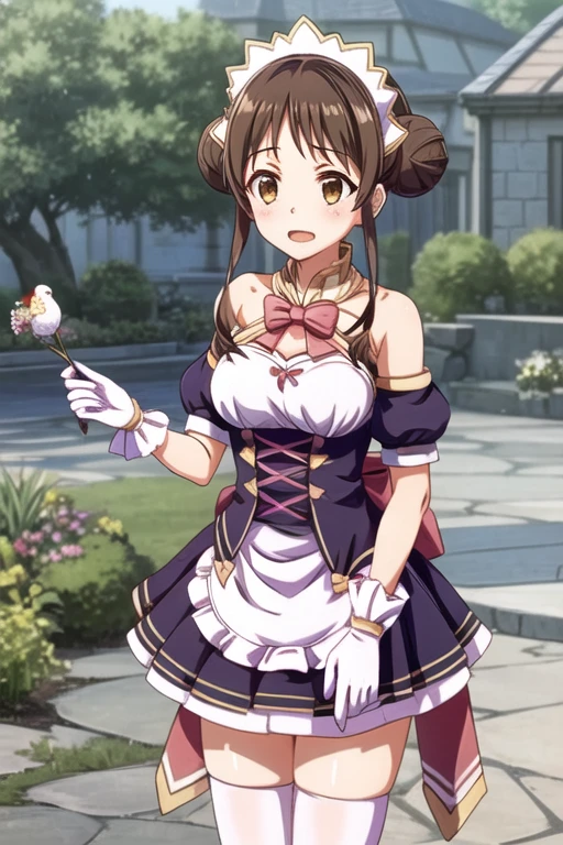suzume (princess connect!), 1girl, solo, brown hair, gloves, bow, bare shoulders, brown eyes, boots, white thighhighs, maid headdress, double bun