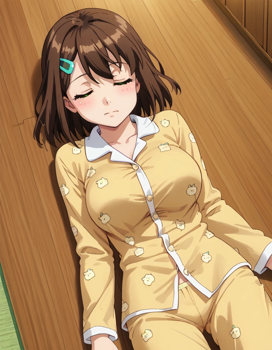 1girl, solo, rin namiki, brown hair, green eyes, large breasts, hairclip, hair ornament