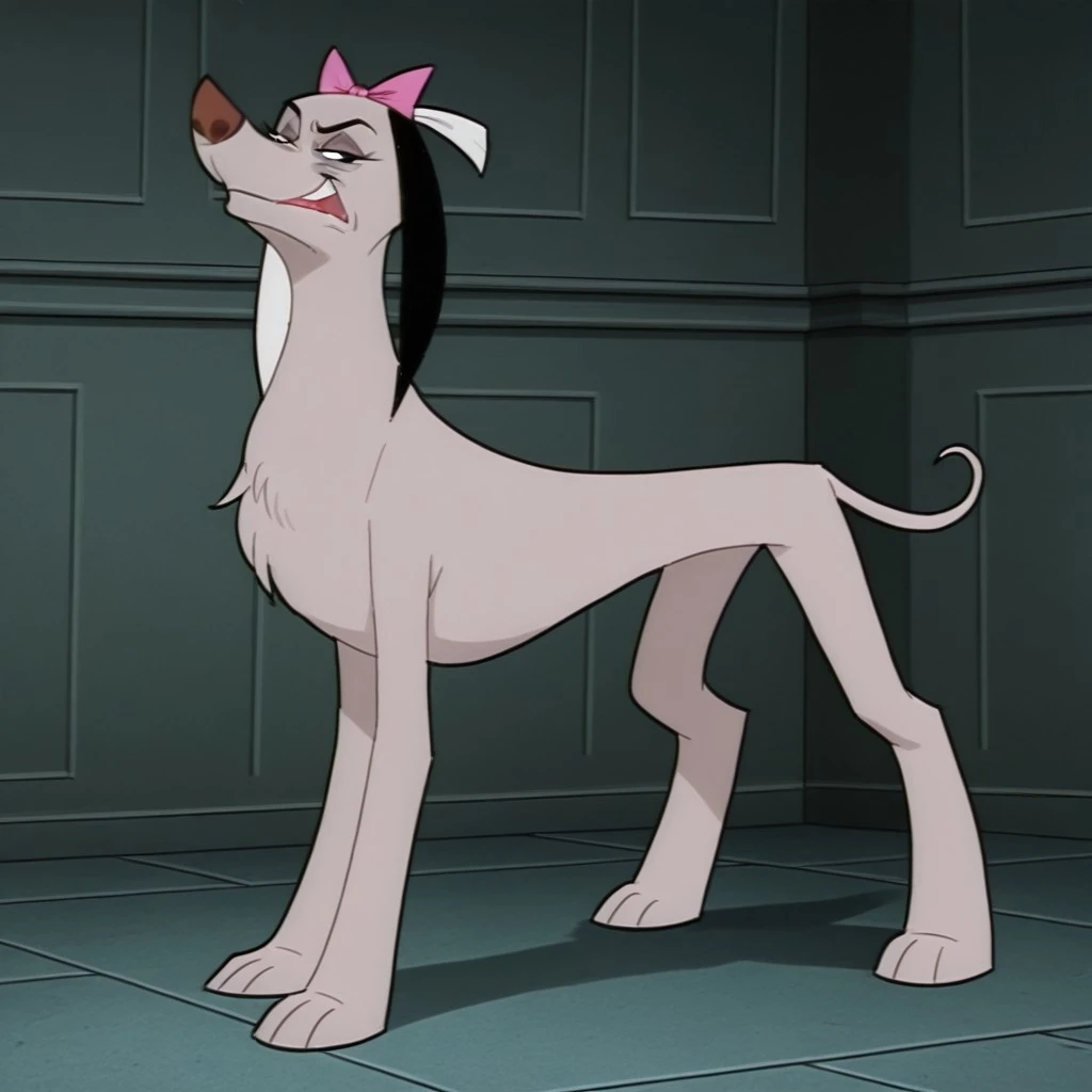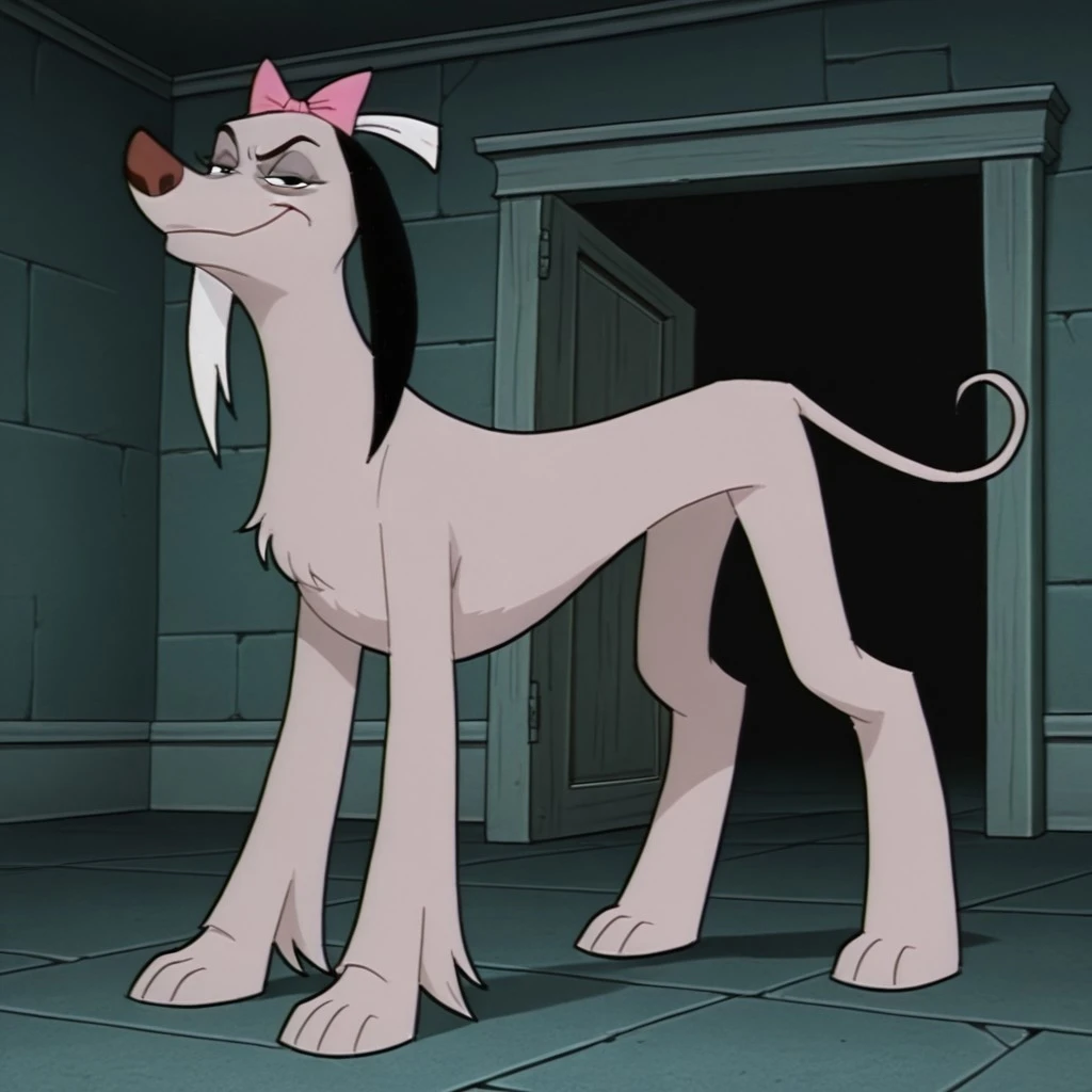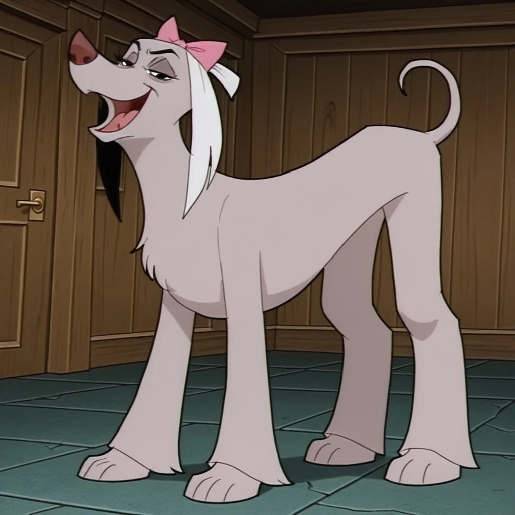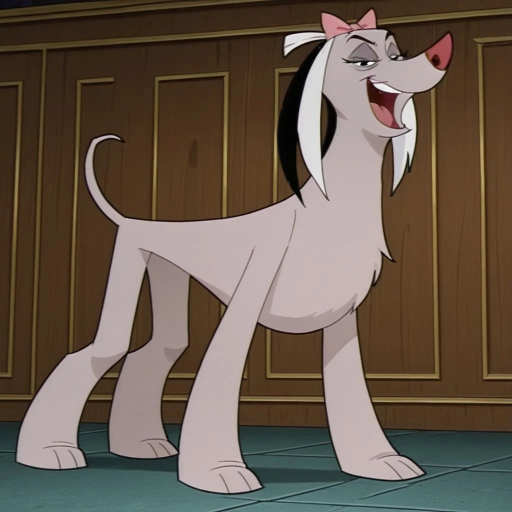 vendella de vil, female, dog, disney, afghan hound, mauve fur, long fur, black hair, left white ear, right black ear, black eyes, pink hair bow, upturned nose