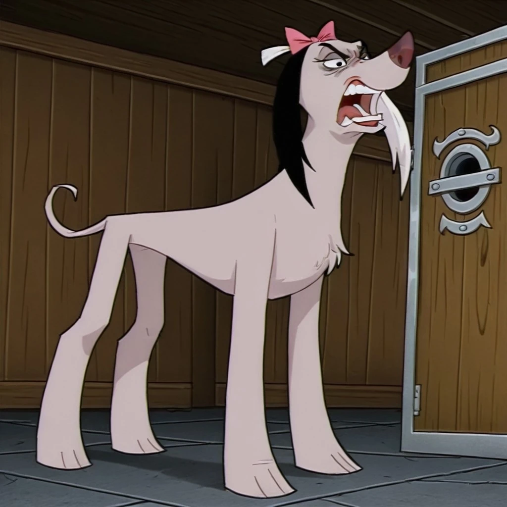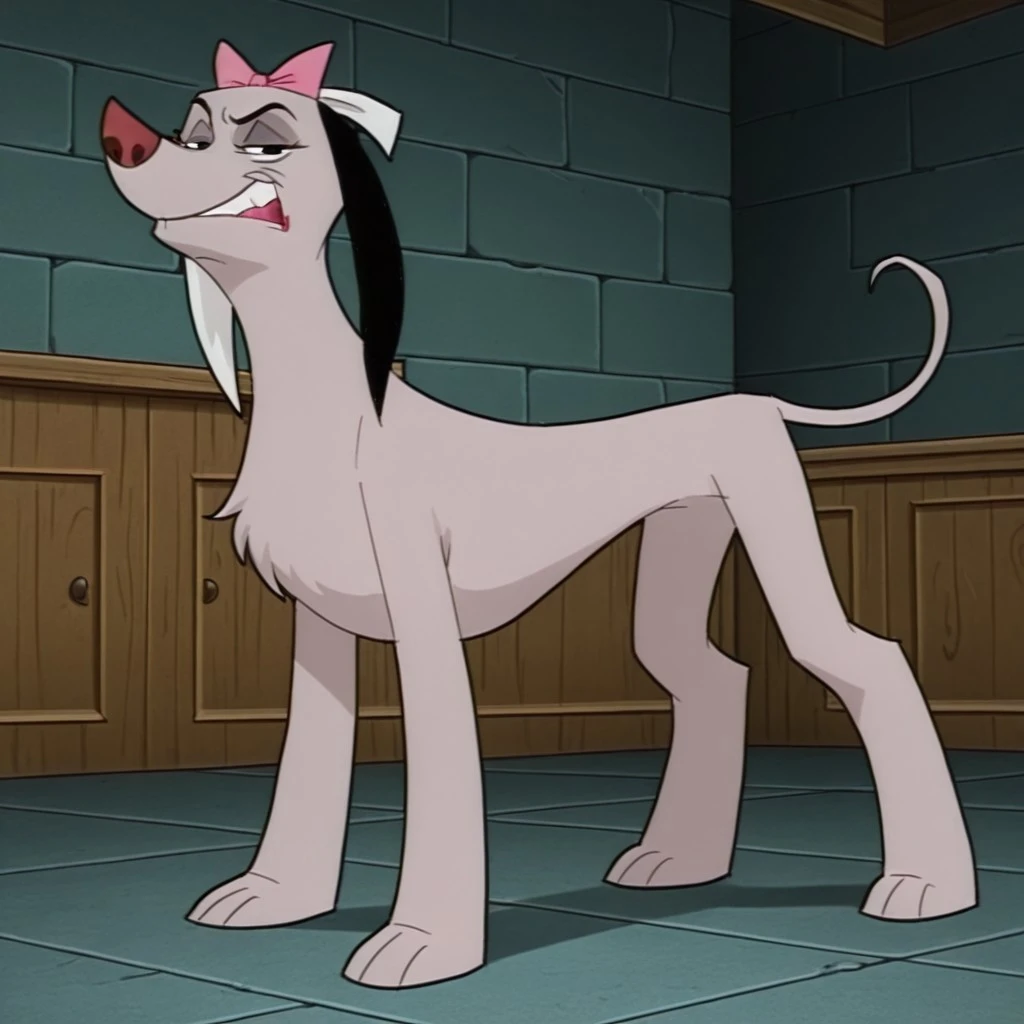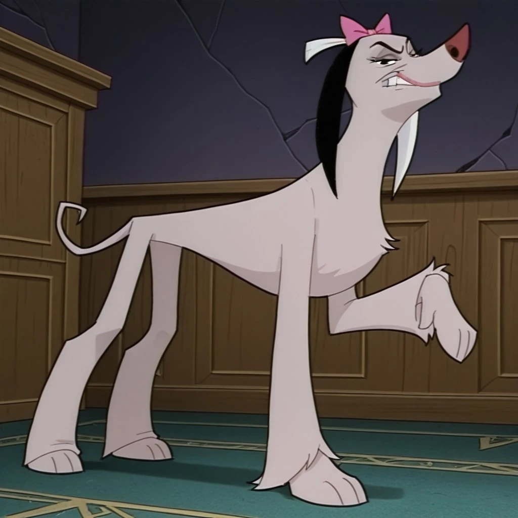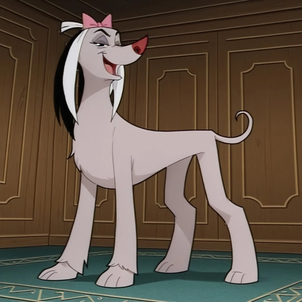 vendella de vil, female, dog, disney, afghan hound, mauve fur, long fur, black hair, left white ear, right black ear, black eyes, pink hair bow, upturned nose