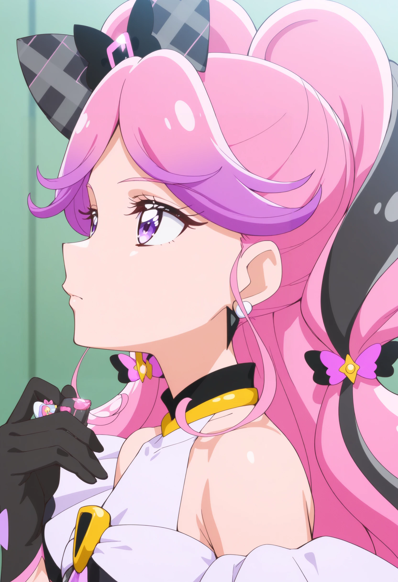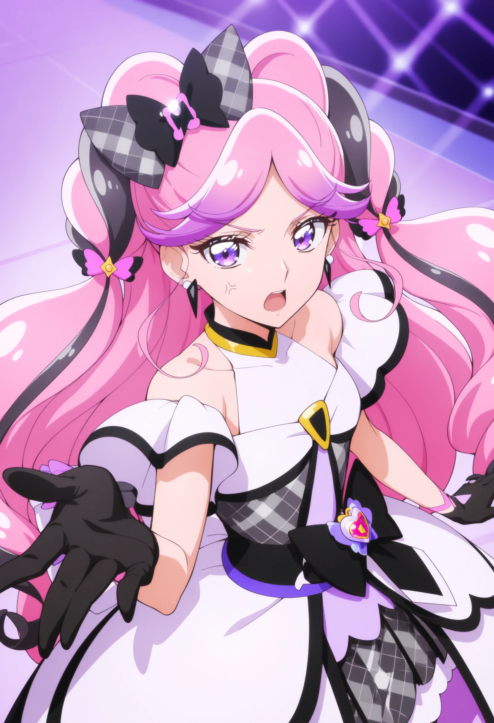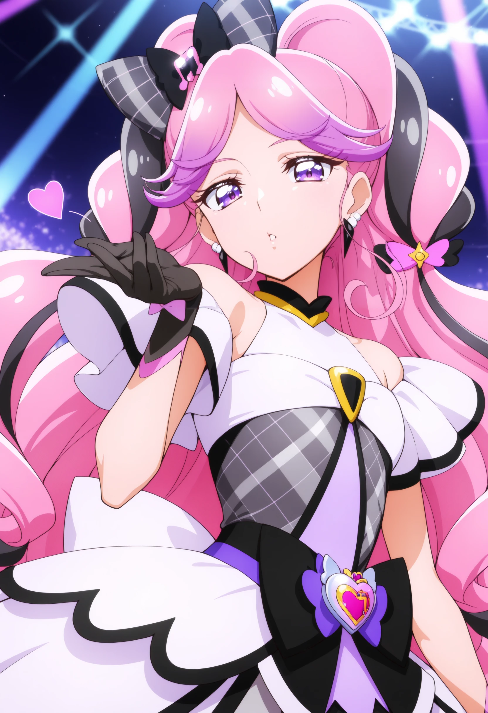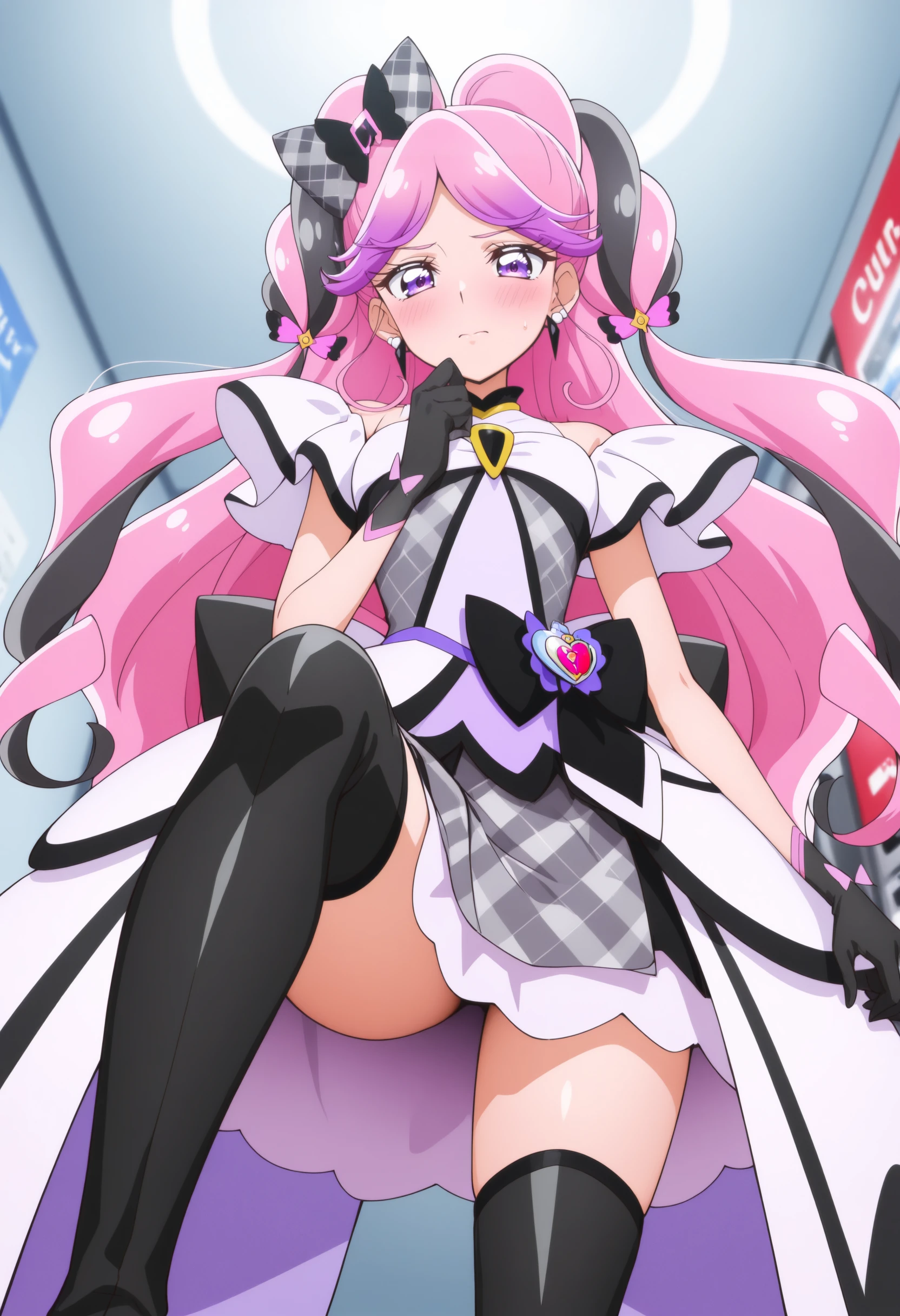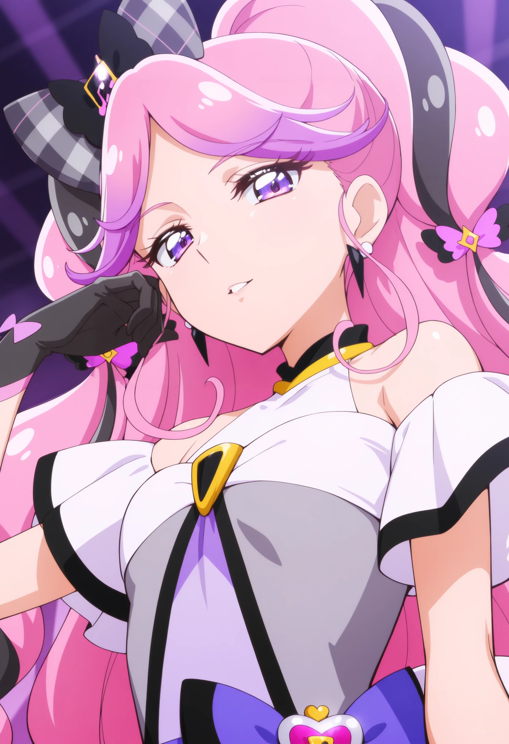 If it's not stable, you can use long hair, curly hair, pink hair, black hair, purple hair, multicolored hair,streaked hair, two-tone hair,purple eyes,magical girl, idol clothes, bare shoulders, gray dress,earrings, hair bow, jewelry, black gloves, hair ornament,thigh boots, black footwear, zettai ryouiki, plaid skirt, layered skirt, please add what you need in the area to assist.