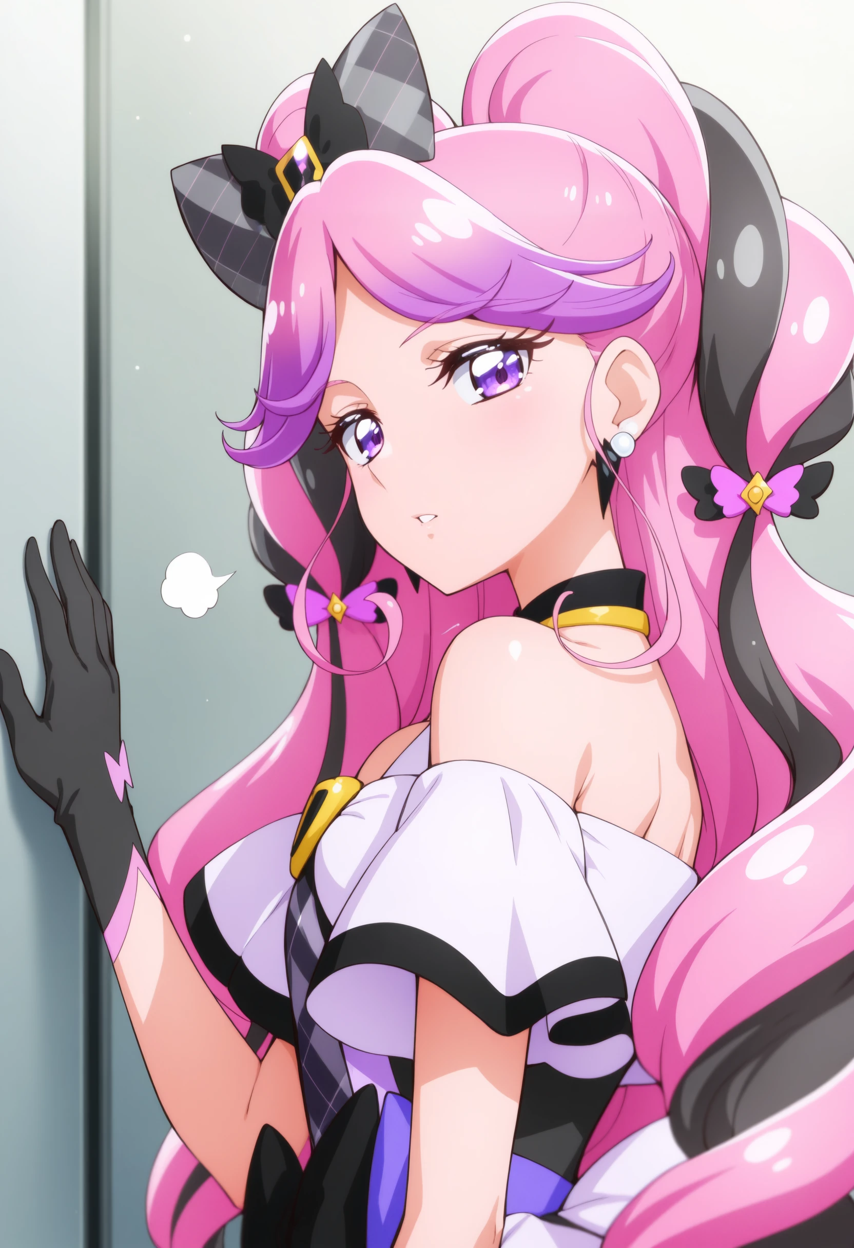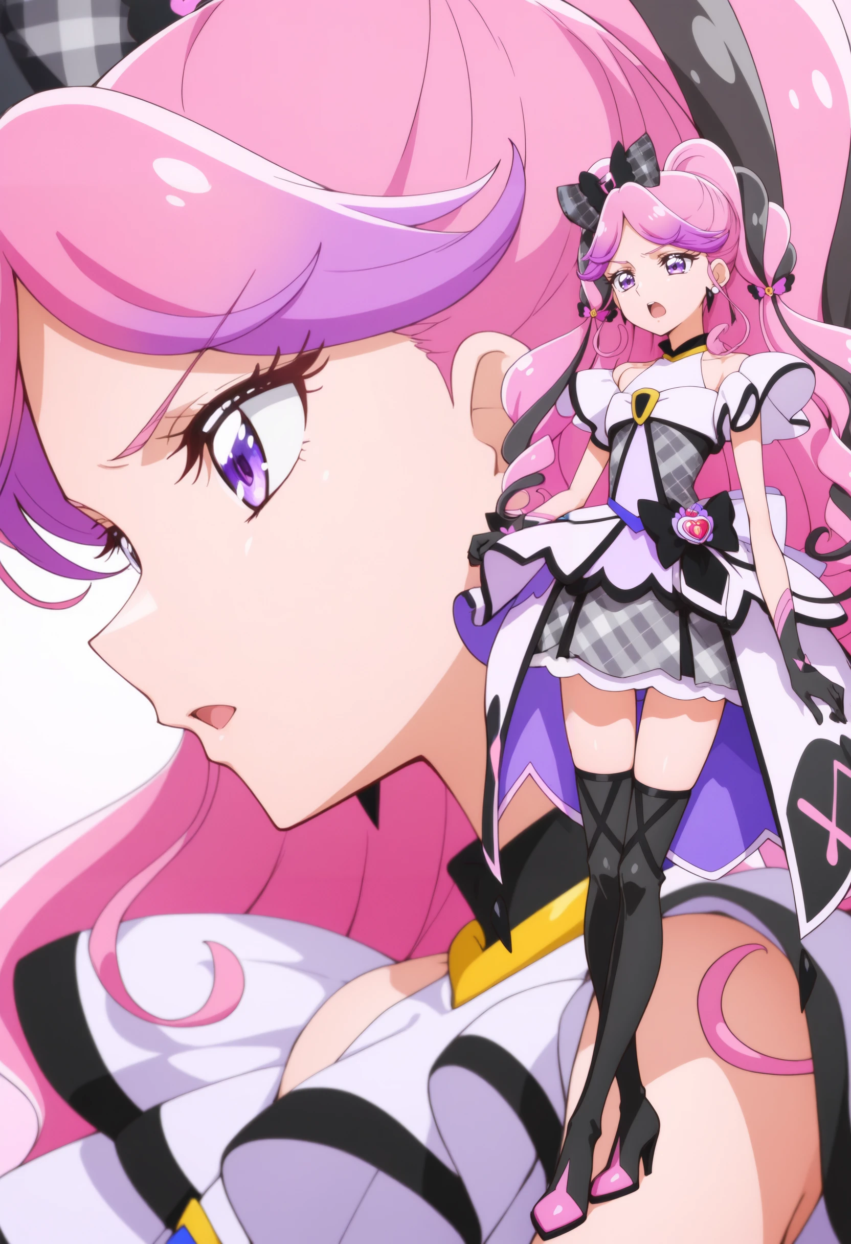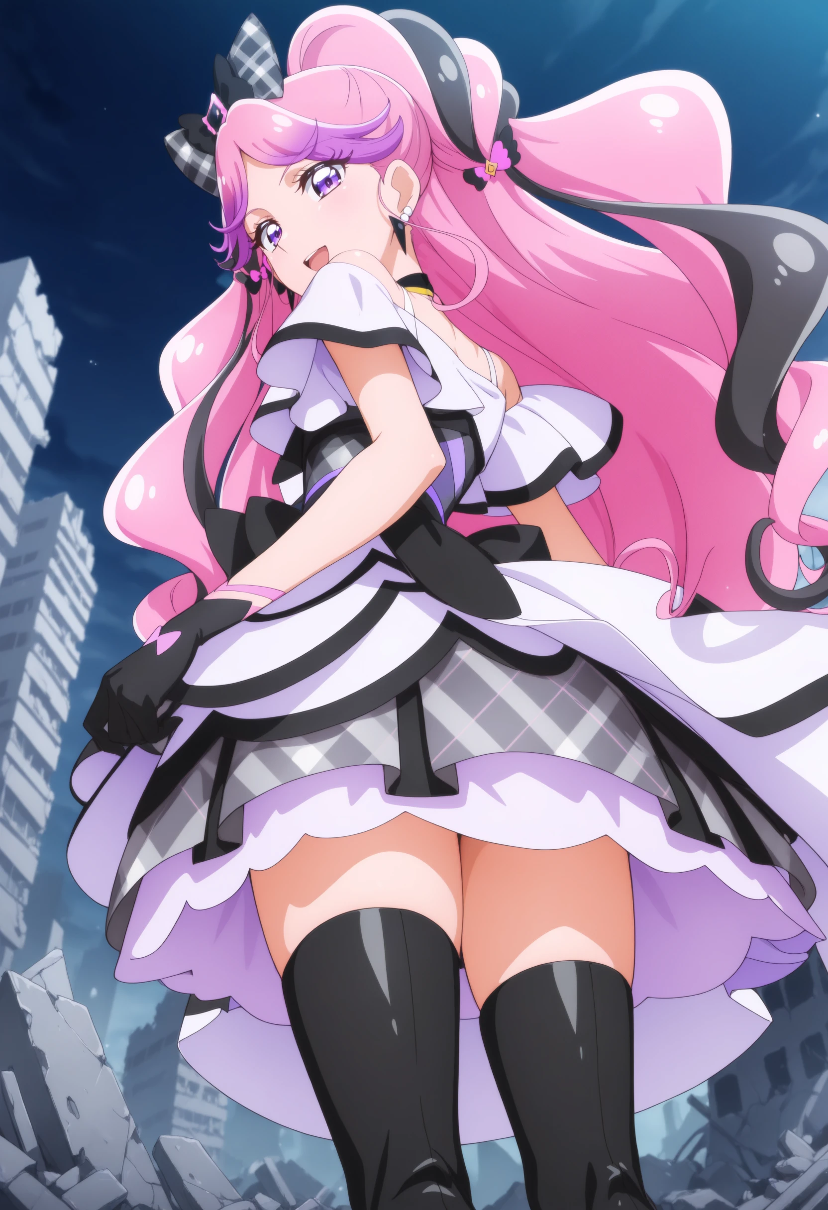 ??しない場合は long hair, curly hair, pink hair, black hair, purple hair, multicolored hair,streaked hair, two-tone hair,purple eyes,magical girl, idol clothes, bare shoulders, grey dress,earrings, hair bow, jewelry, black gloves, hair ornament,thigh boots, black footwear, zettai ryouiki, plaid skirt, layered skirt, 辺りから必要なものを入れて補助して下さい。