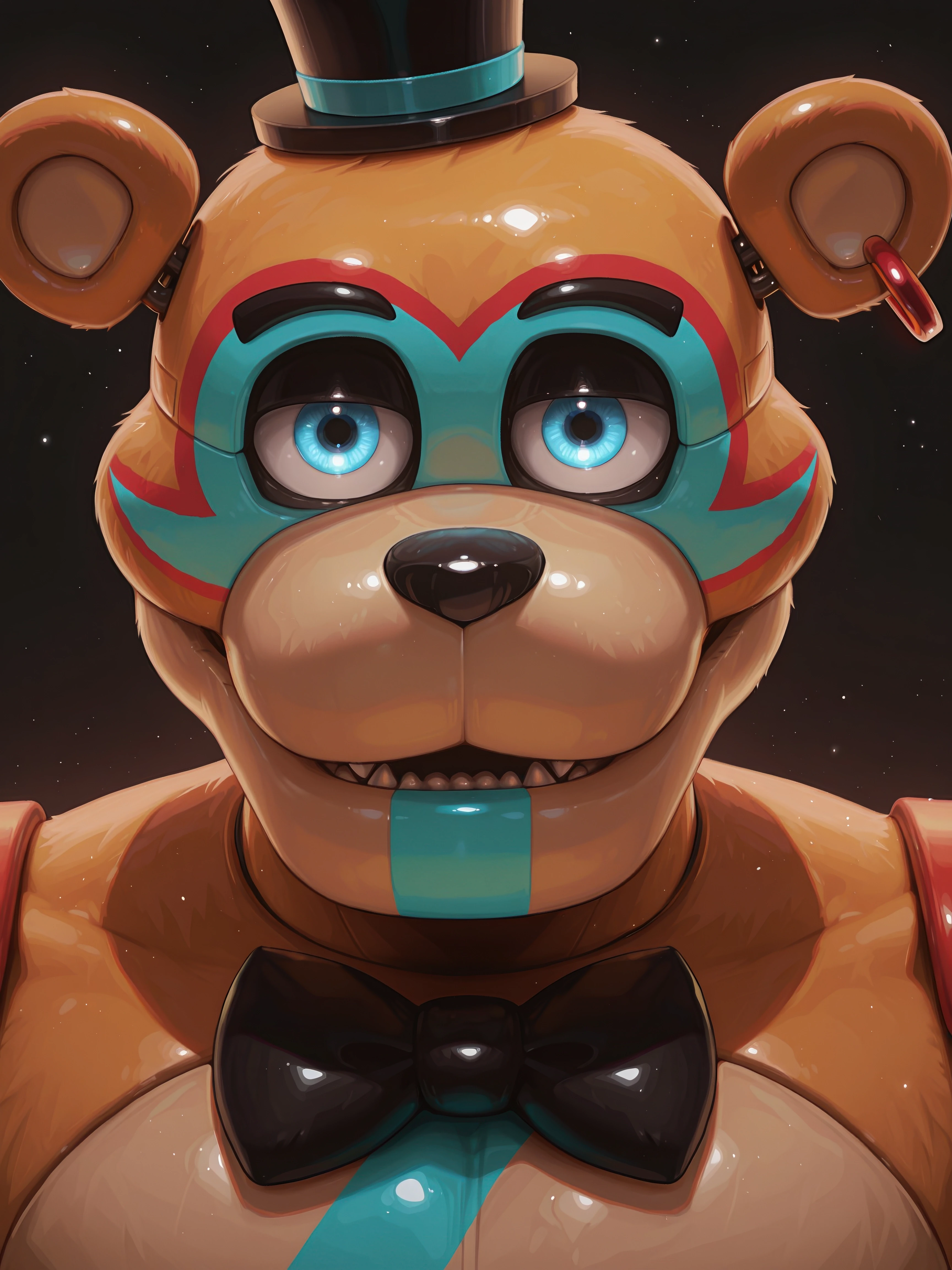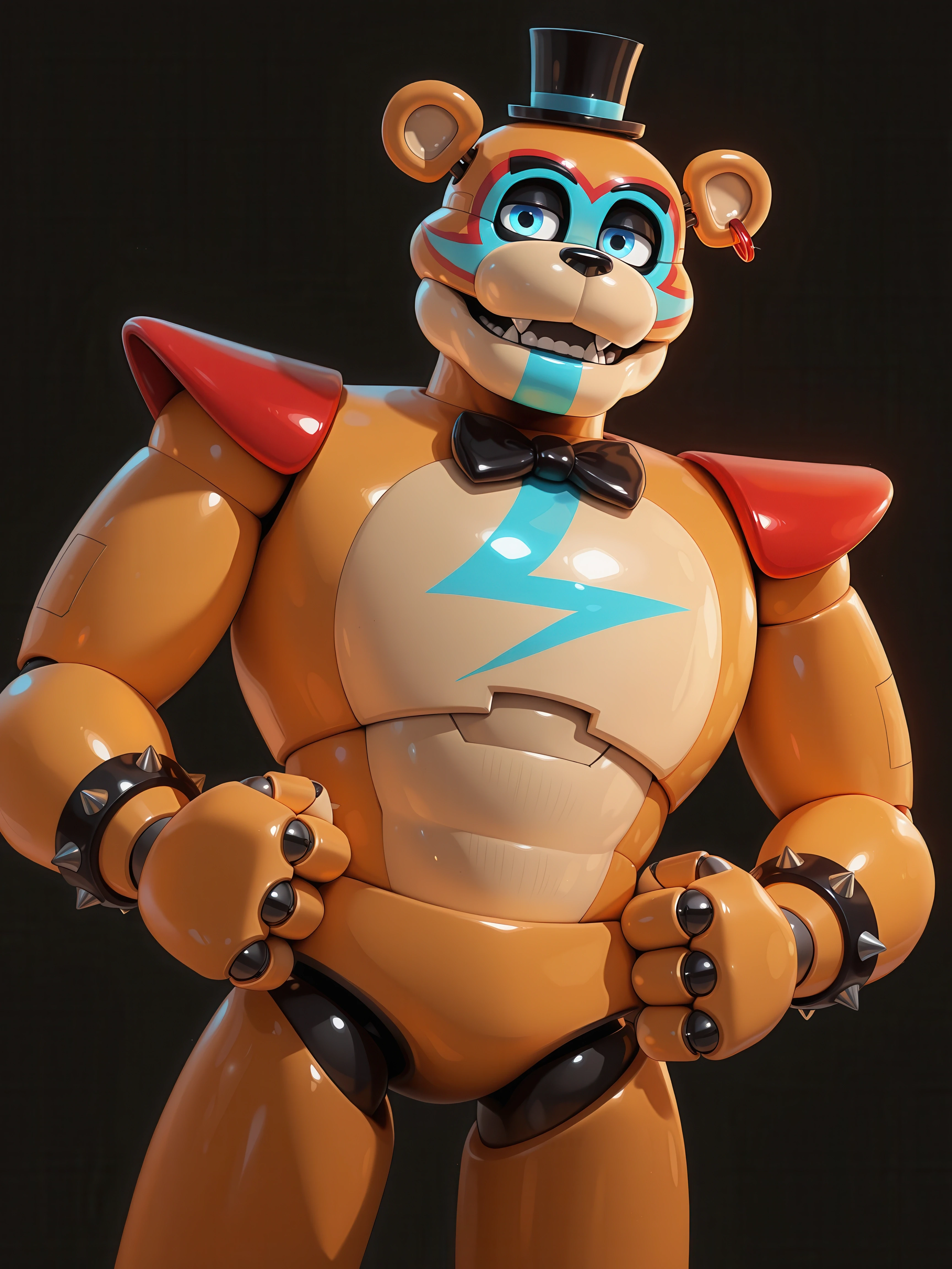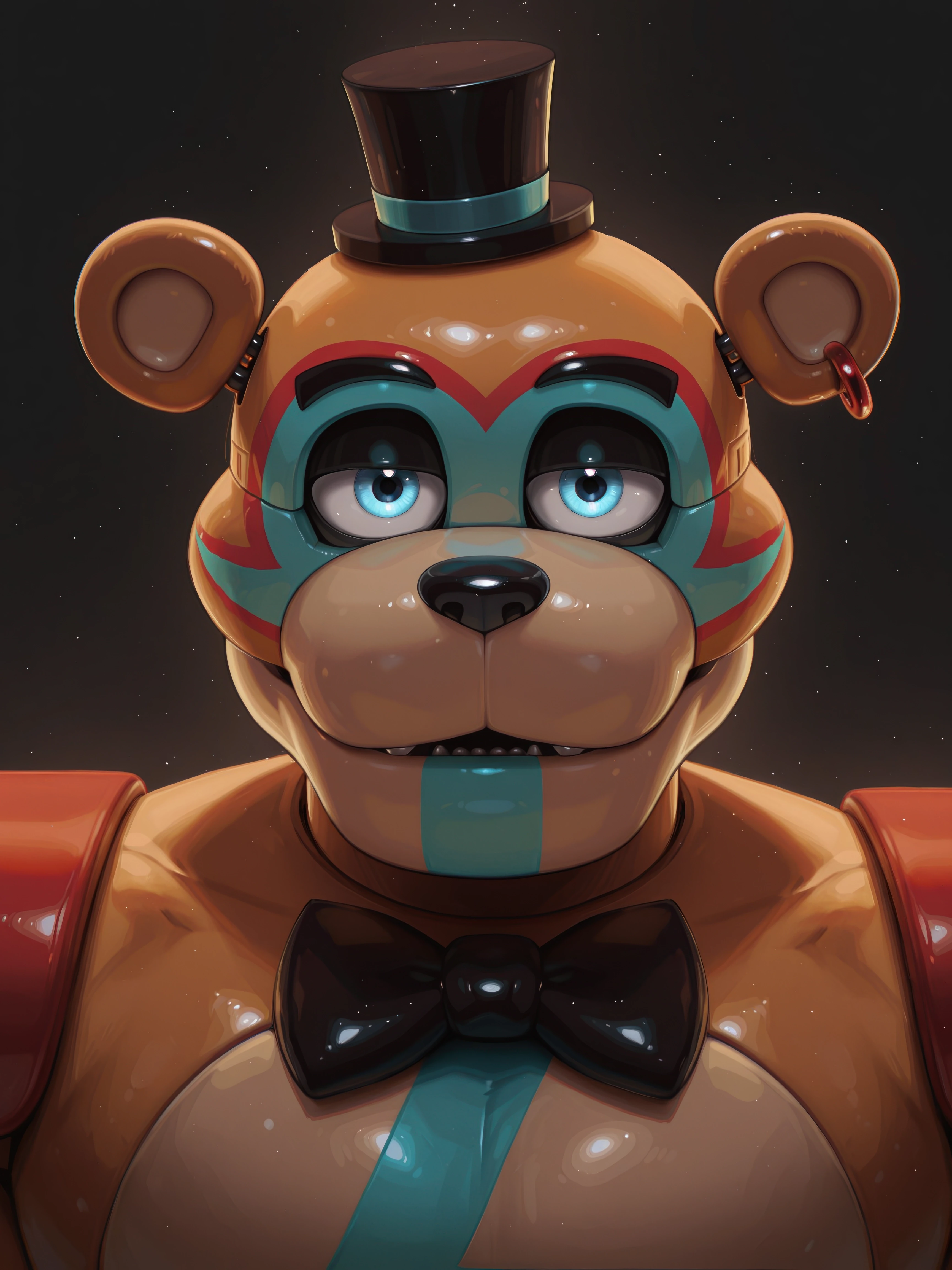 glamrockfreddy, animatronic/furry, blue/yellow/white/purple eyes, earrings, top hat, orange fur(optionaly)
