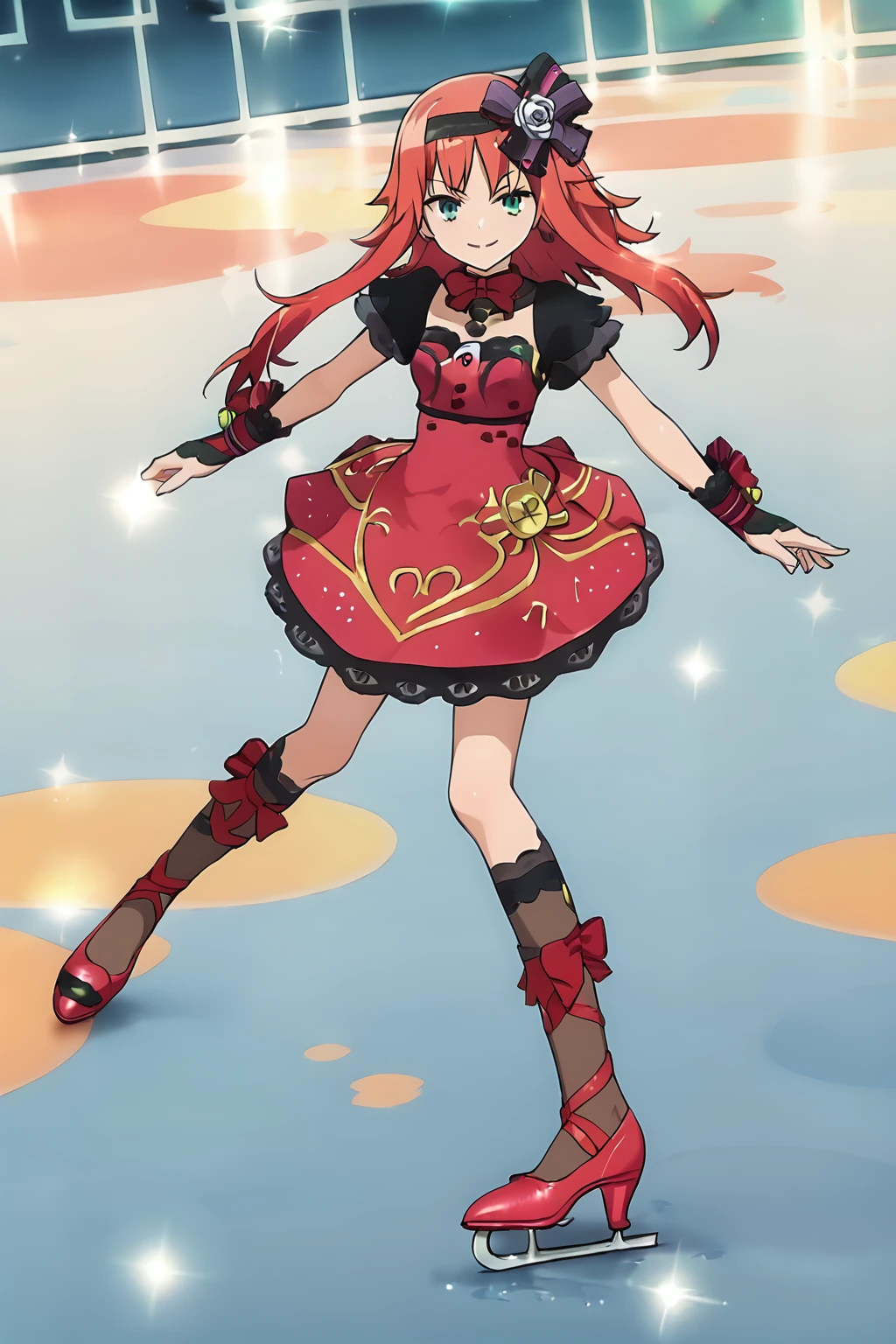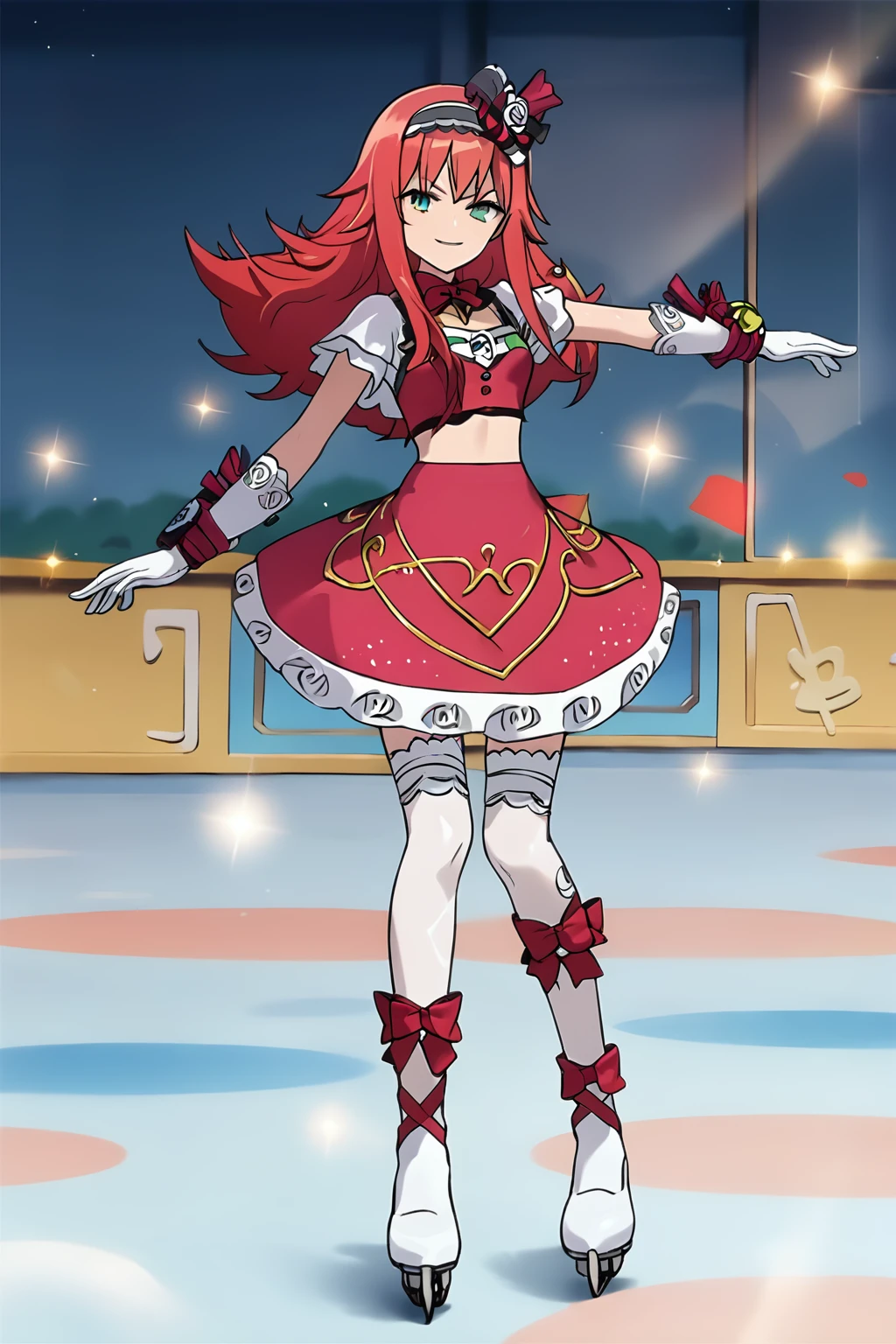 default costume, red boots, black gloves, black thighhighs, ice skating boots