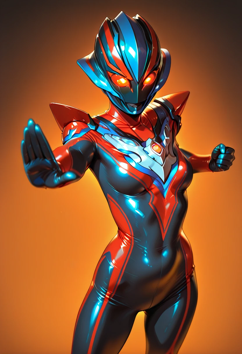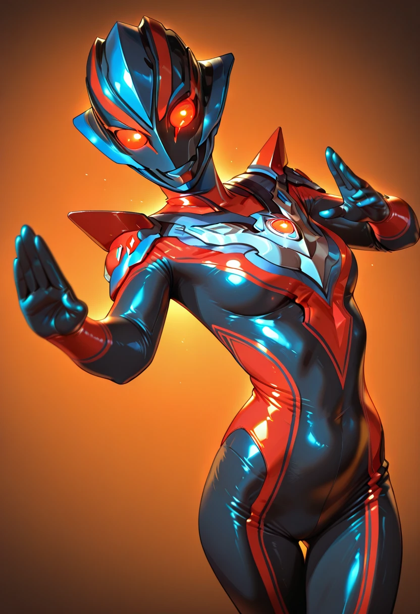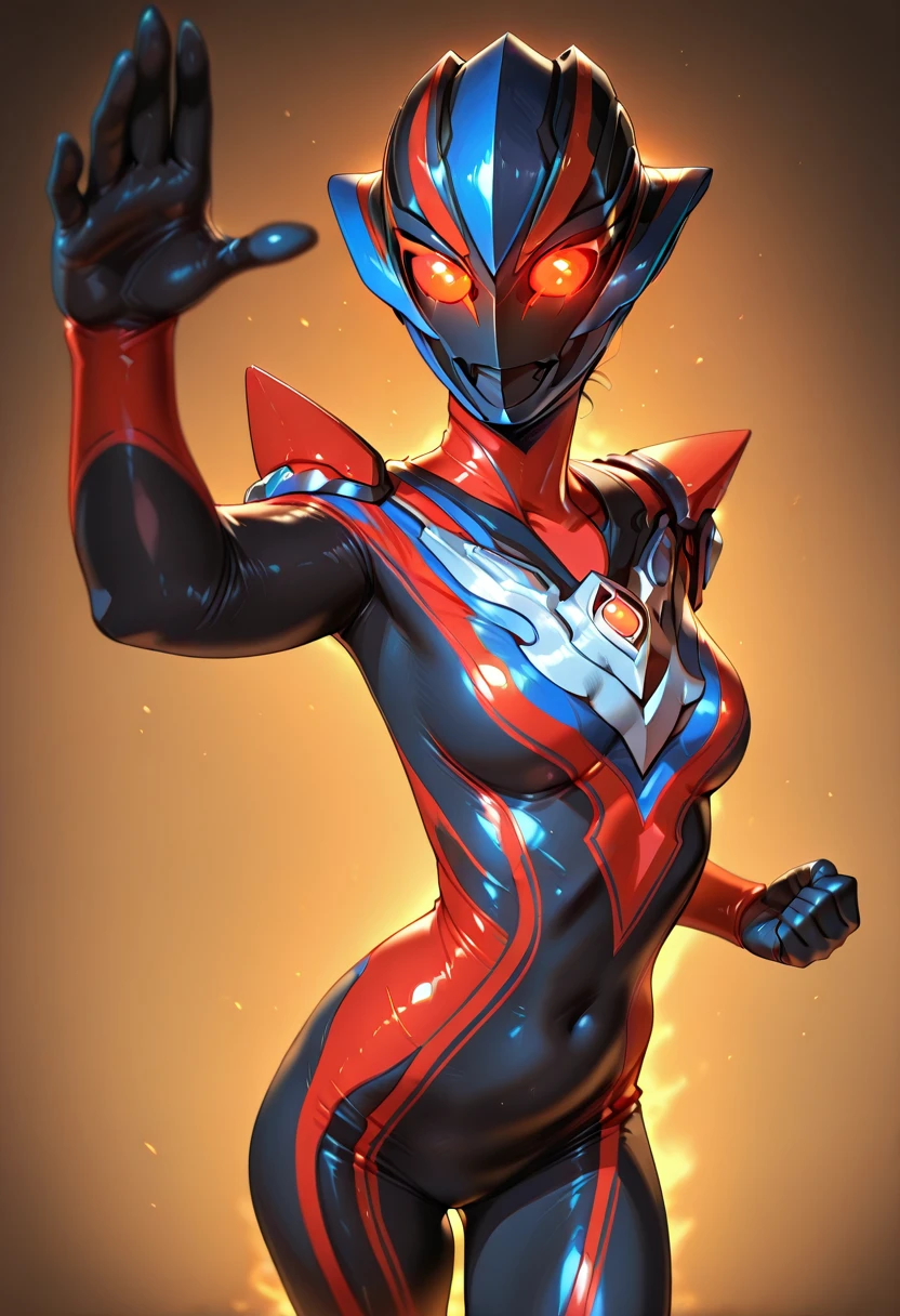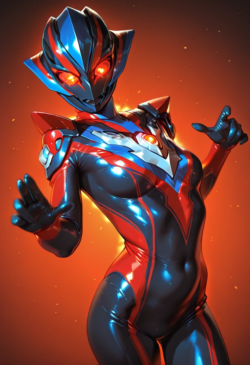 prompt:1girl, tokusatsu, red eyes, helmet, alien, small breasts, black bodysuit, mask, shoulder pads, solo, red chest jewel, glowing eyes, glowing,