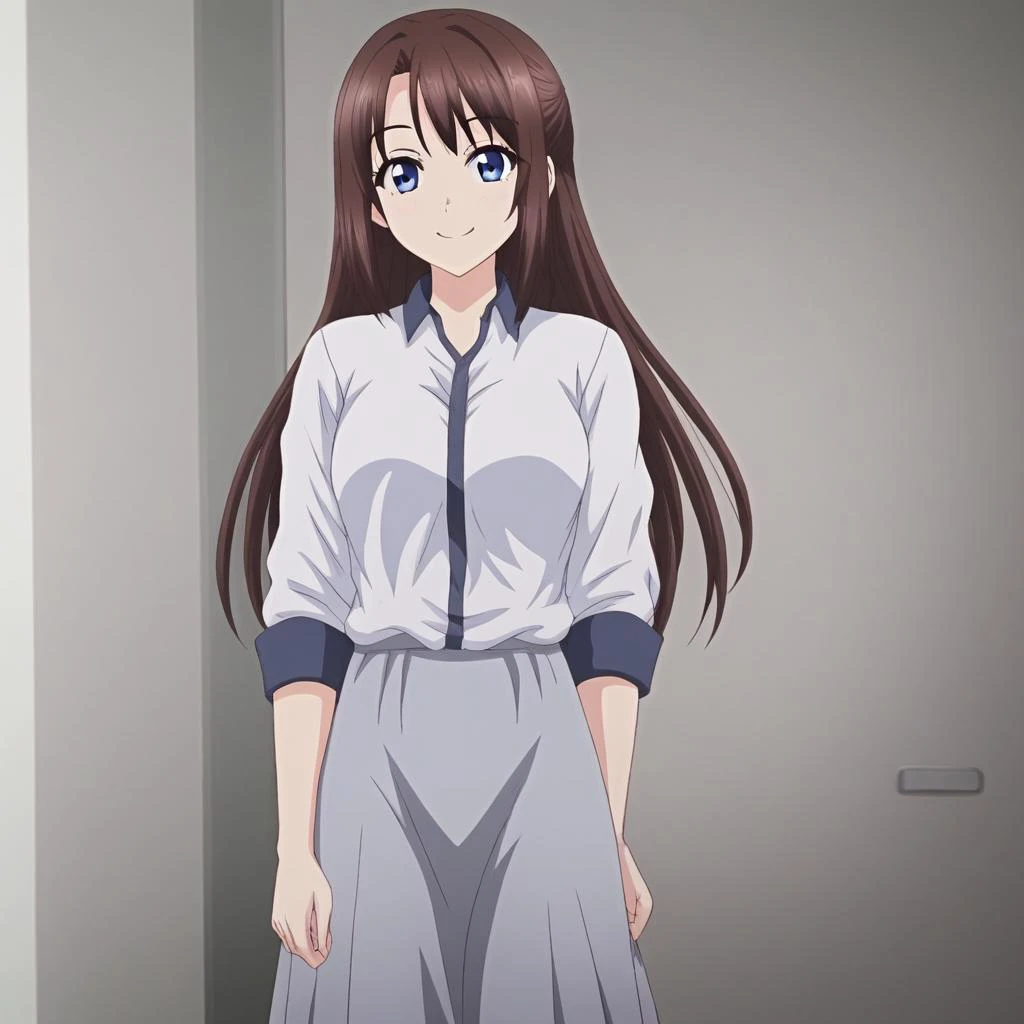 yurina, brown hair, long hair, blue eyes, white shirt, grey skirt, long skirt