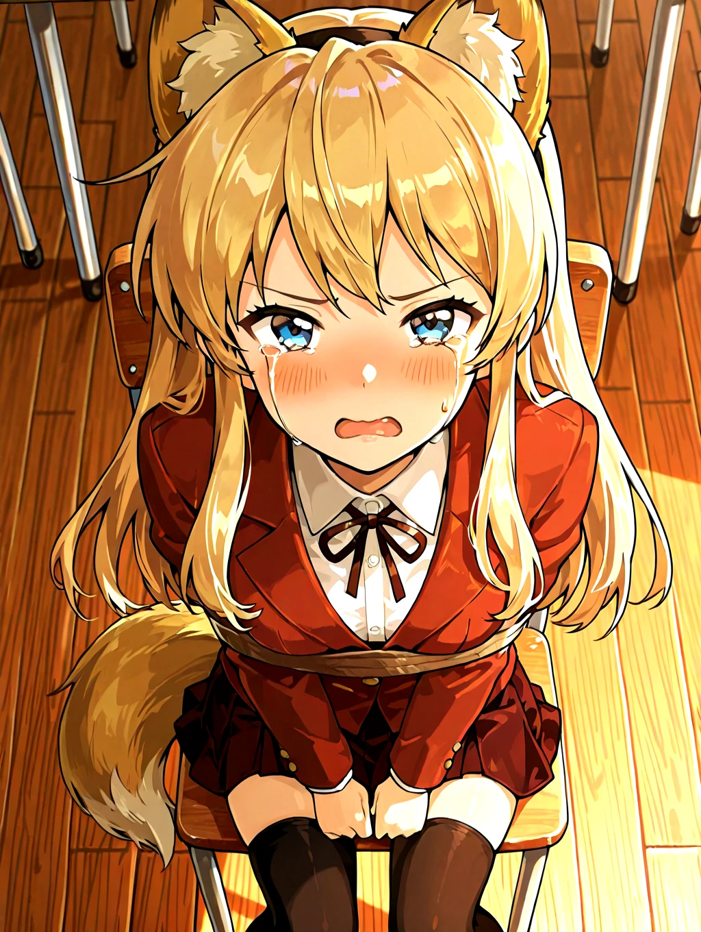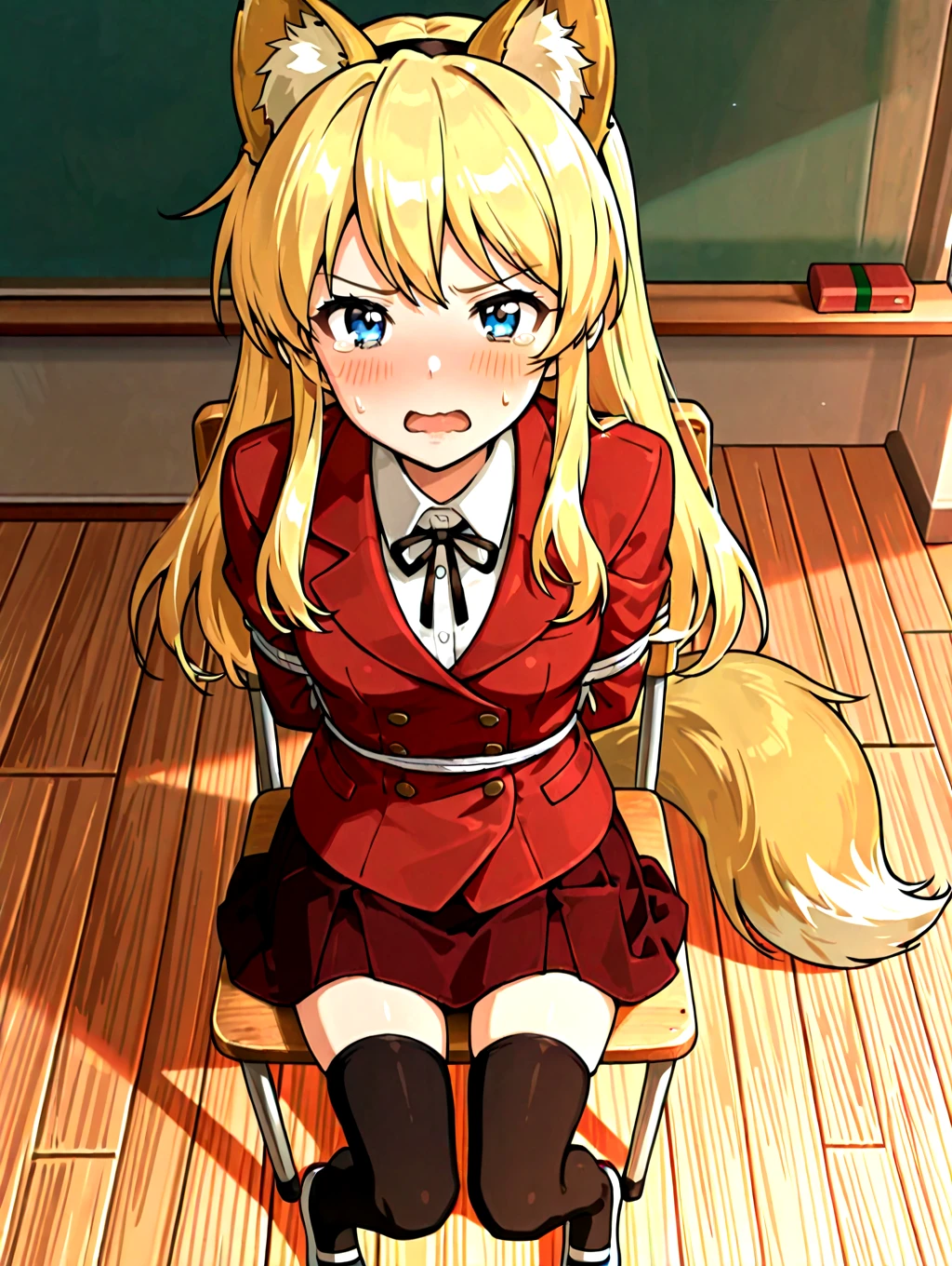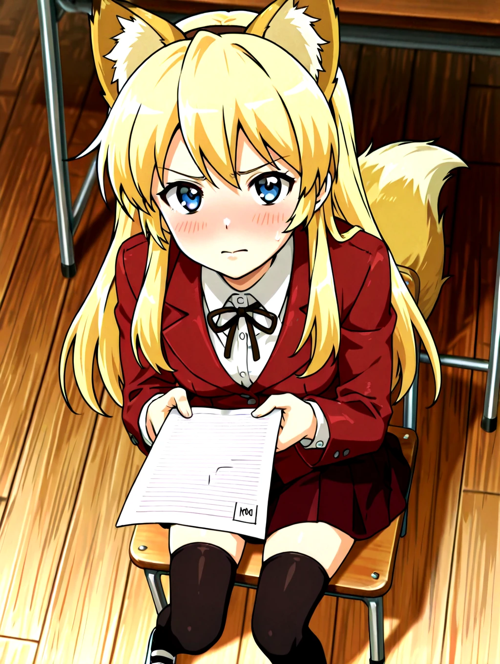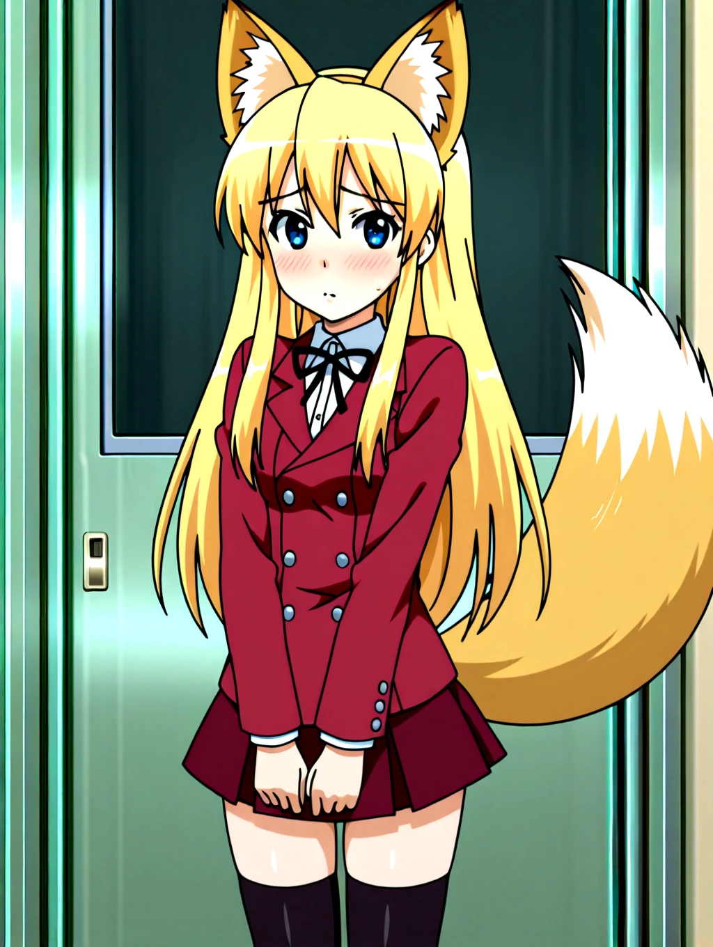 koibitokinenbihimeno,1girl,long hair,blonde hair,red school uniform,solo,blue eyes,shirt,fake fox ears,black thighhighs,dark_red skirt,fox tail,small ,blue uwabaki,black neckthin,