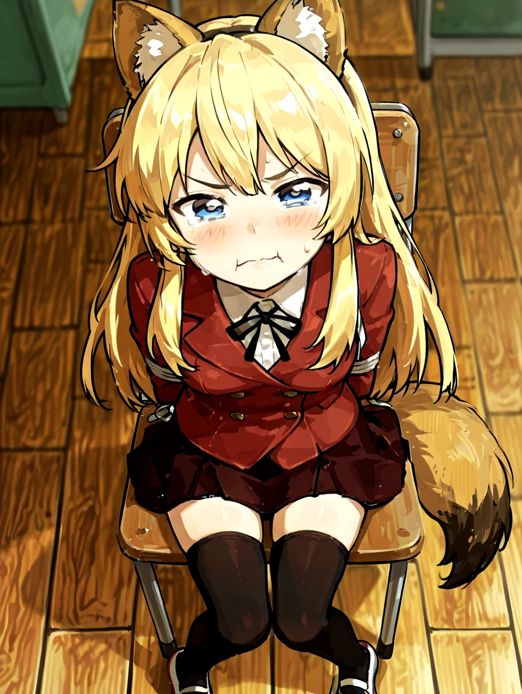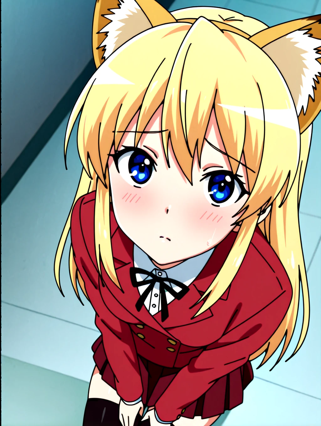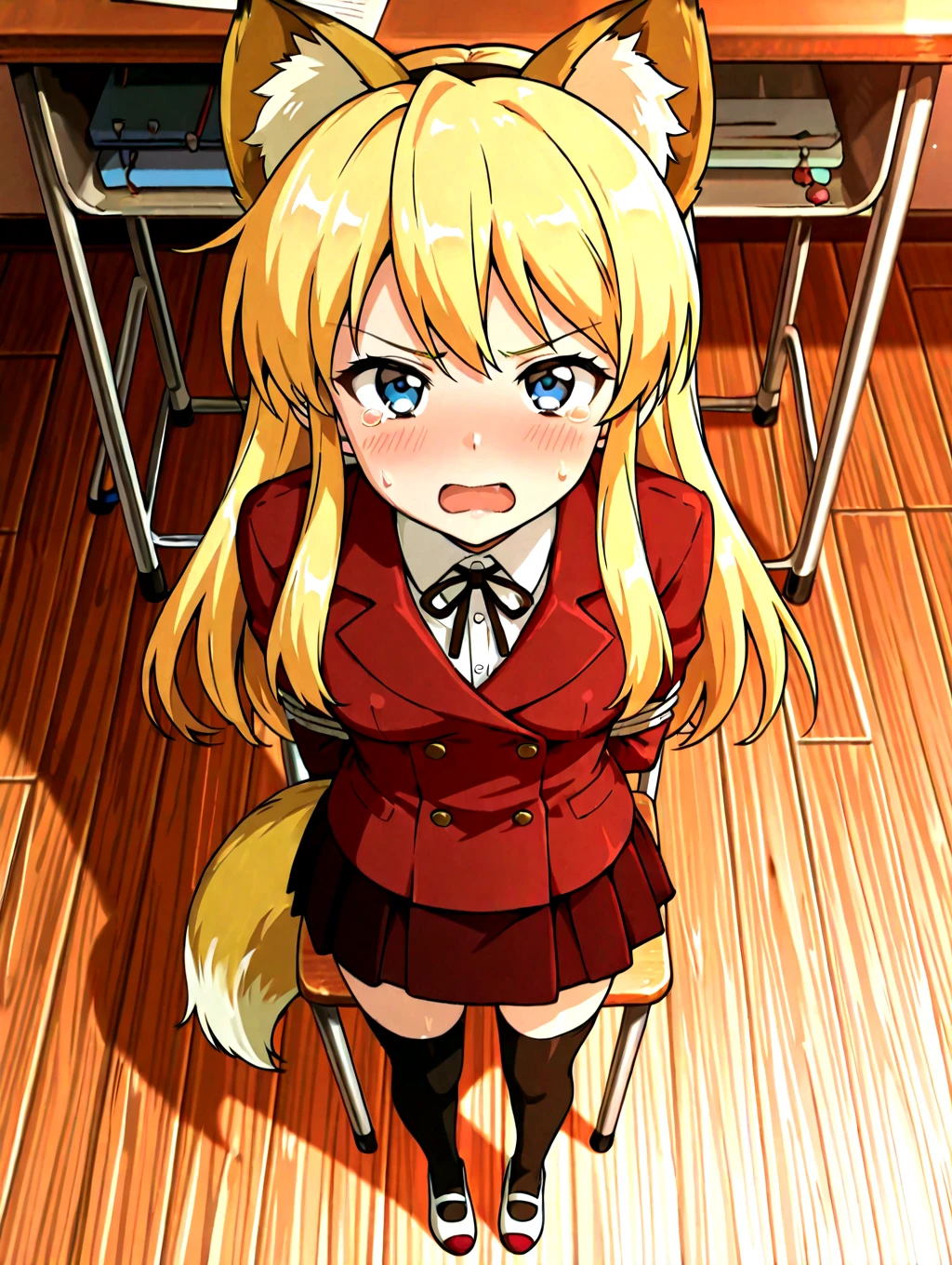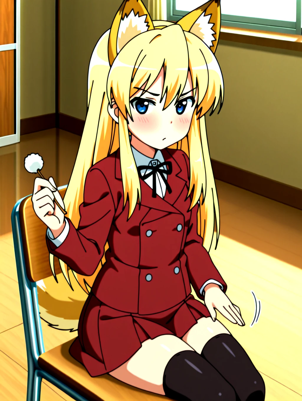 koibitokinenbihimeno,1girl,long hair,blonde hair,red school uniform,solo,blue eyes,shirt,fake fox ears,black thighhighs,dark_red skirt,fox tail,small ,blue uwabaki,black neckthin,