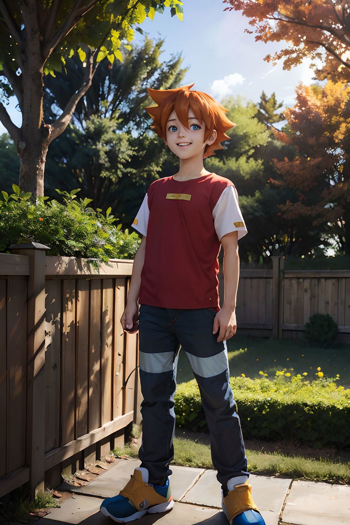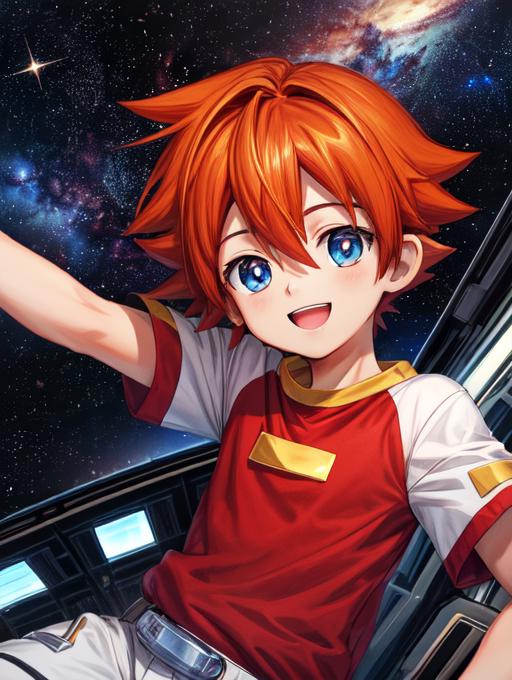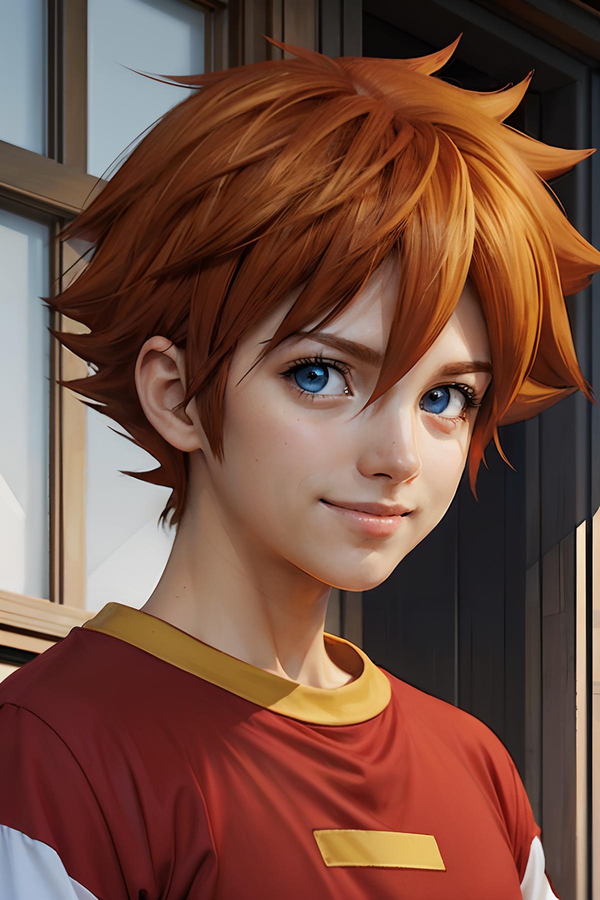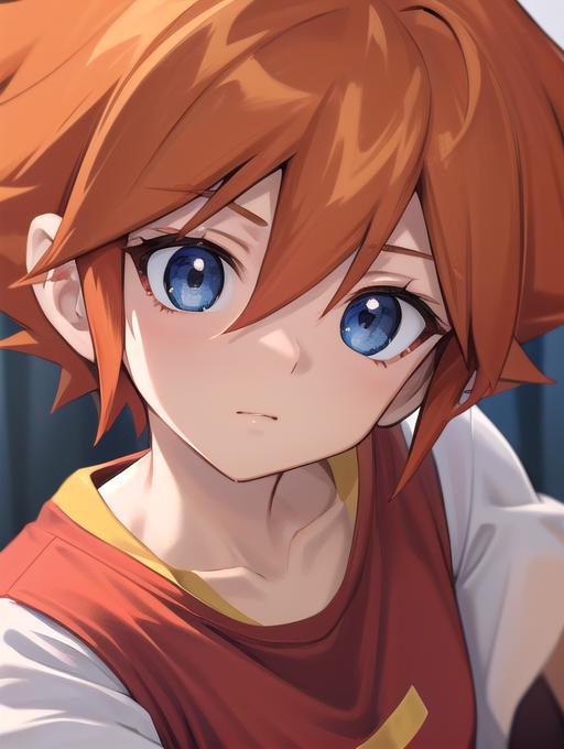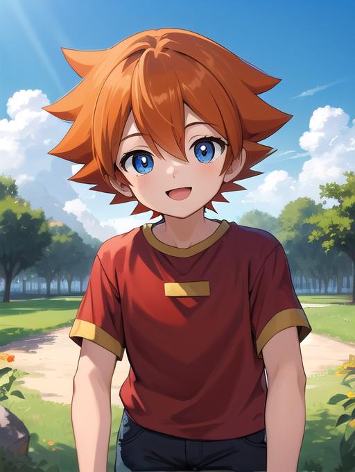 Additional words that may help: red t-shirt with white sleees, orange hair, spiked hair, blue eyes, white sleeves, male child