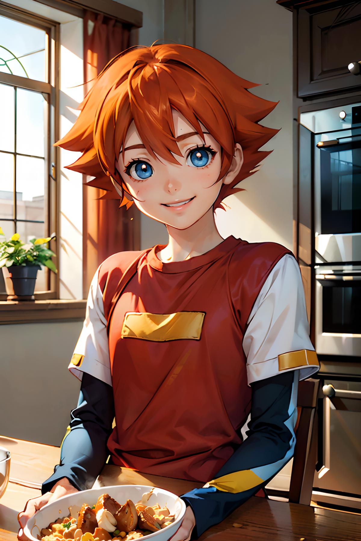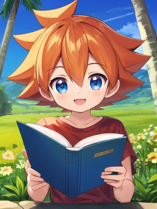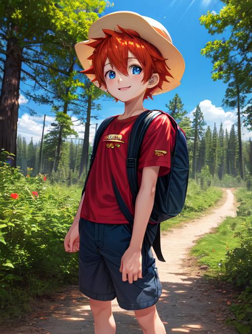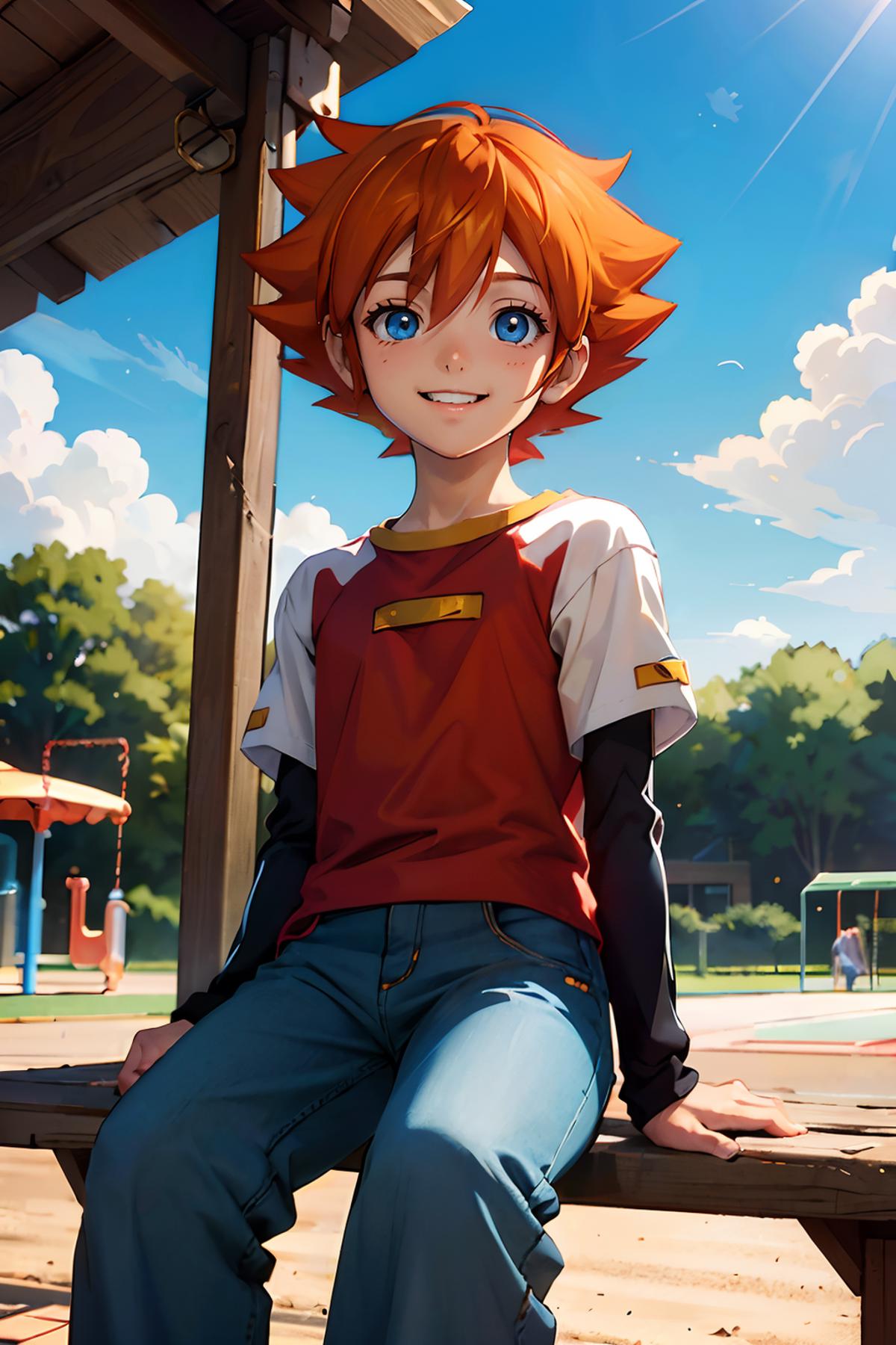 Additional words that may help: red t-shirt with white sleees, orange hair, spiked hair, blue eyes, white sleeves, male child