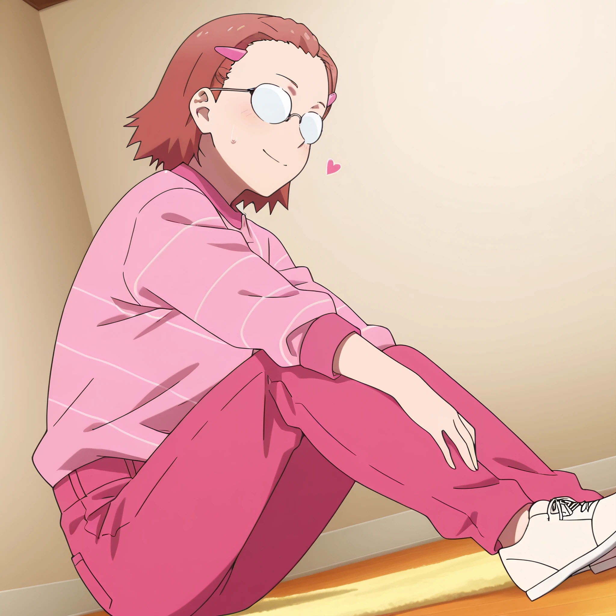 HinakoPink, shirt, pink shirt, long sleeves, pants, asymmetrical bangs,