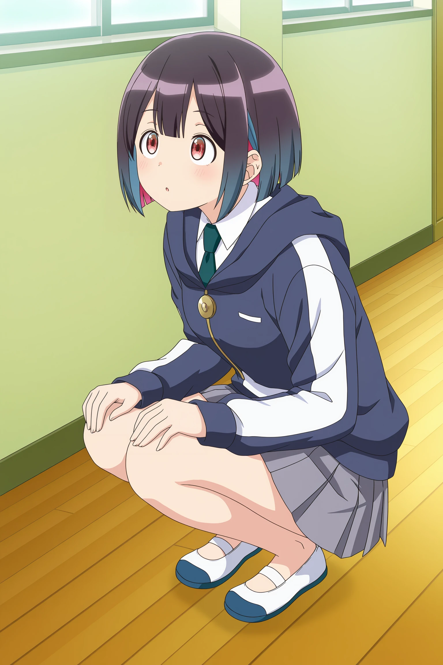 green necktie,white footwear,blue jacket,drawstring,blue hoodie,no socks,hood down,grey skirt,white shirt,---------------------->
