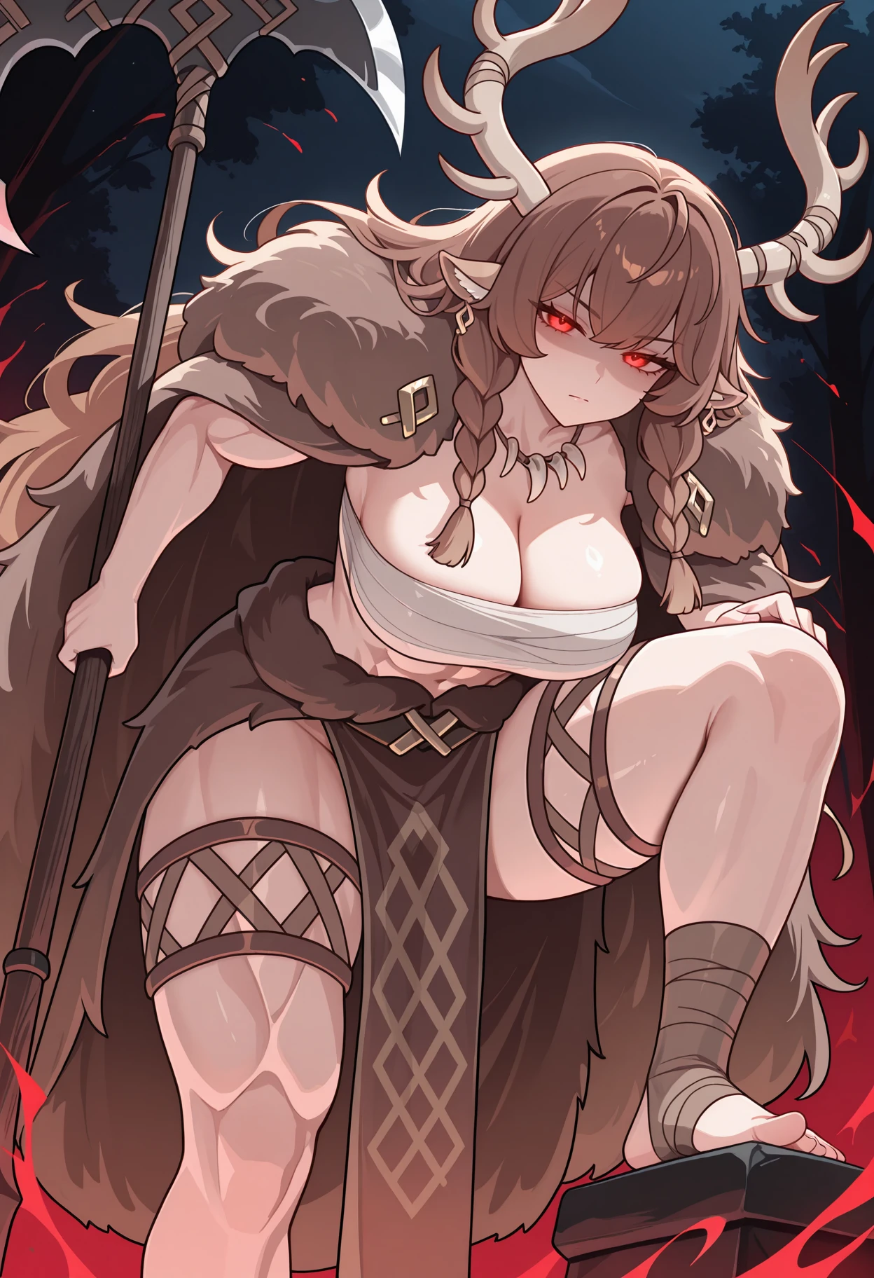 fur cloak, brown cloak, bandaged horn, chest sarashi, twin braids, messy hair, cleavage, tooth necklace, earrings, twin braids, loincloth, clothes around waist, pelvic curtain, brown thighlet, ankle wrap,