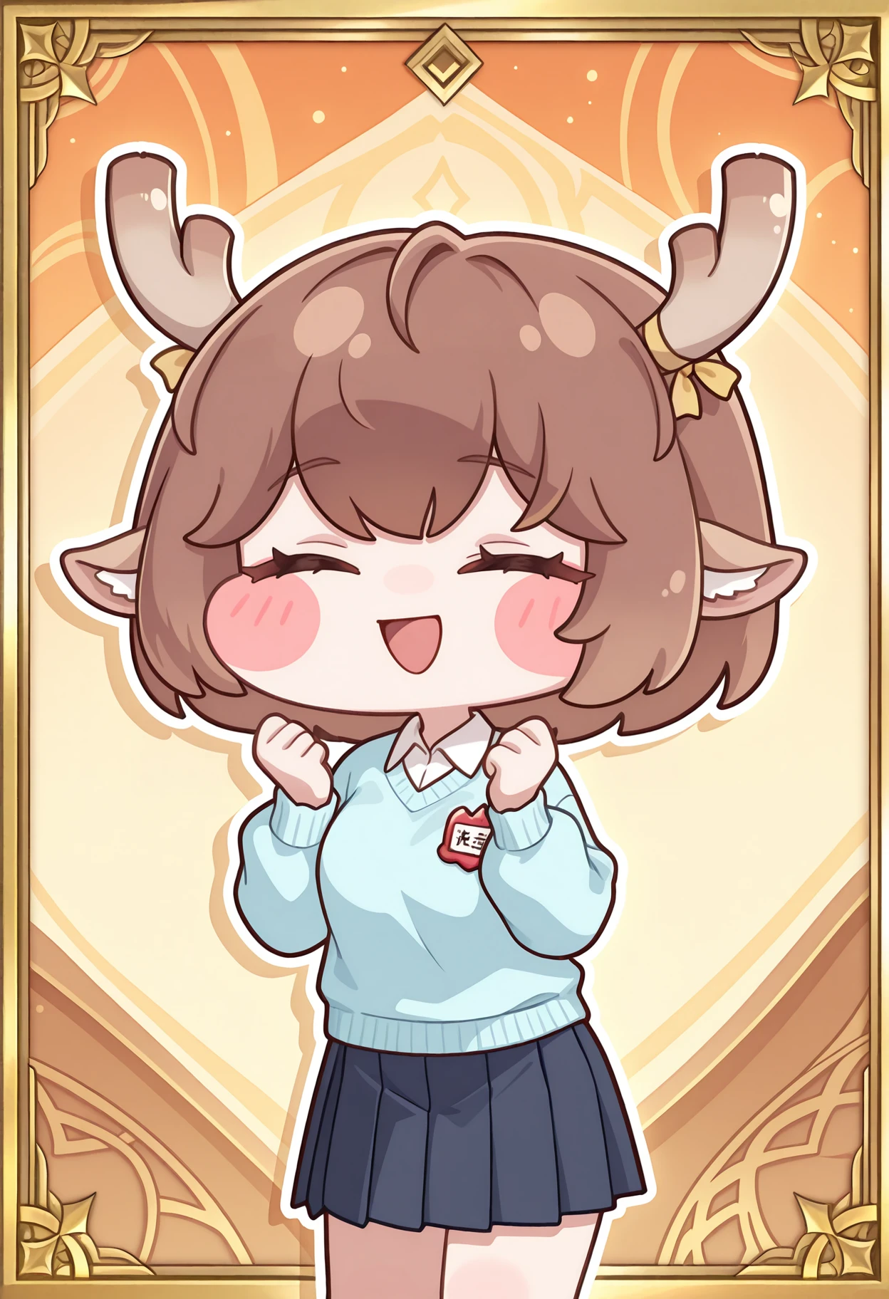 short hair, horn ribbon, yellow ribbon, light blue sweater, long sleeves, name tag, collared shirt, pleated skirt, blue skirt,