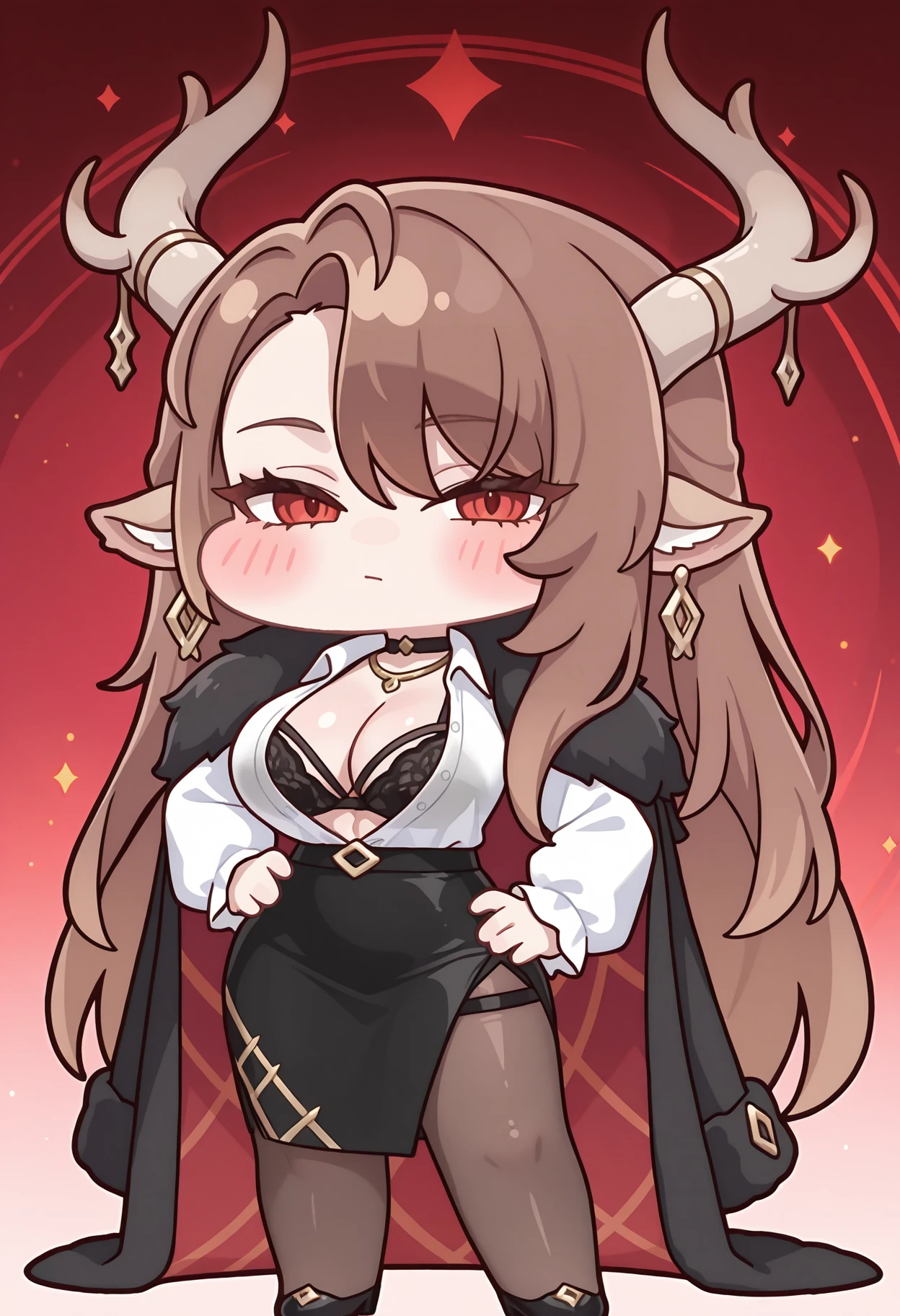 two-sided coat, asymmetrical bangs, horn ornament, demon horns, earrings, black coat, coat on shoulders, black choker, gold necklace, white shirt, long sleeves, collared shirt, open shirt, multi-strapped bra, black bra, pencil skirt, black skirt, side slit, brown pantyhose,