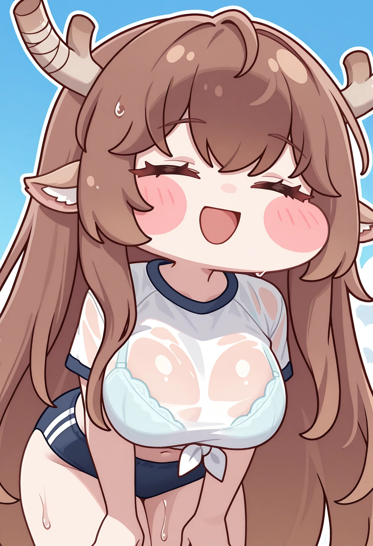 trcldia, very long hair, brown hair, closed eyes, deer ears, deer girl, broken horns, large breasts,