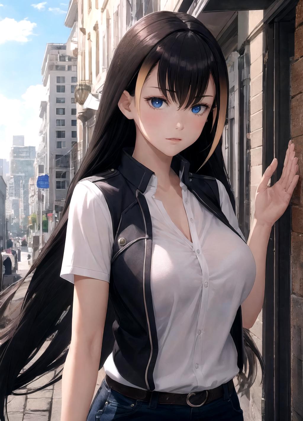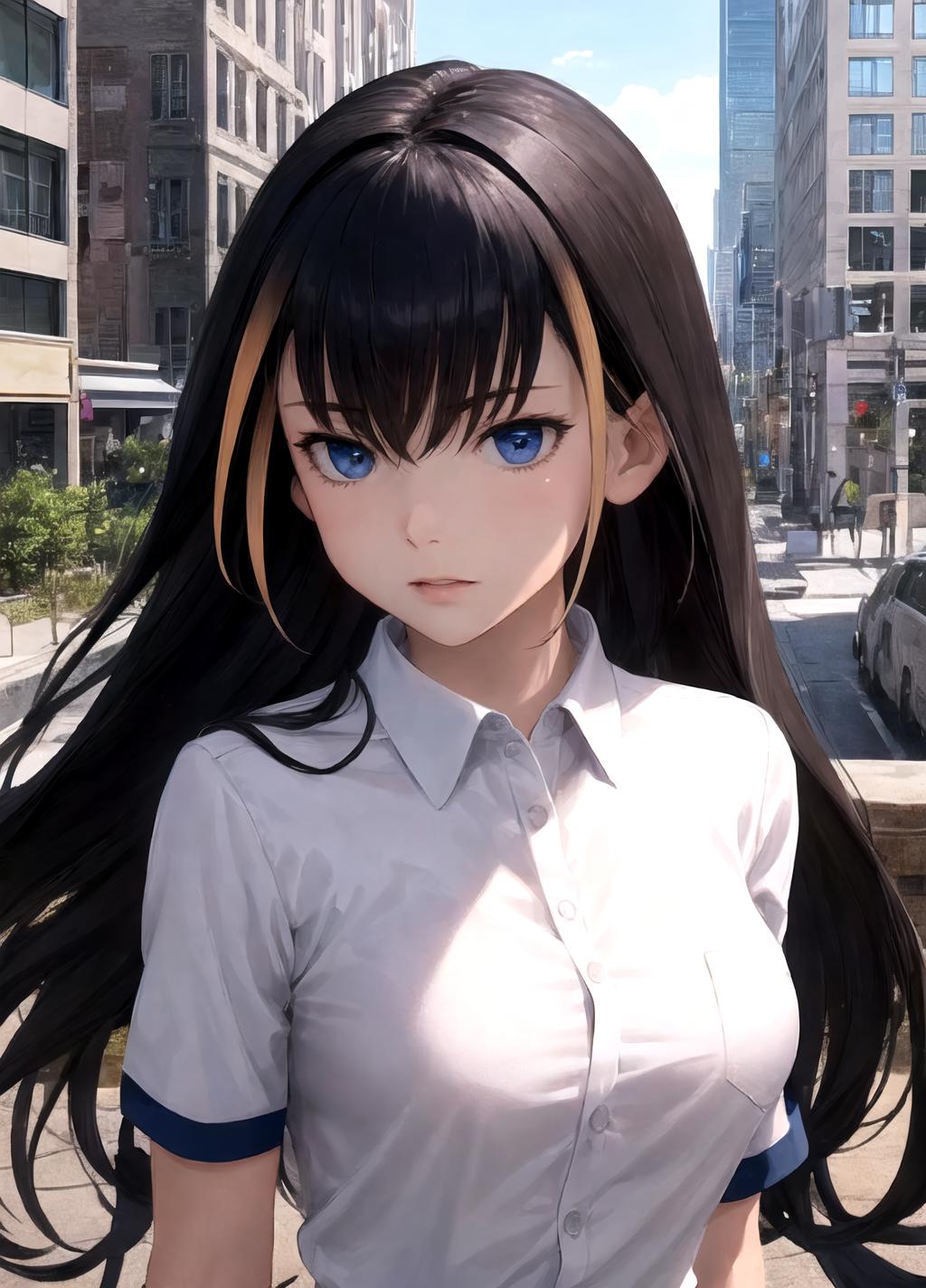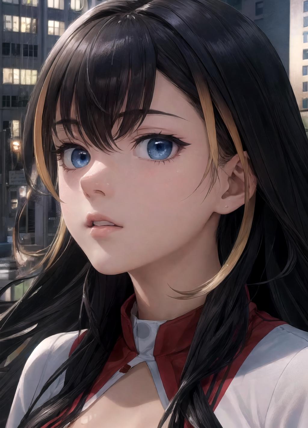I recommended for use next promts: <lora:Lessar:1>, multicolored hair, black hair, very long hair, blue eyes, Lessar, jacket, pink hairband, mechanical tail, tail