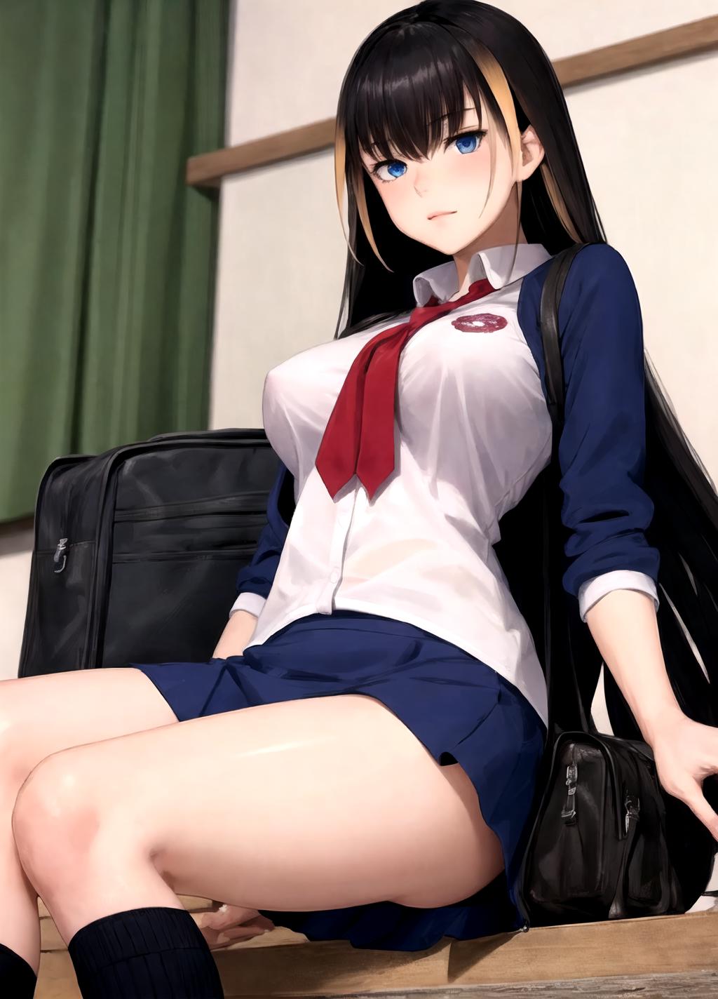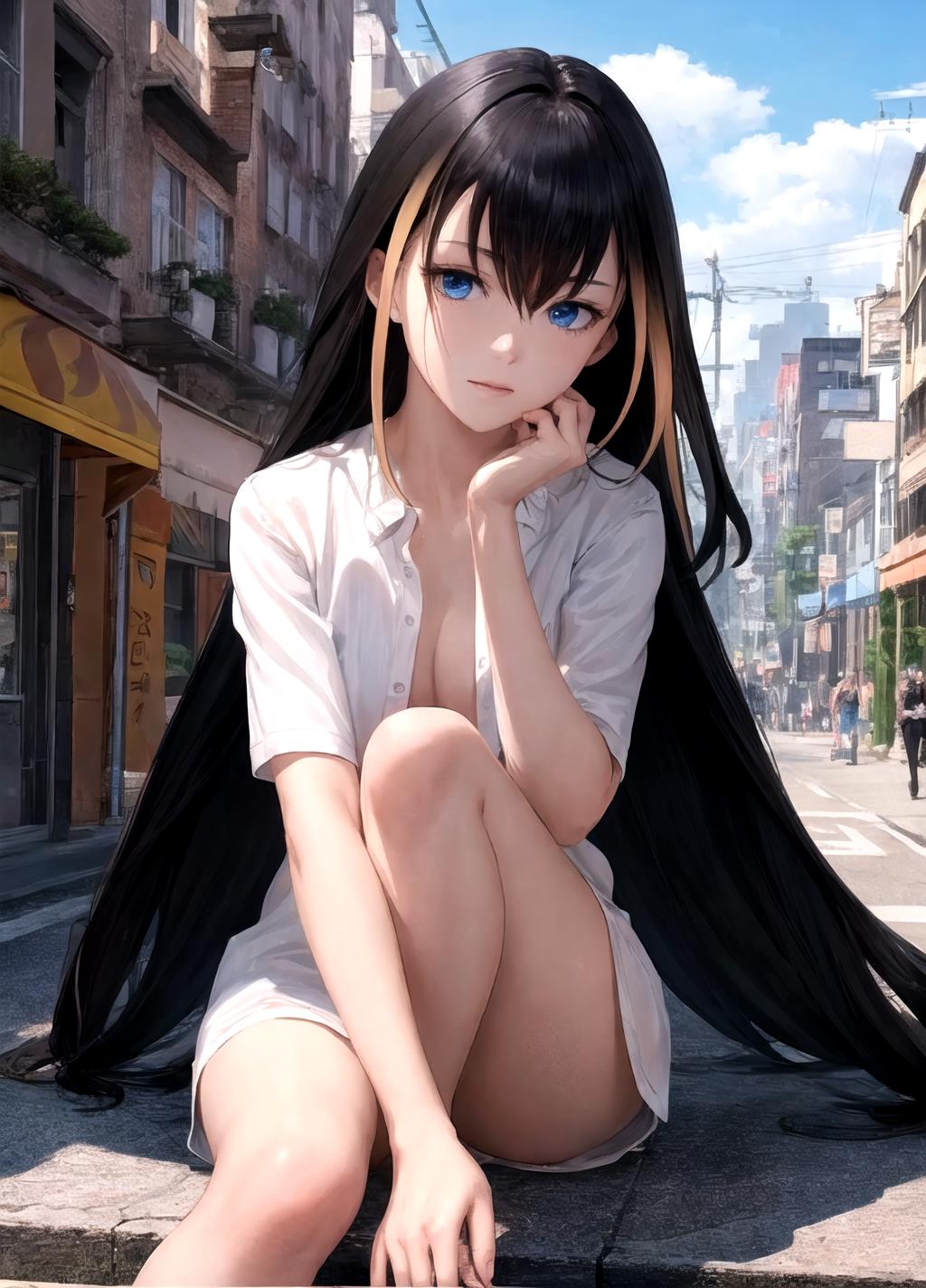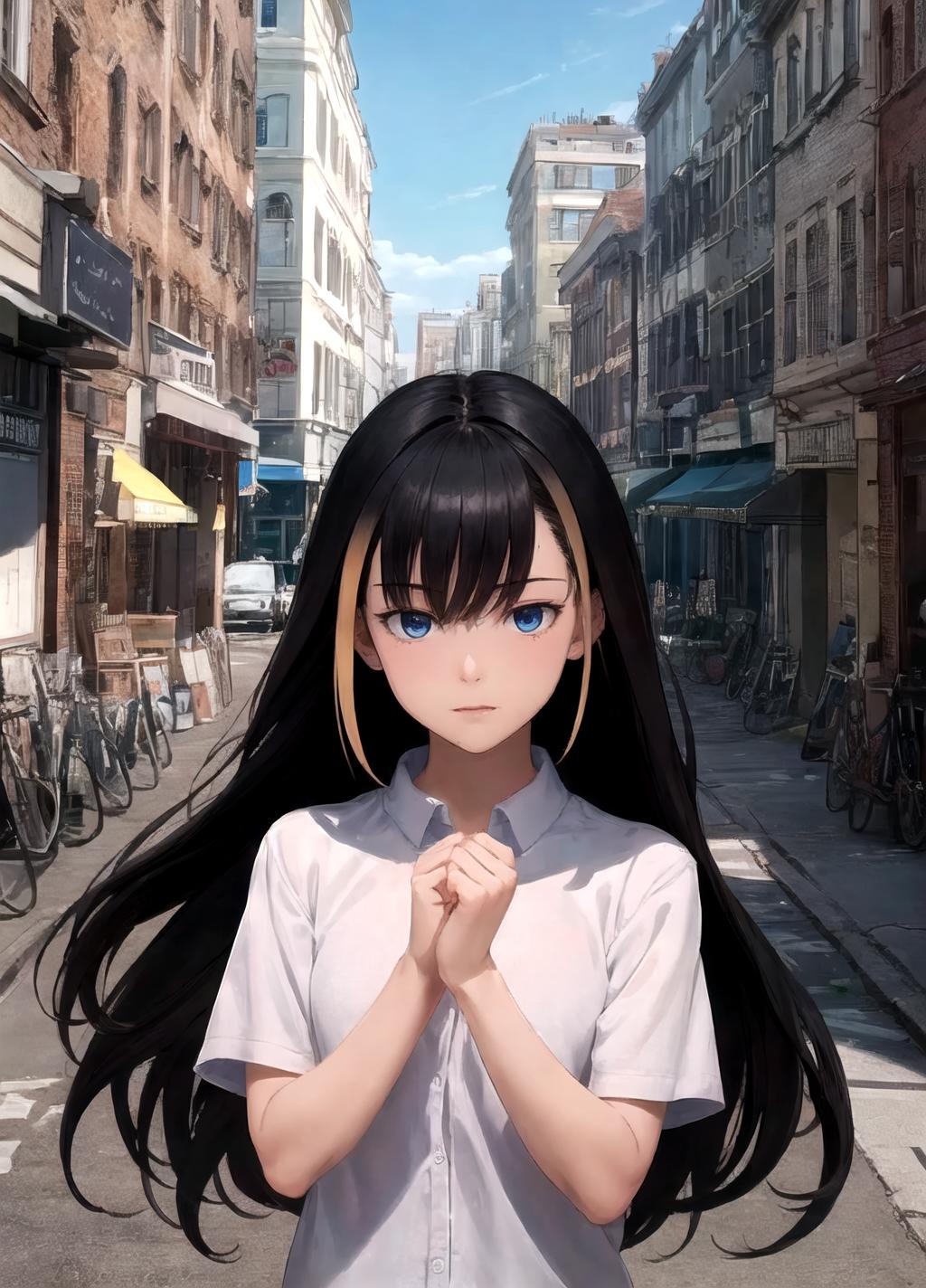 I recommended for use next promts: <lora:Lessar:1>, multicolored hair, black hair, very long hair, blue eyes, Lessar, jacket, pink hairband, mechanical tail, tail
