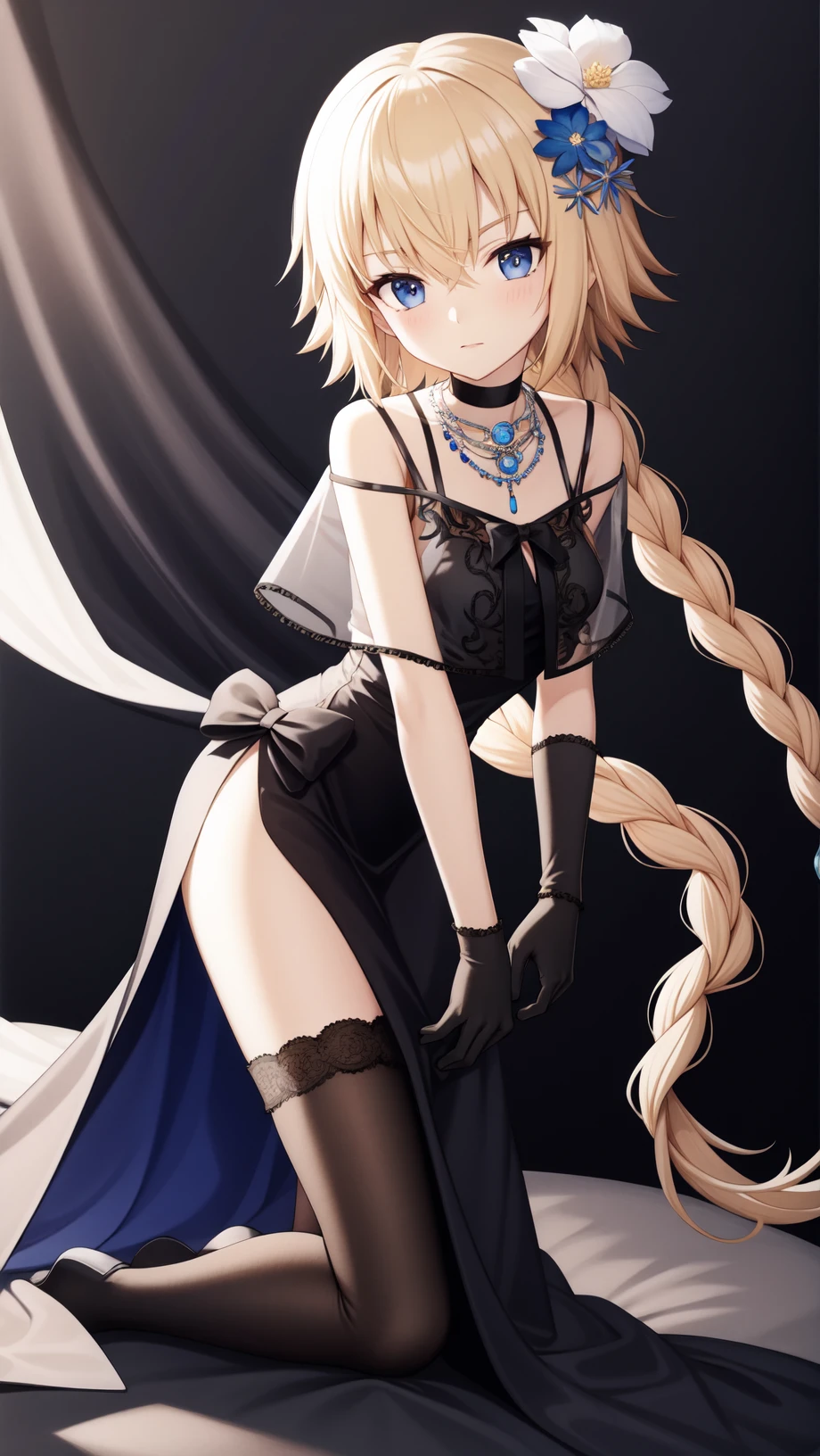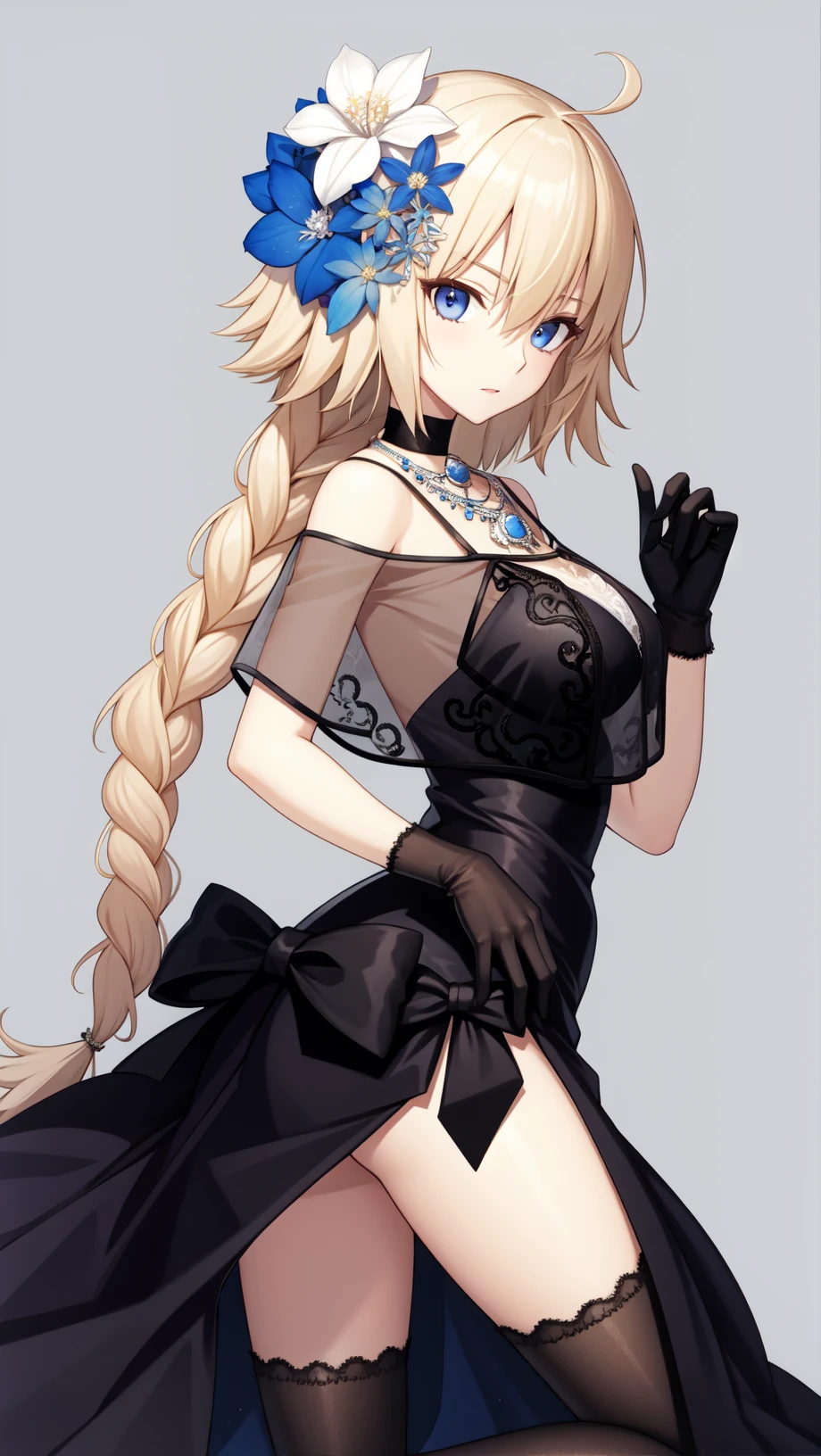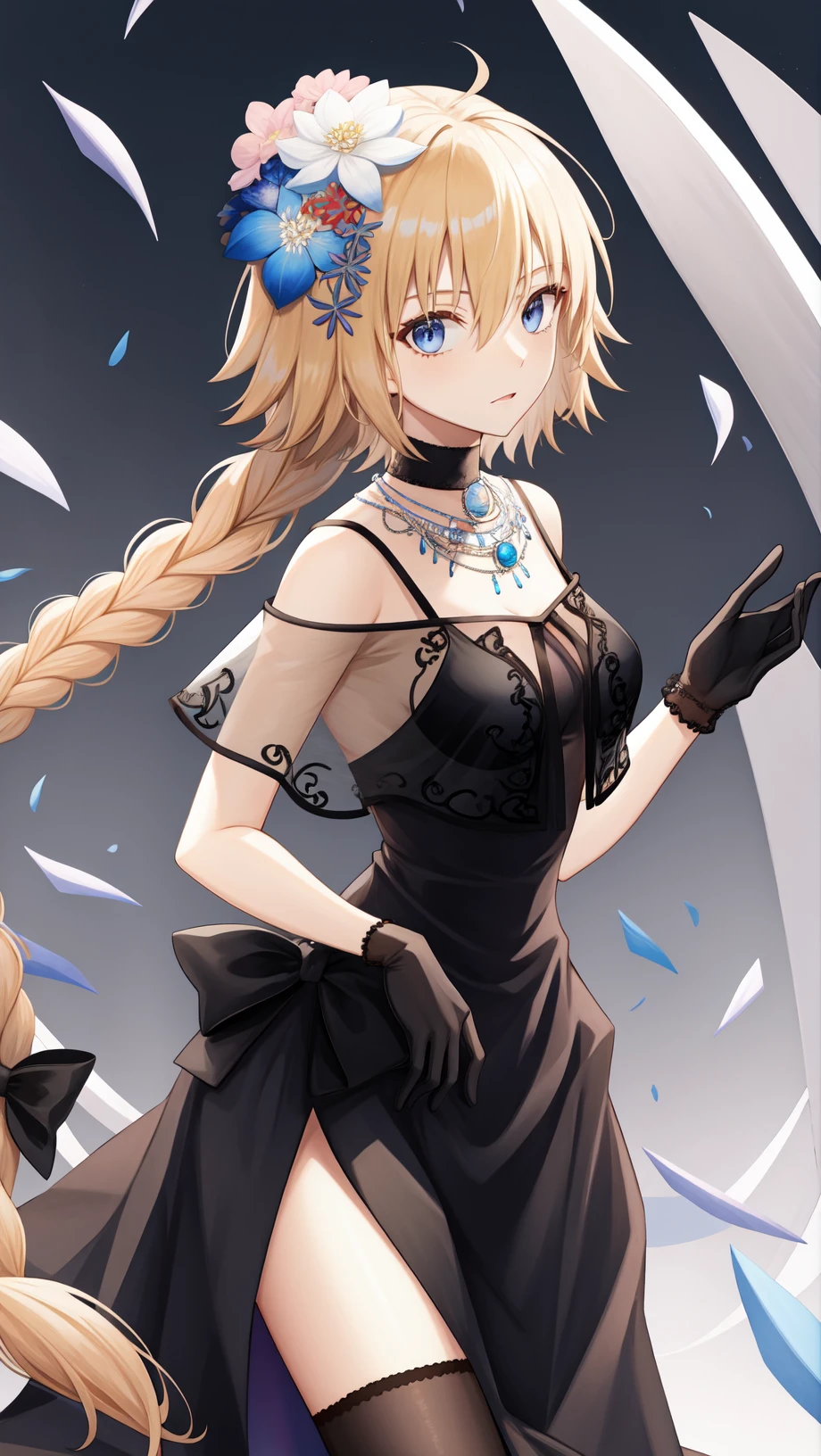 jeanne_d'arc_\(fate\),blonde_hair,hair_flower,black_dress,black_gloves,blue_eyes,thighhighs,hair_ornament,gloves,black_thighhighs,braid,very_long_hair,sleeveless_dress,sleeveless,looking_at_viewer,choker,single braid,collarbone,black_bow,hair_between_eyes,hair_bow,necklace,jewelry,ribbon,white_flower,blue_flower,closed_mouth,bangs,black capelet,