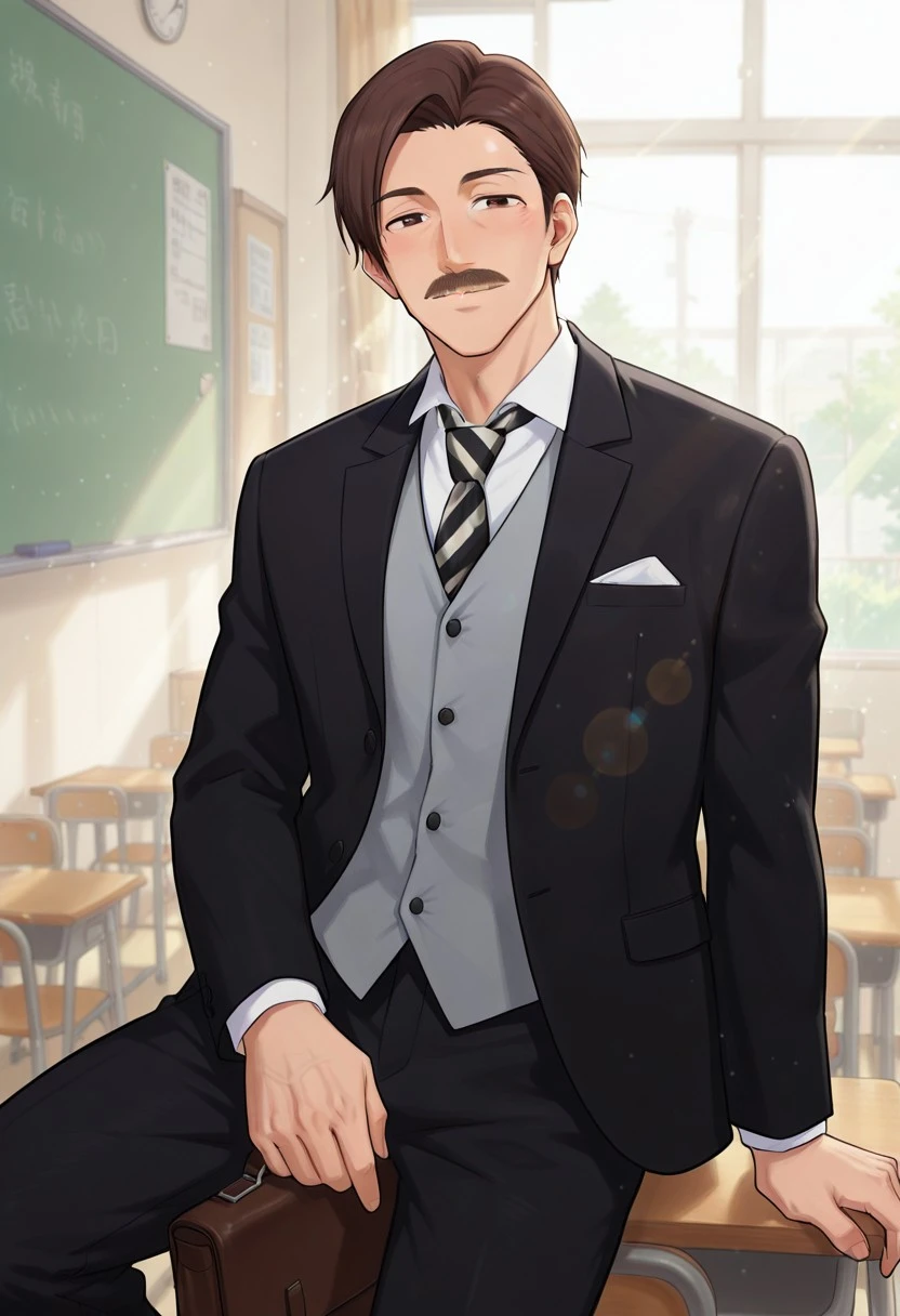 <lora:Father Kirisu BWBGD-V1>,FatherKirisuBWBGD, Mature man, brown hair, short hair, mustache, brown mustache, brown eyes,