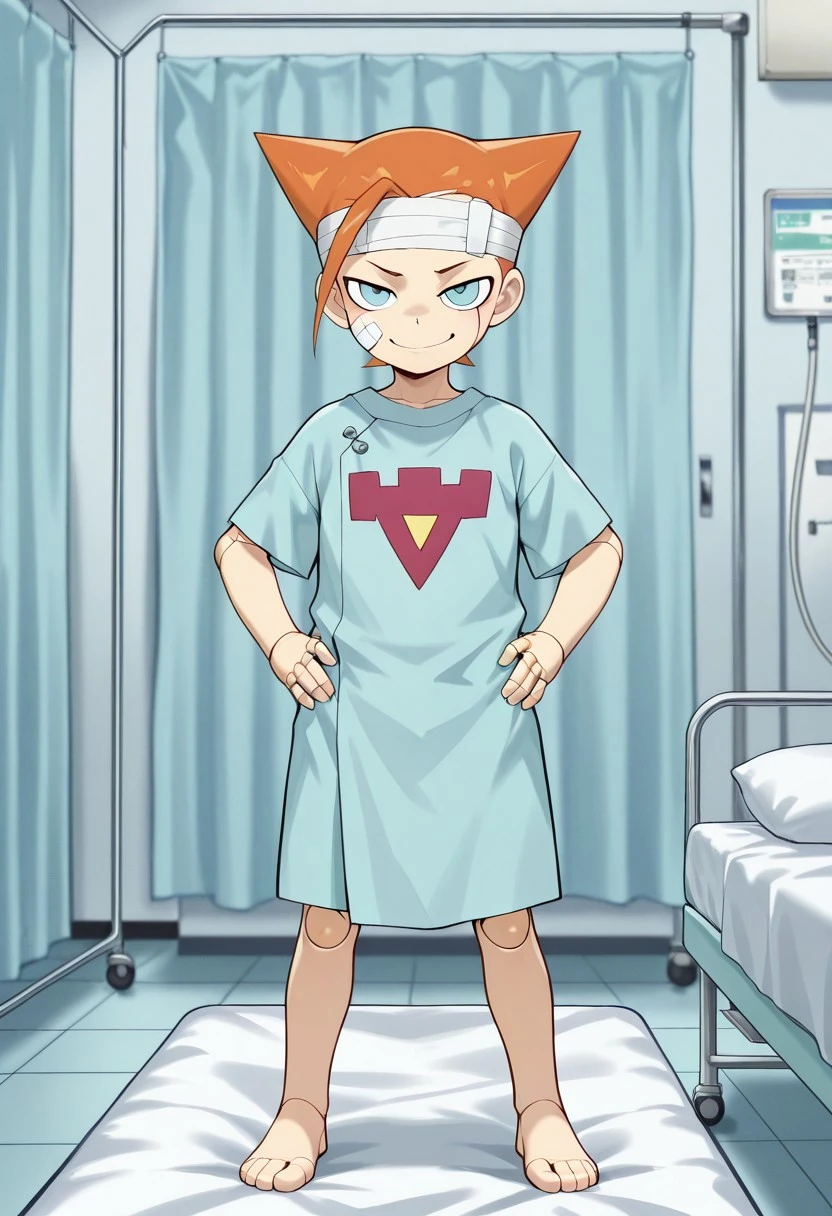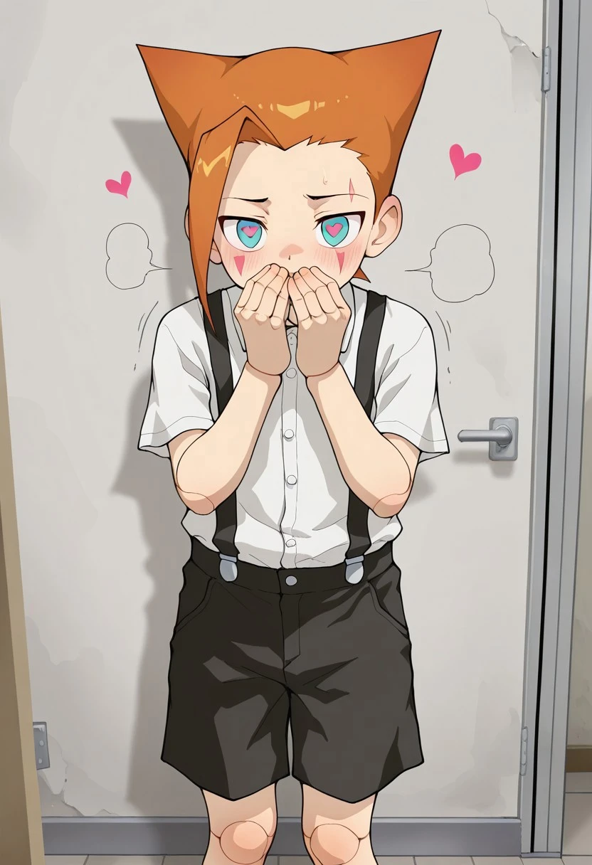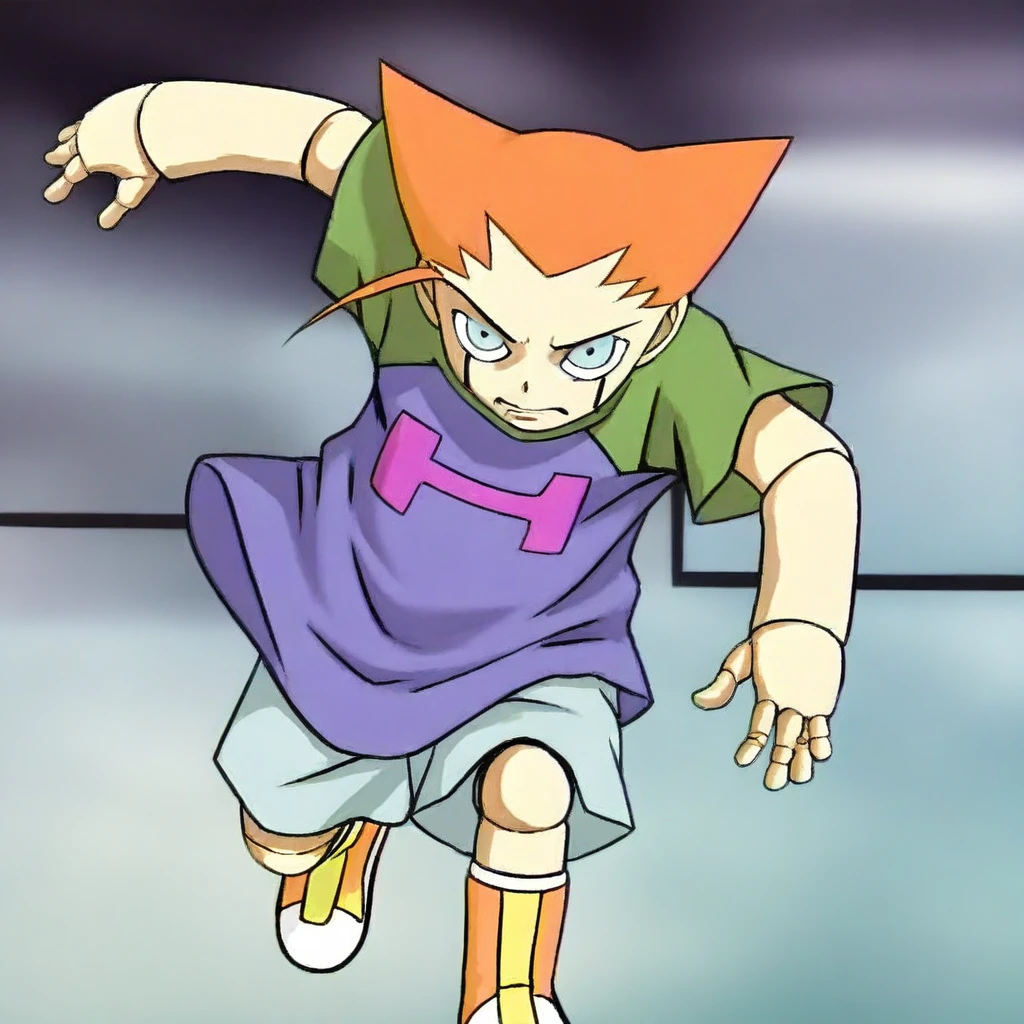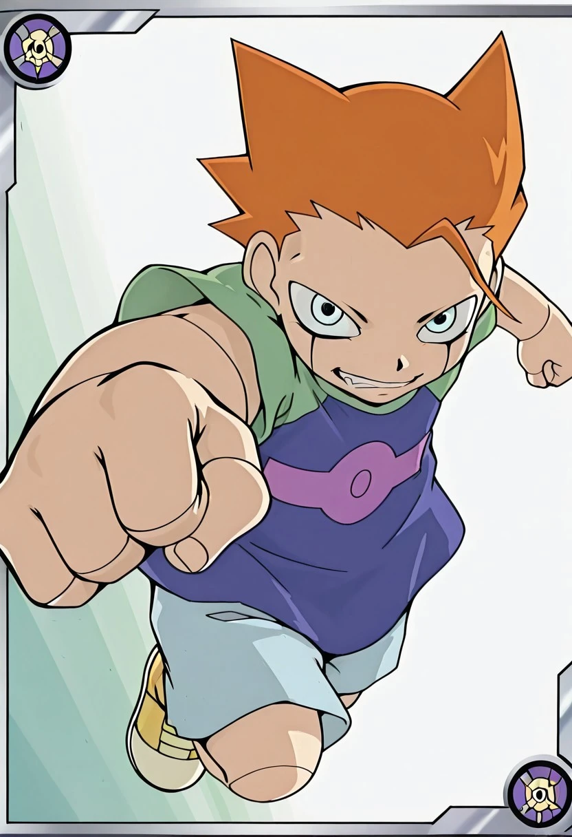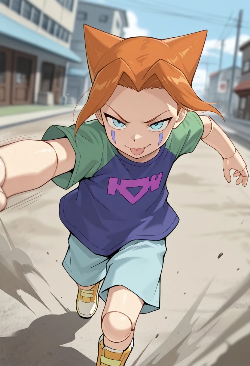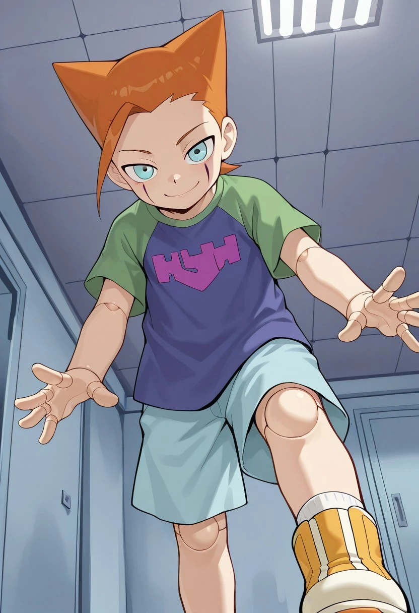 hydemamodo, 1boy, solo, triangular shape orange hair, light blue eyes, vertical face mark, joints, blue t-shirt, purple logo, green short sleeves ,light blue shorts, large yellow and orange high-top sneakers, male child,