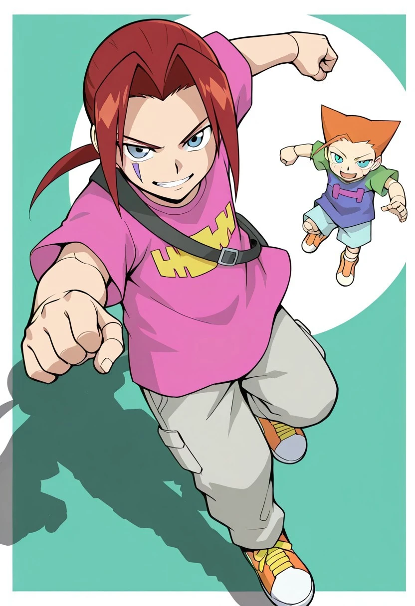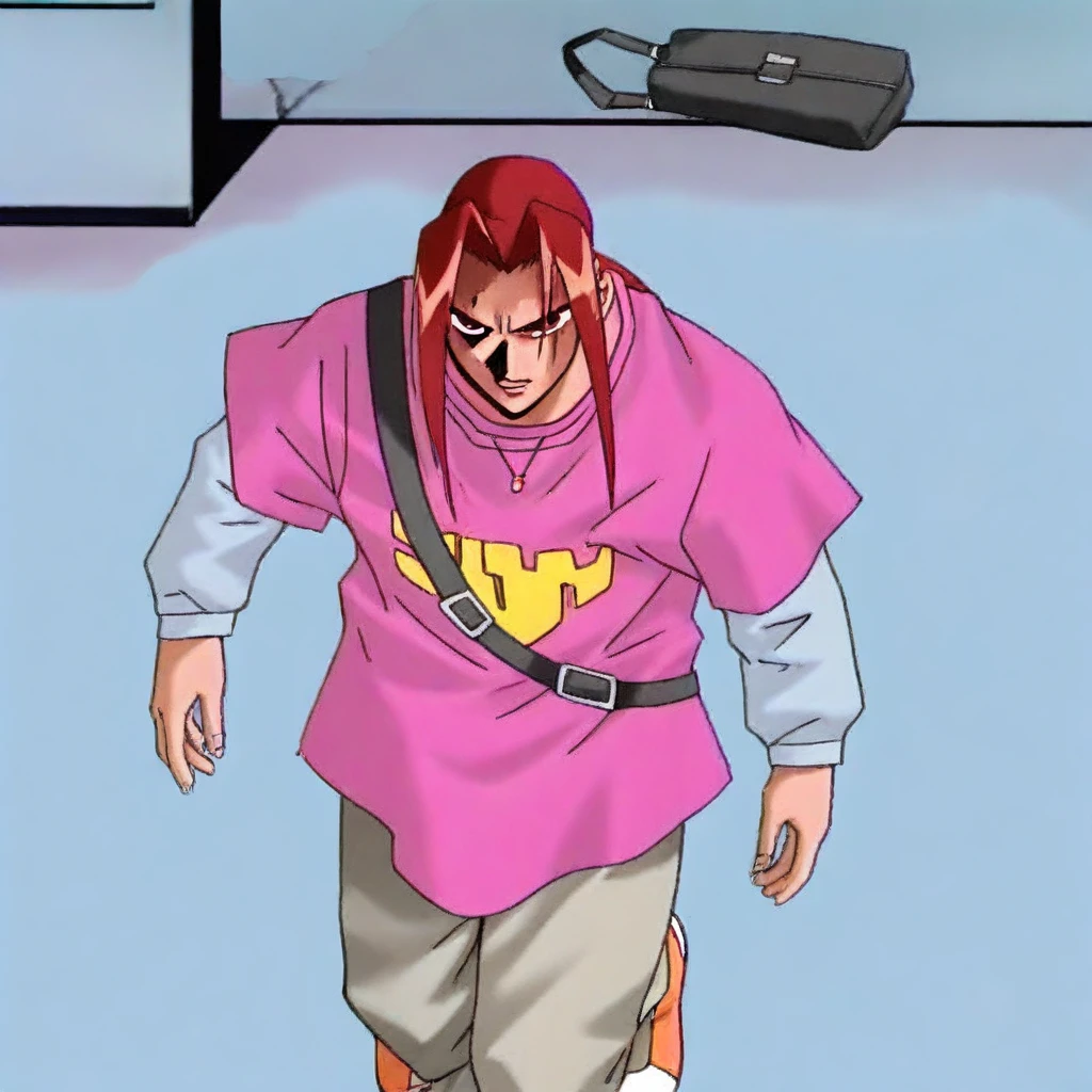 EidoPartner, 1man, long red hair, low ponytail, long bangs, loose-fitting pink t-shirt, yellow logo, long-sleeve light blue shirt, baggy gray pants, crossbody bag, blue white and orange sneakers,