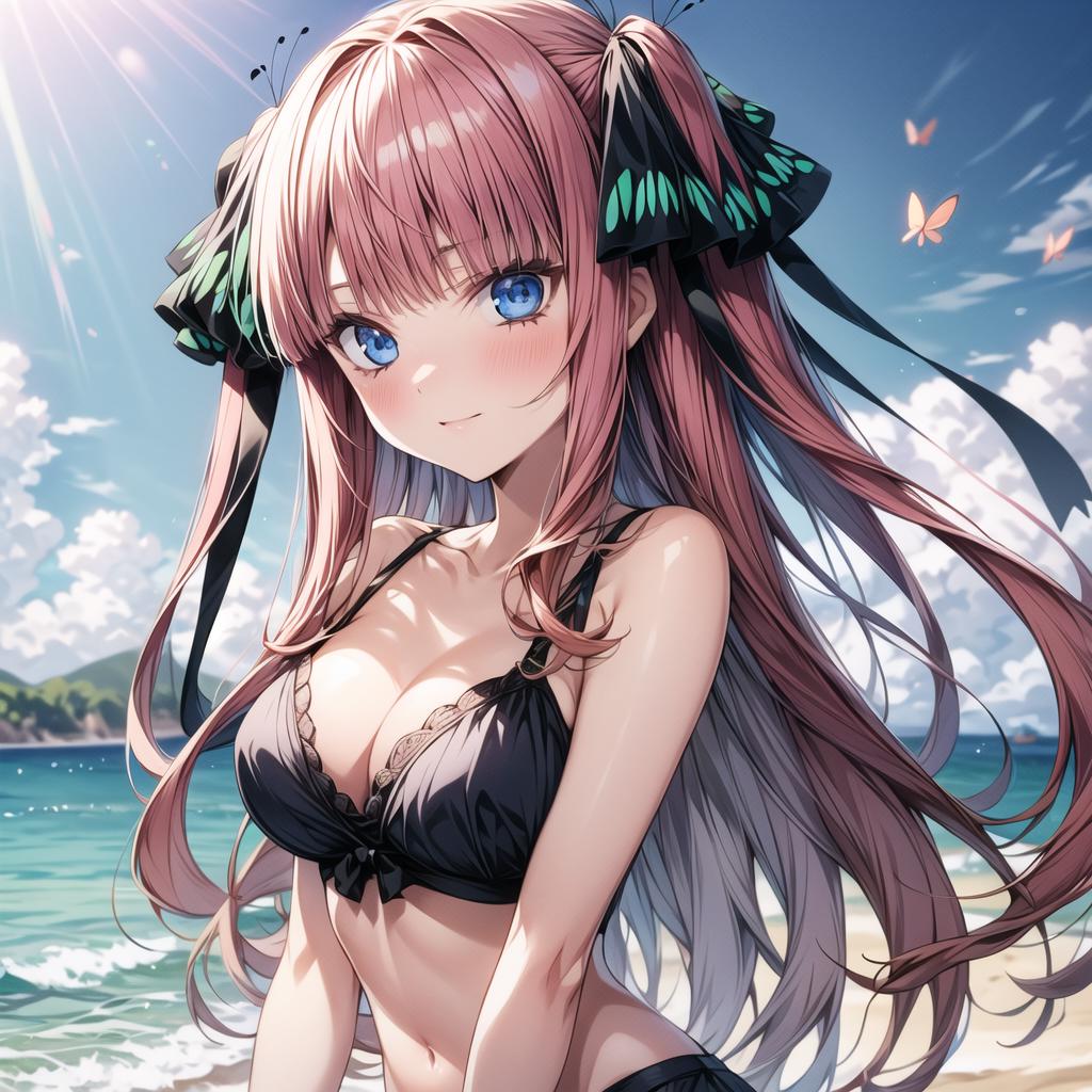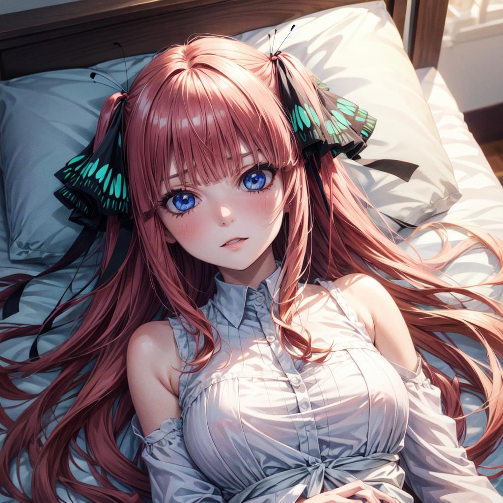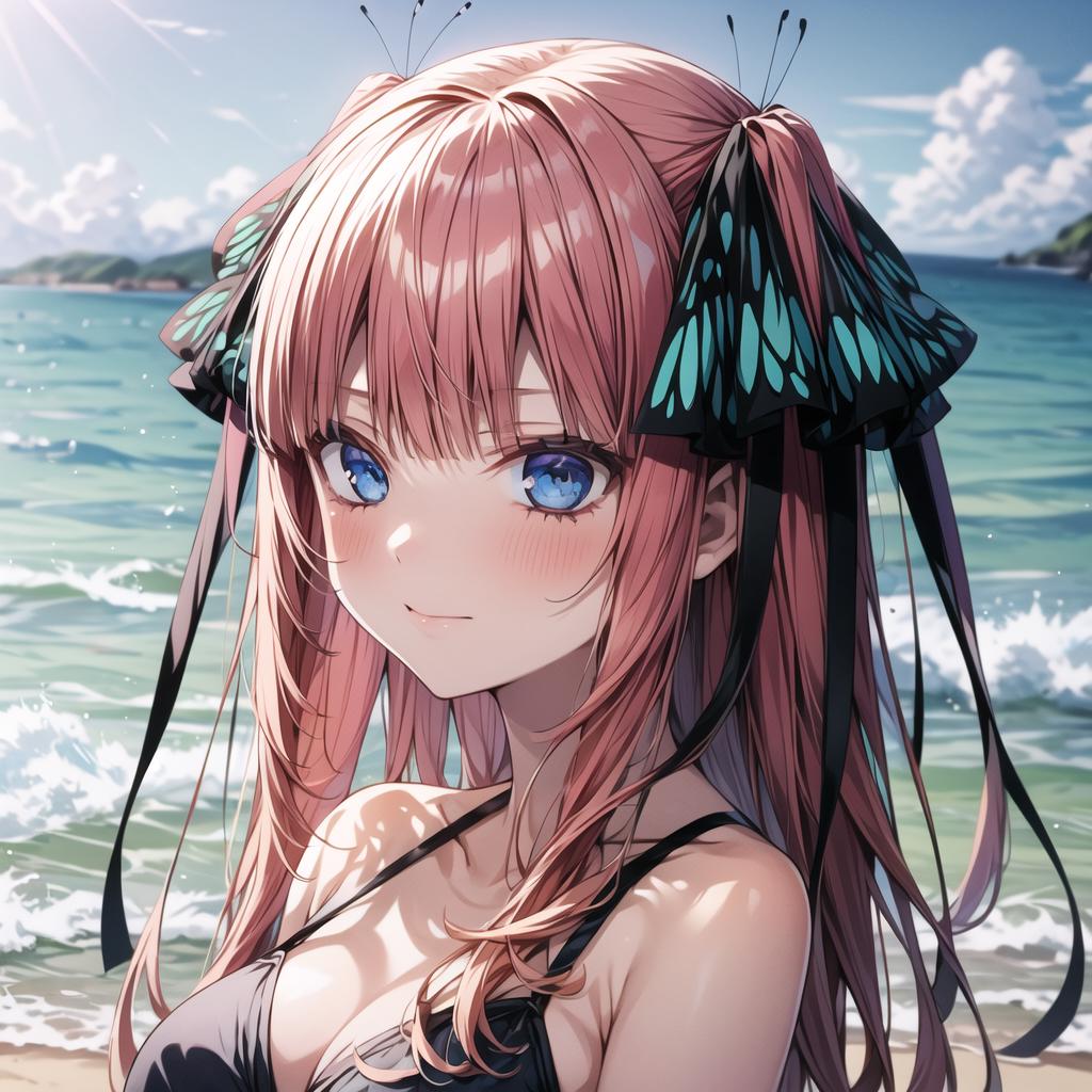 <lora:Nino Nakano_2:0.6>, nino nakano, long hair, bangs, blue eyes, hair ornament, hair ribbon, pink hair, blunt bangs, two side up, butterfly hair ornament,