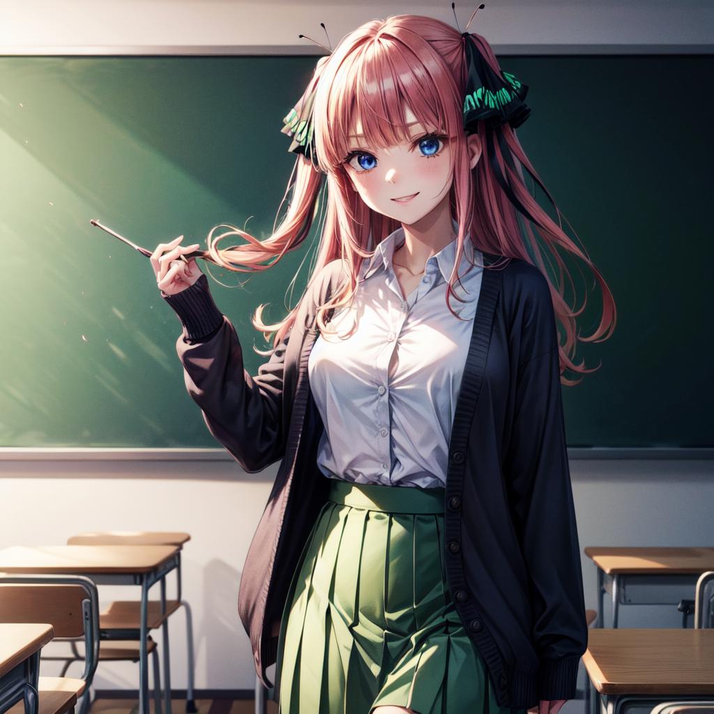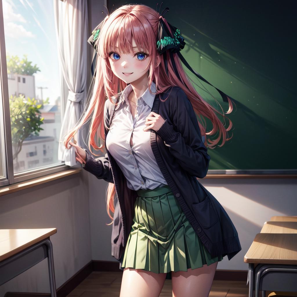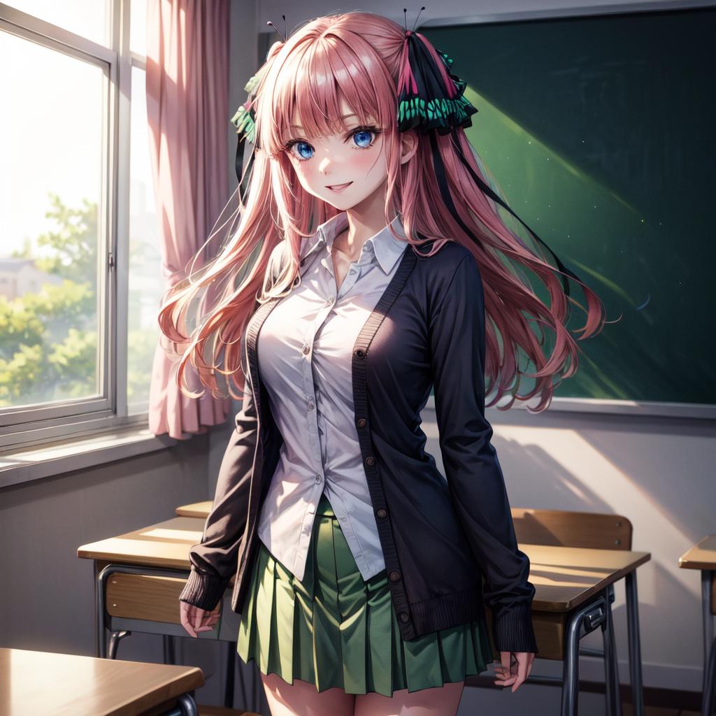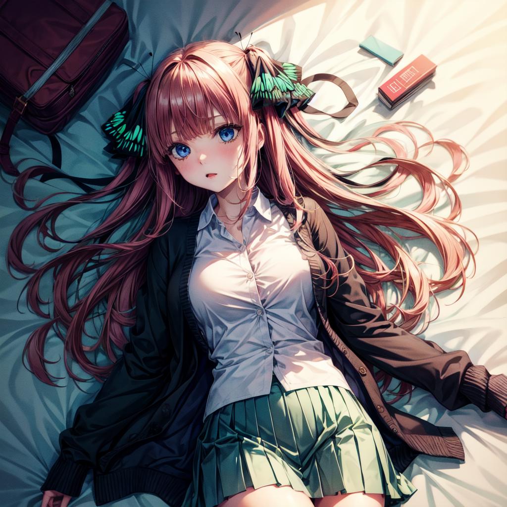 <lora:Nino Nakano_2:0.6>, nino nakano, long hair, bangs, blue eyes, hair ornament, hair ribbon, pink hair, blunt bangs, two side up, butterfly hair ornament,
