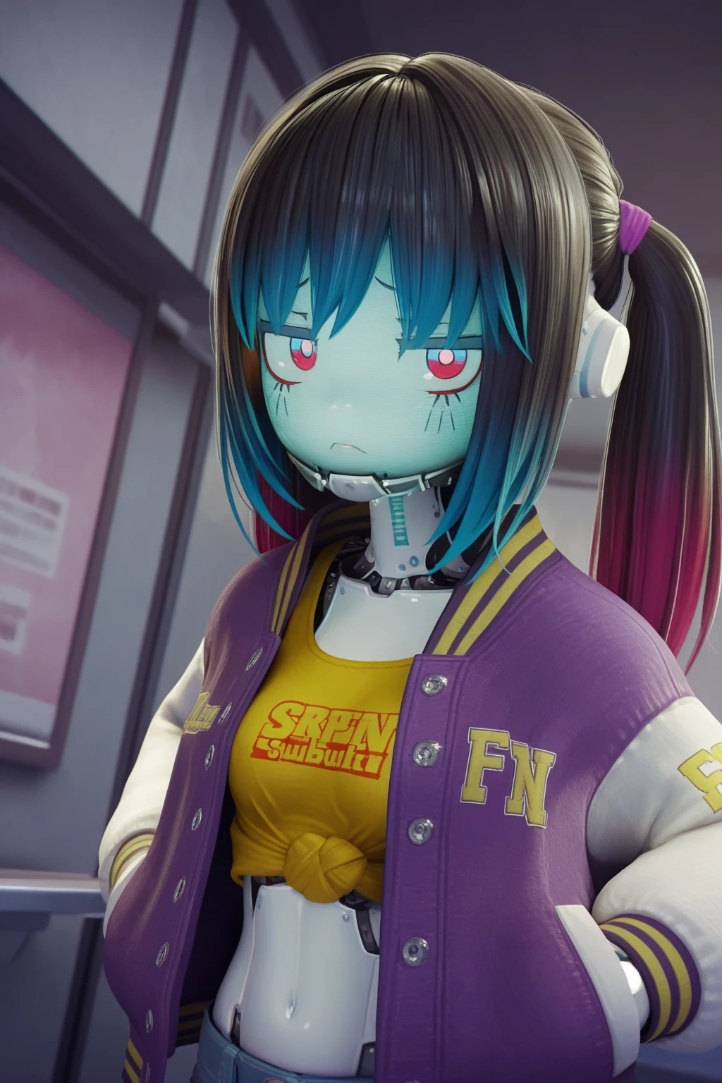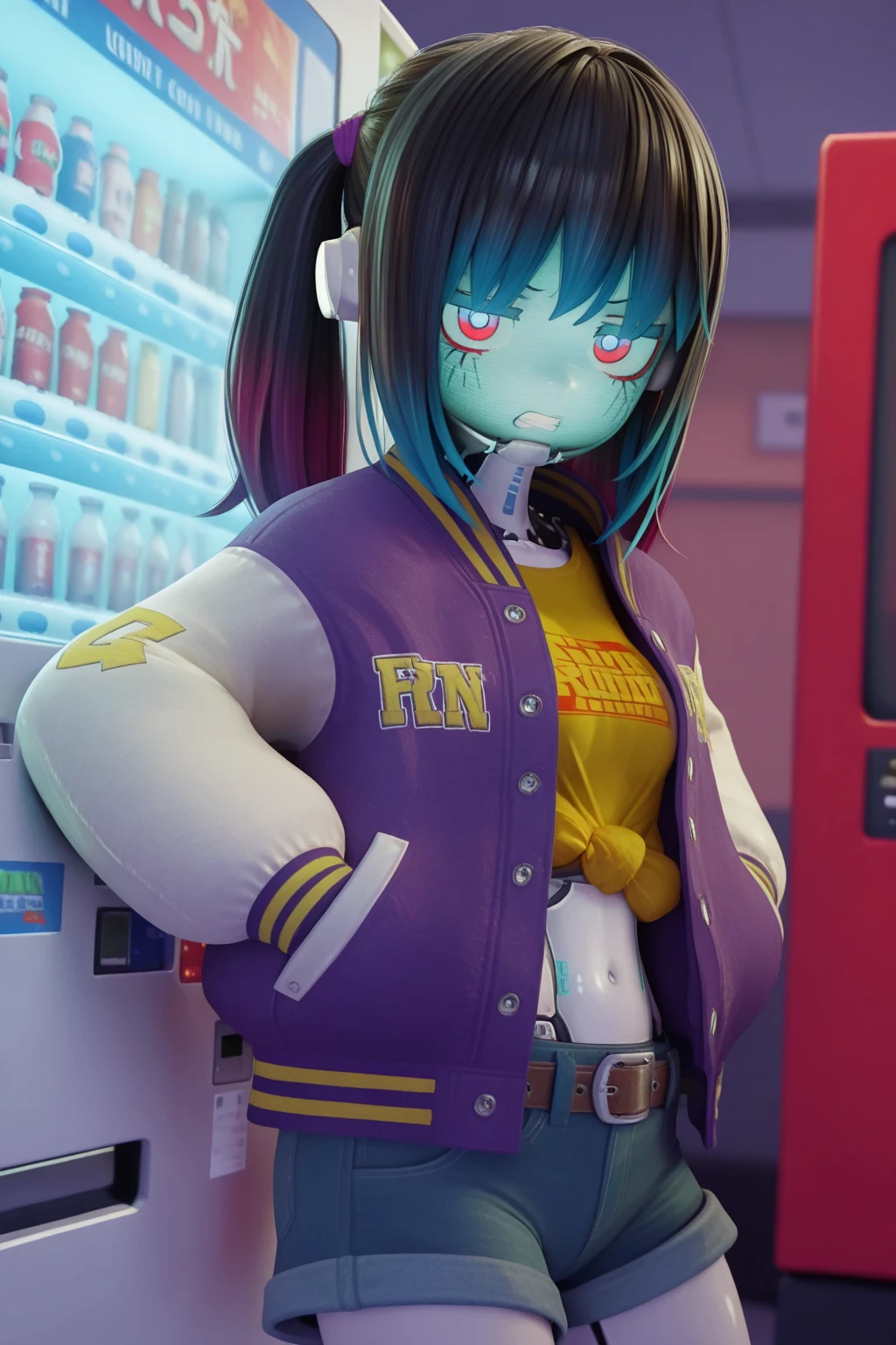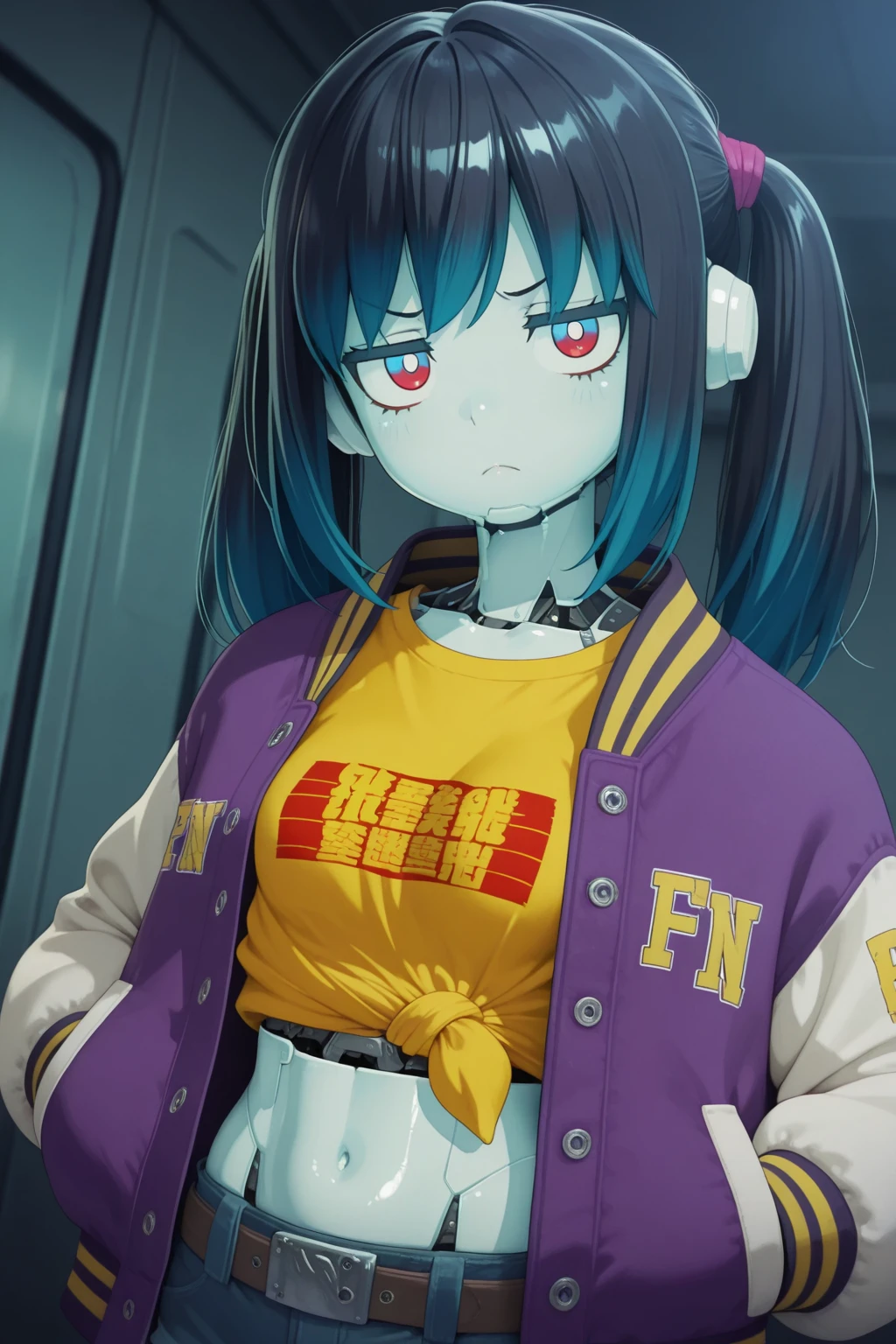 KMMilkySubway, robot girl, science fiction, twintails, blue hair, blue eyes, red eyes, jitome, sanpaku, metal skin, glowing, small breasts, midriff, letterman jacket, yellow shirt, print shirt, tied shirt, denim shorts