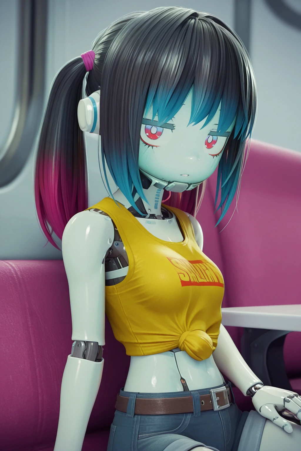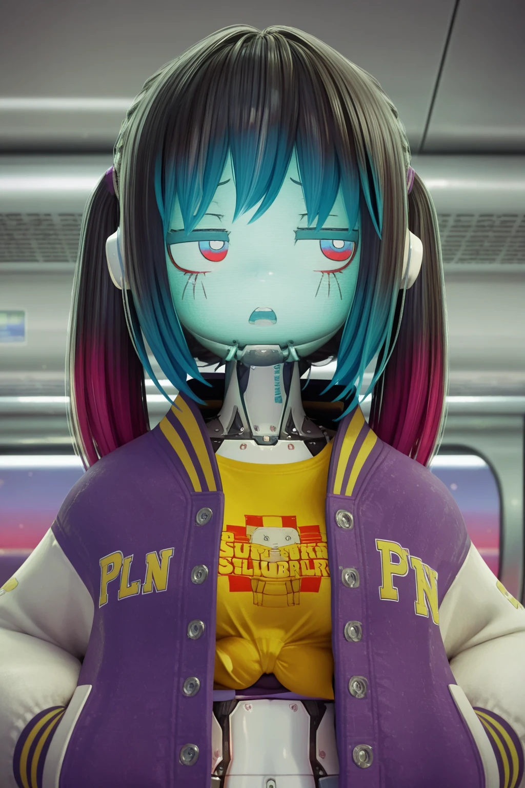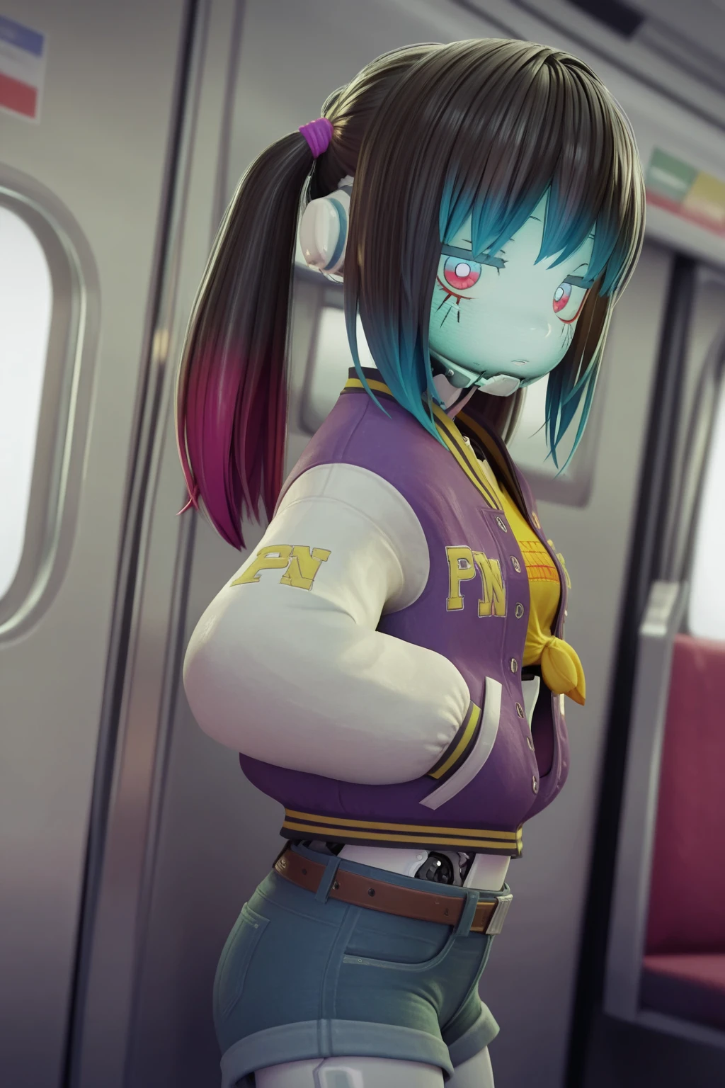 KMMilkySubway, robot girl, science fiction, twintails, blue hair, blue eyes, red eyes, jitome, sanpaku, metal skin, glowing, small breasts, midriff, letterman jacket, yellow shirt, print shirt, tied shirt, denim shorts