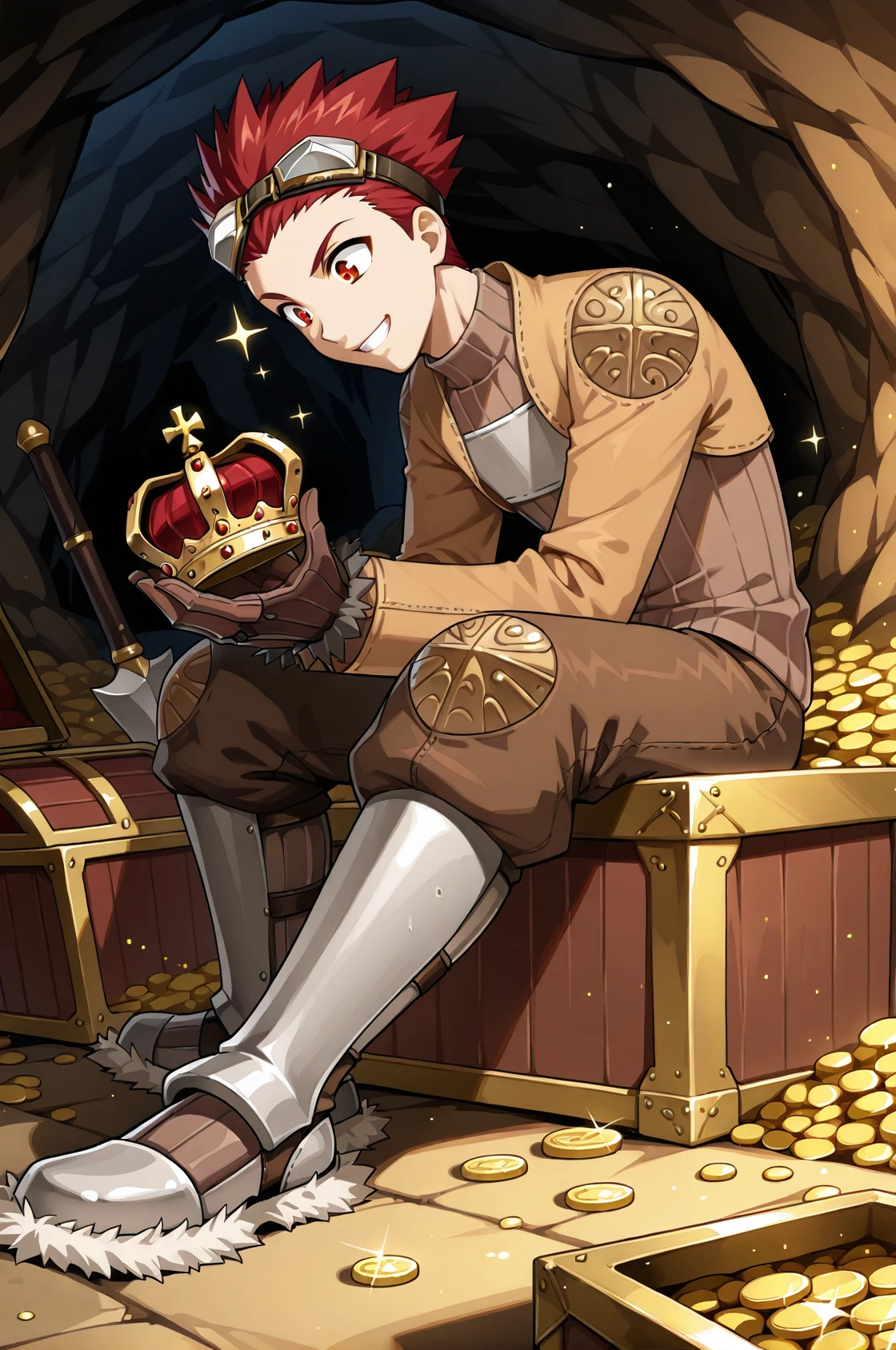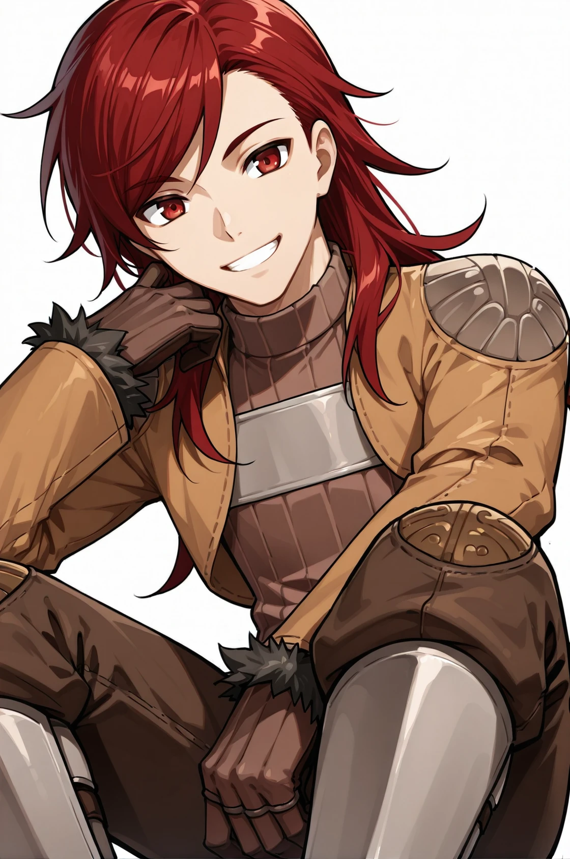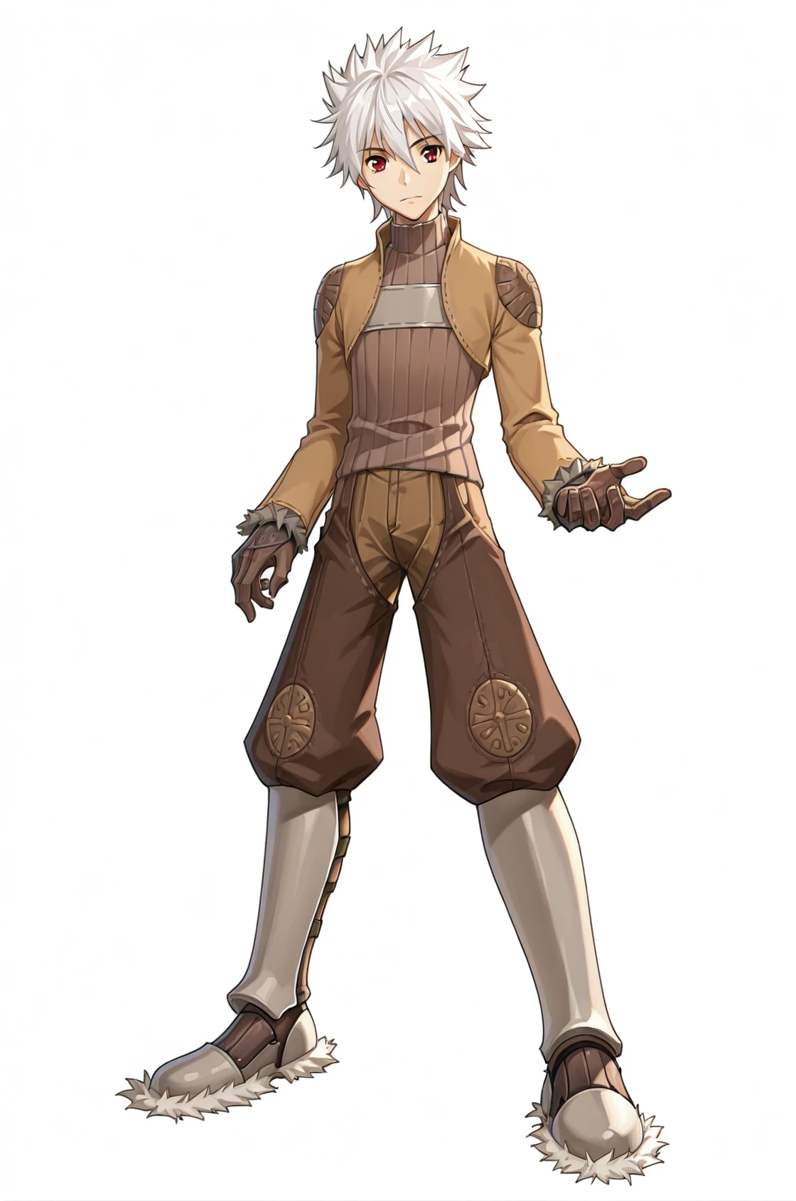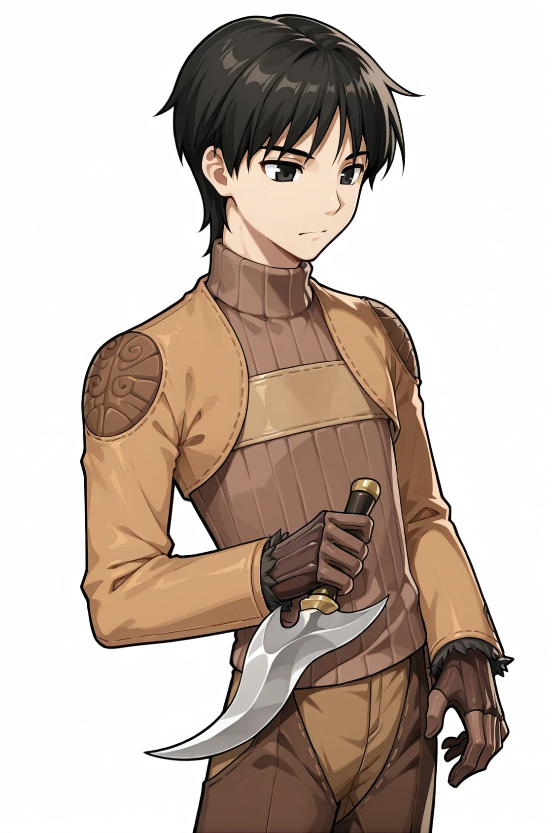 prompt: thiefROMale, brown jacket, brown pants, turtleneck, brown gloves, ribbed sweater, long sleeves, fur trim armored boots