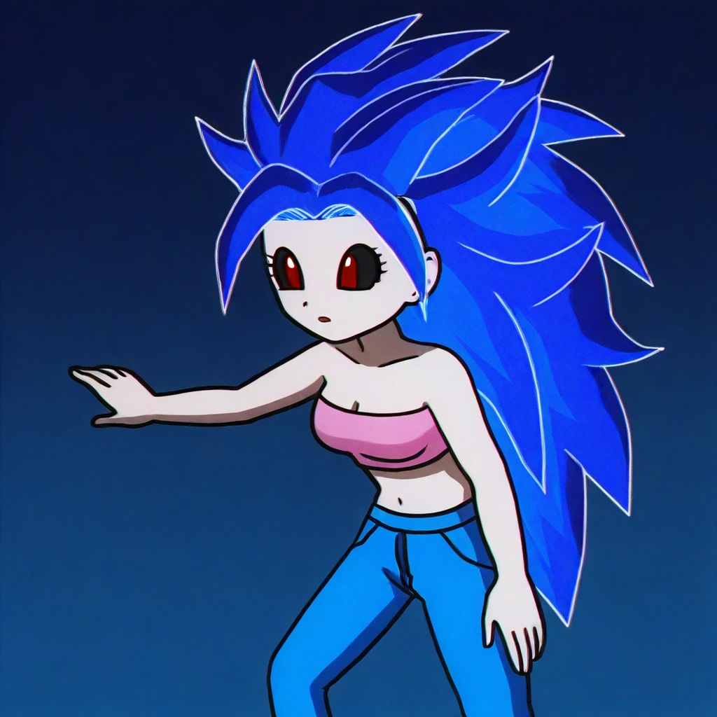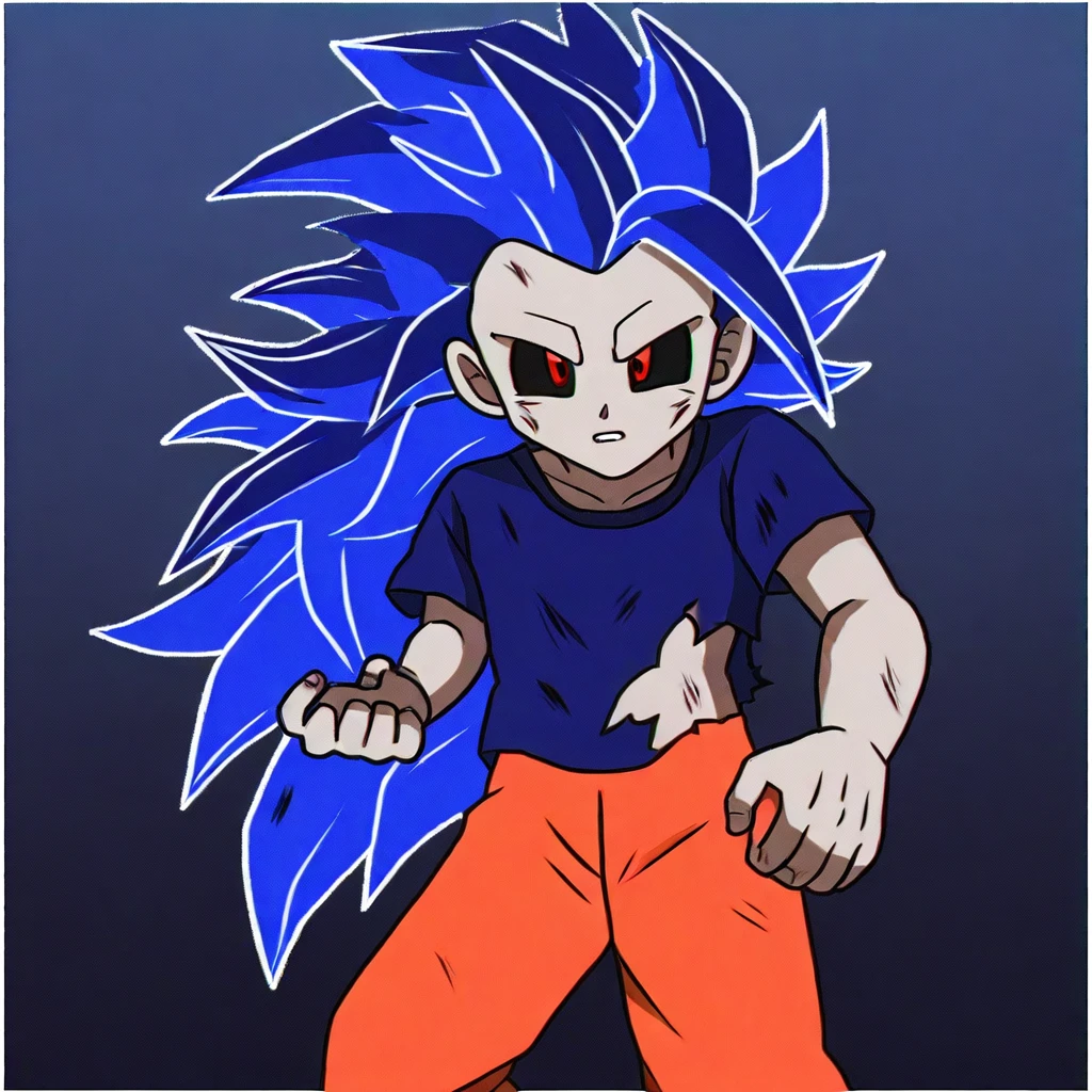 The transformation beyond Super Saiyan 6, Super Saiyan 7 resembles SS3 except with negative blue hair, black sclera and red eyes.