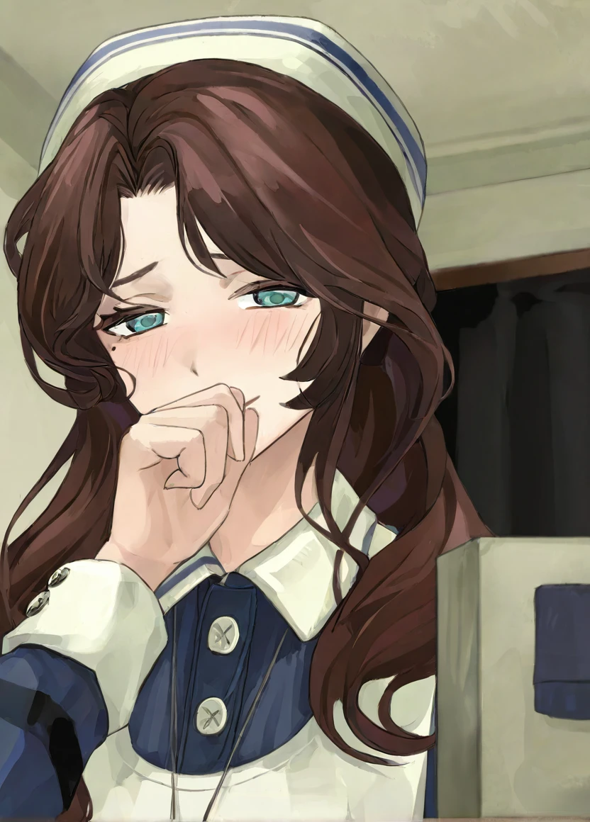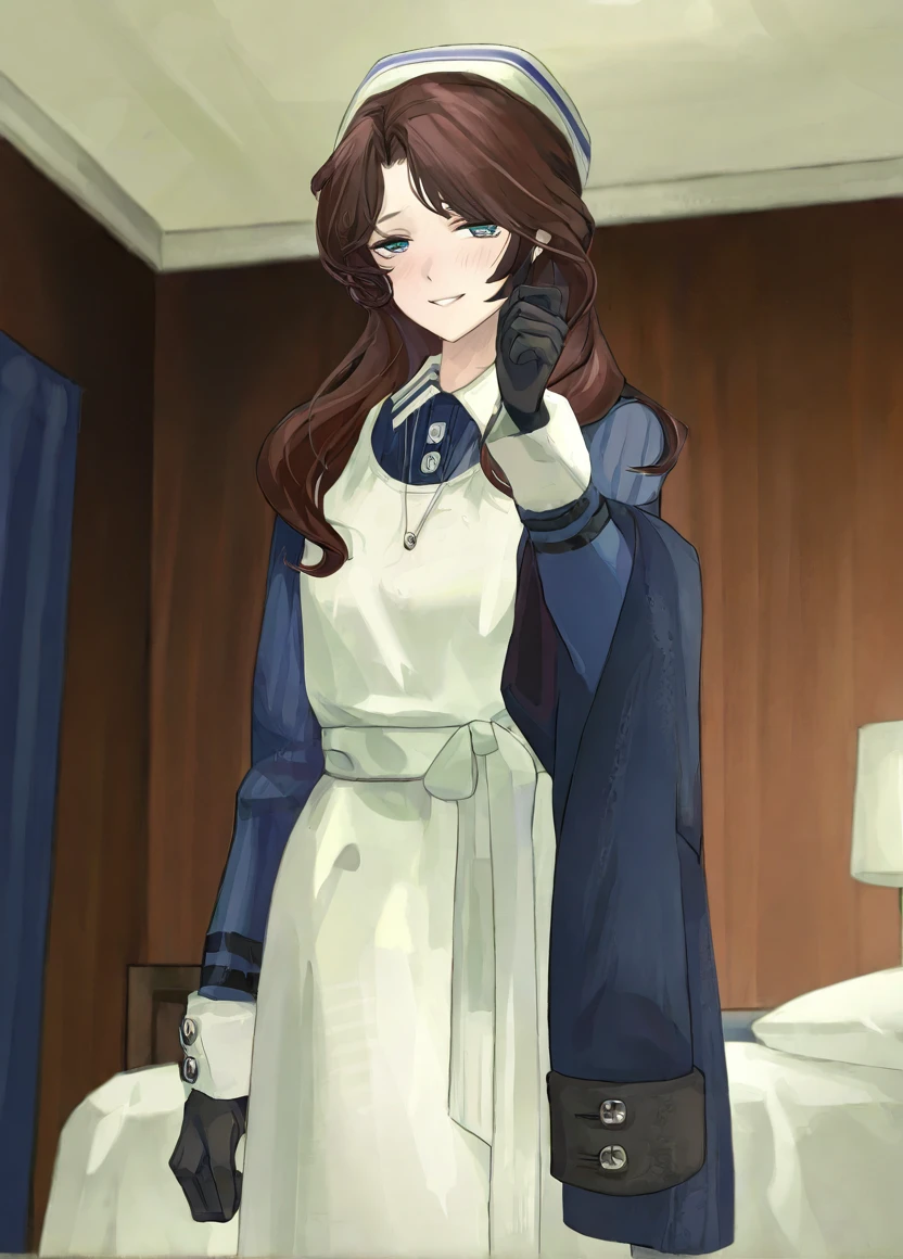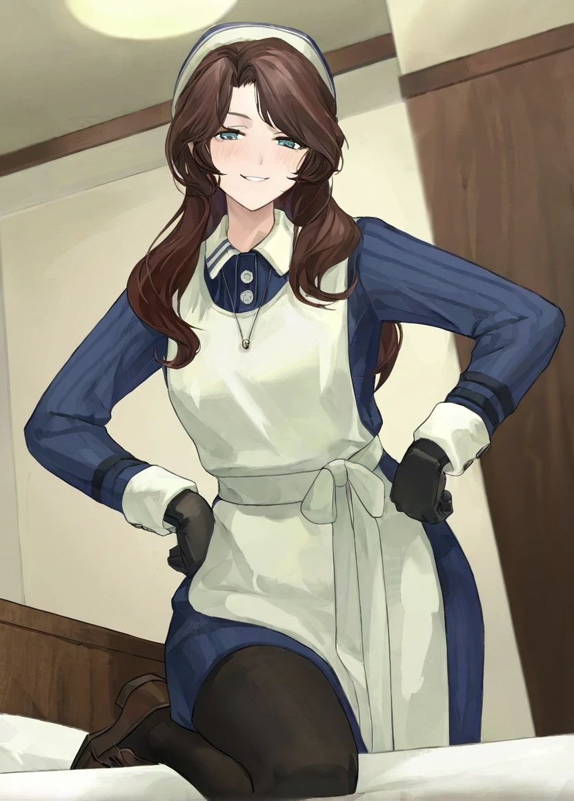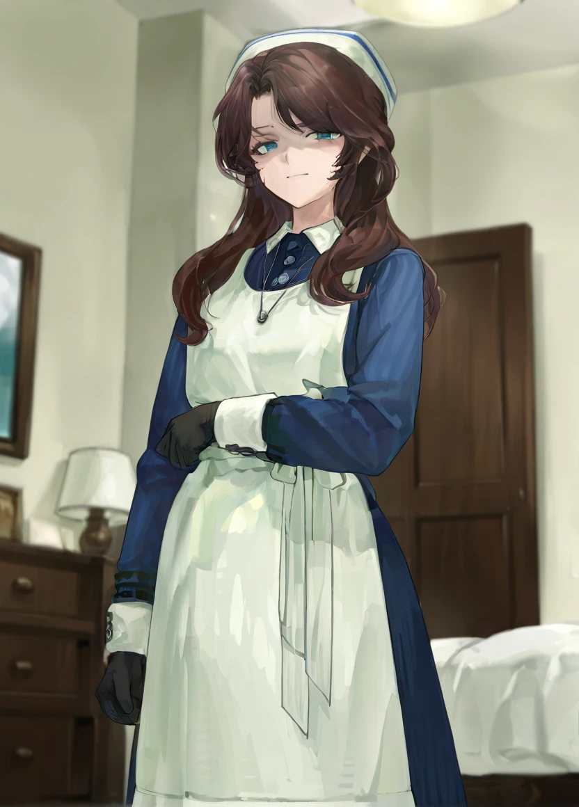 padita1999, 1girl, solo, brown hair, long hair, parted bangs, aqua eyes, collared dress, blue dress, long sleeves, white apron, black pantyhose, brown footwear, hat, necklace, black gloves