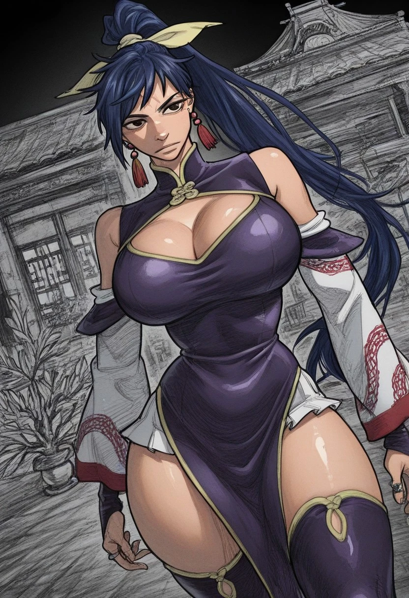 chunyan_outfit, dark purple dress, turtleneck, sleeveless dress, high slit dress, clothing cutout, tight clothing, gold trim, pelvic curtain,