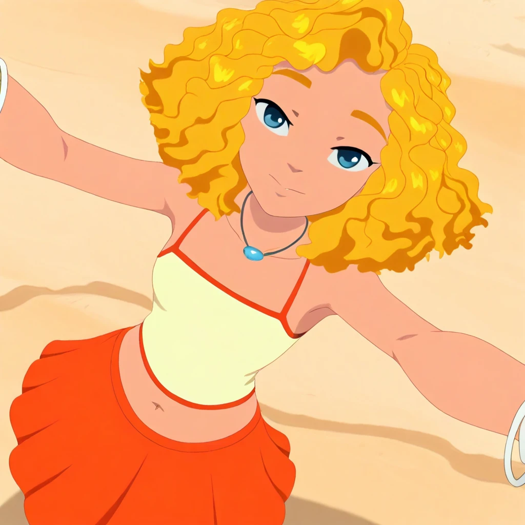 emma_ma, 1girl, blonde hair, blue eyes, necklace, camisole, navel, skirt, bracelet