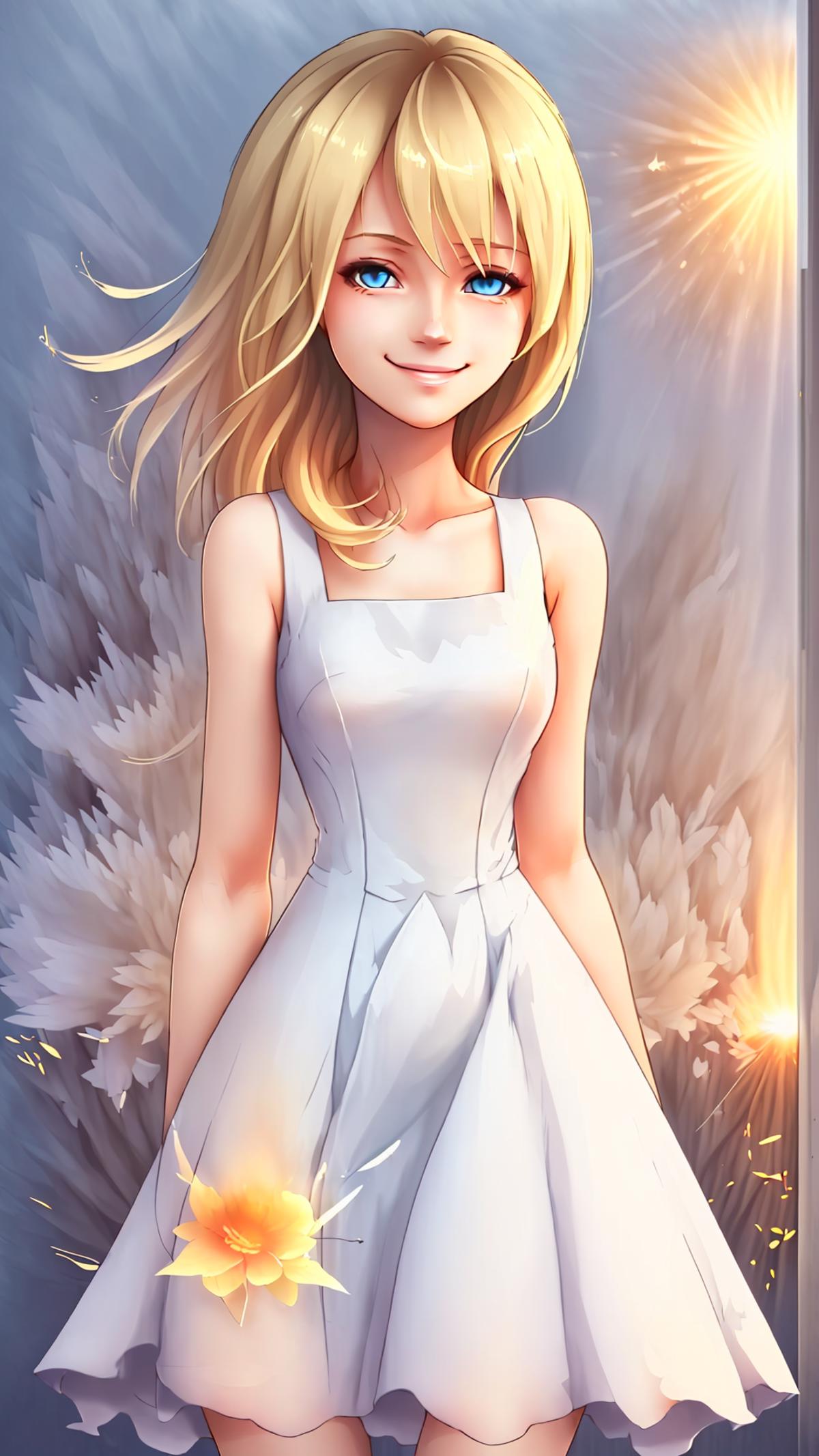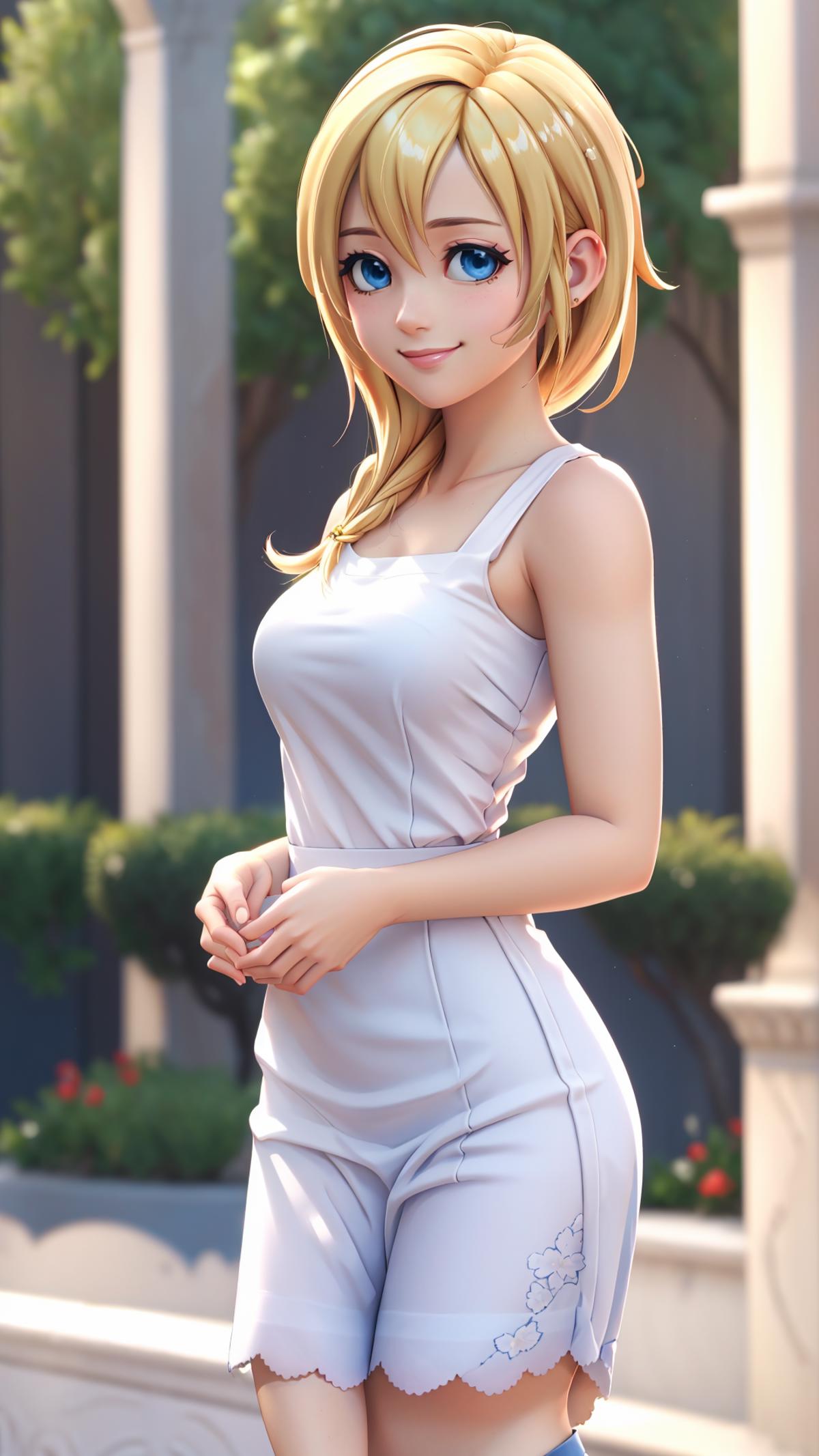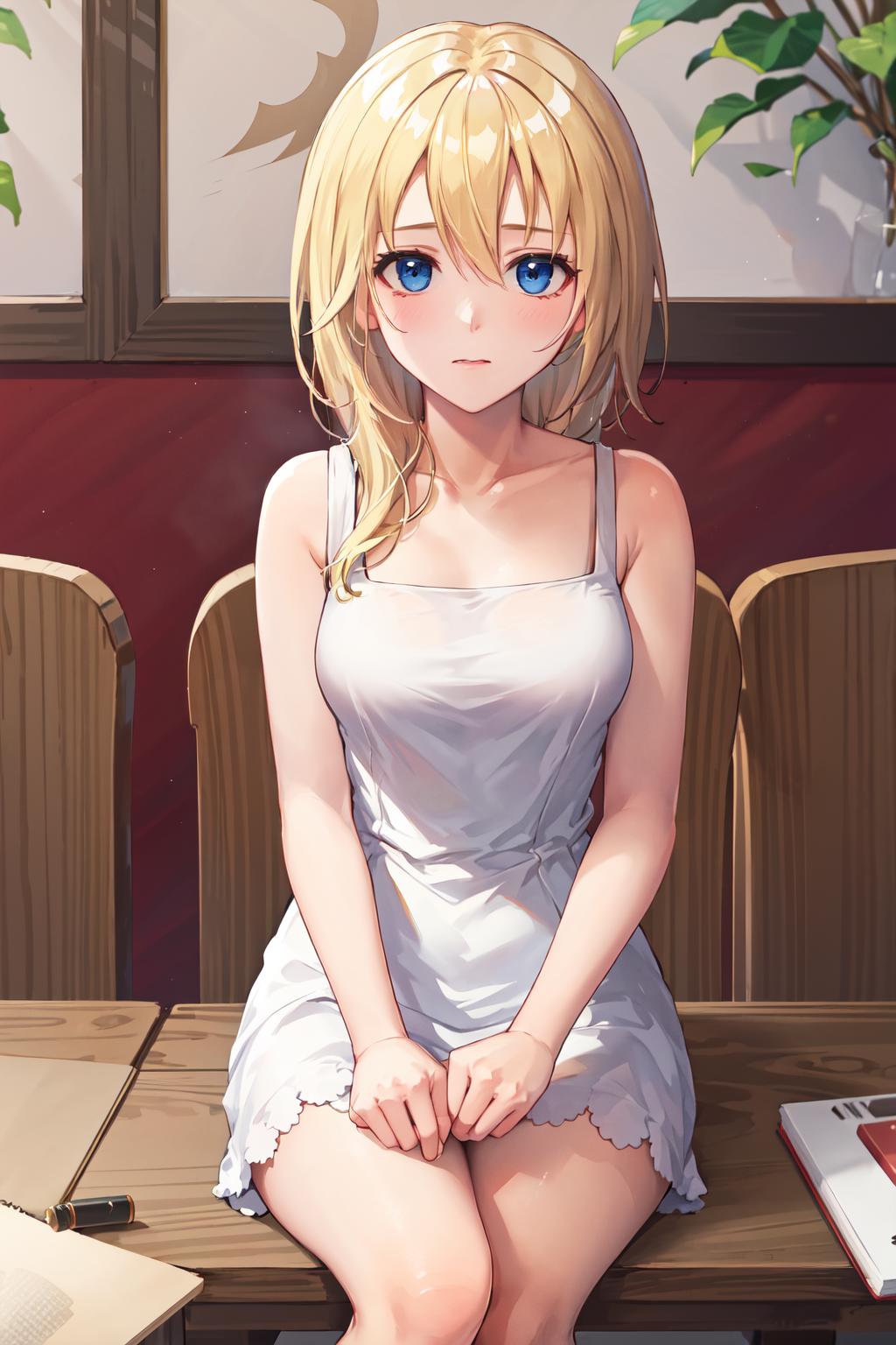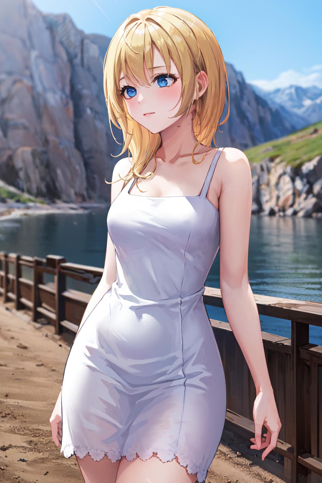 aanamine, blonde hair, bare shoulders, white dress, dress