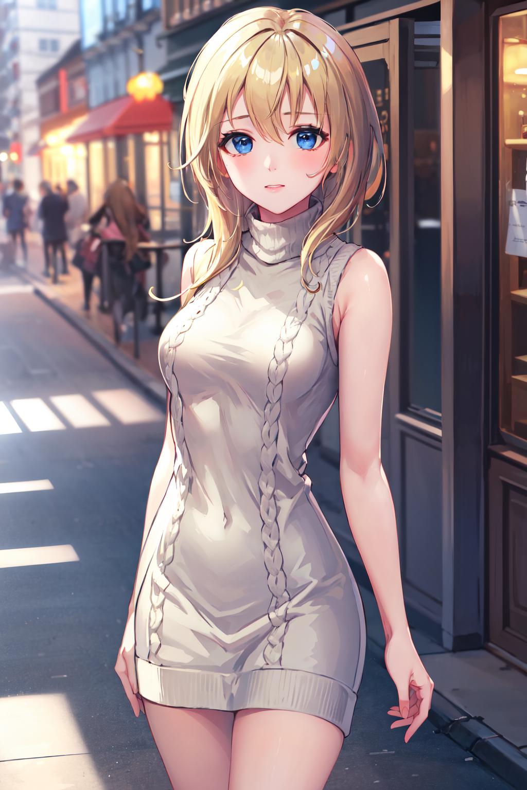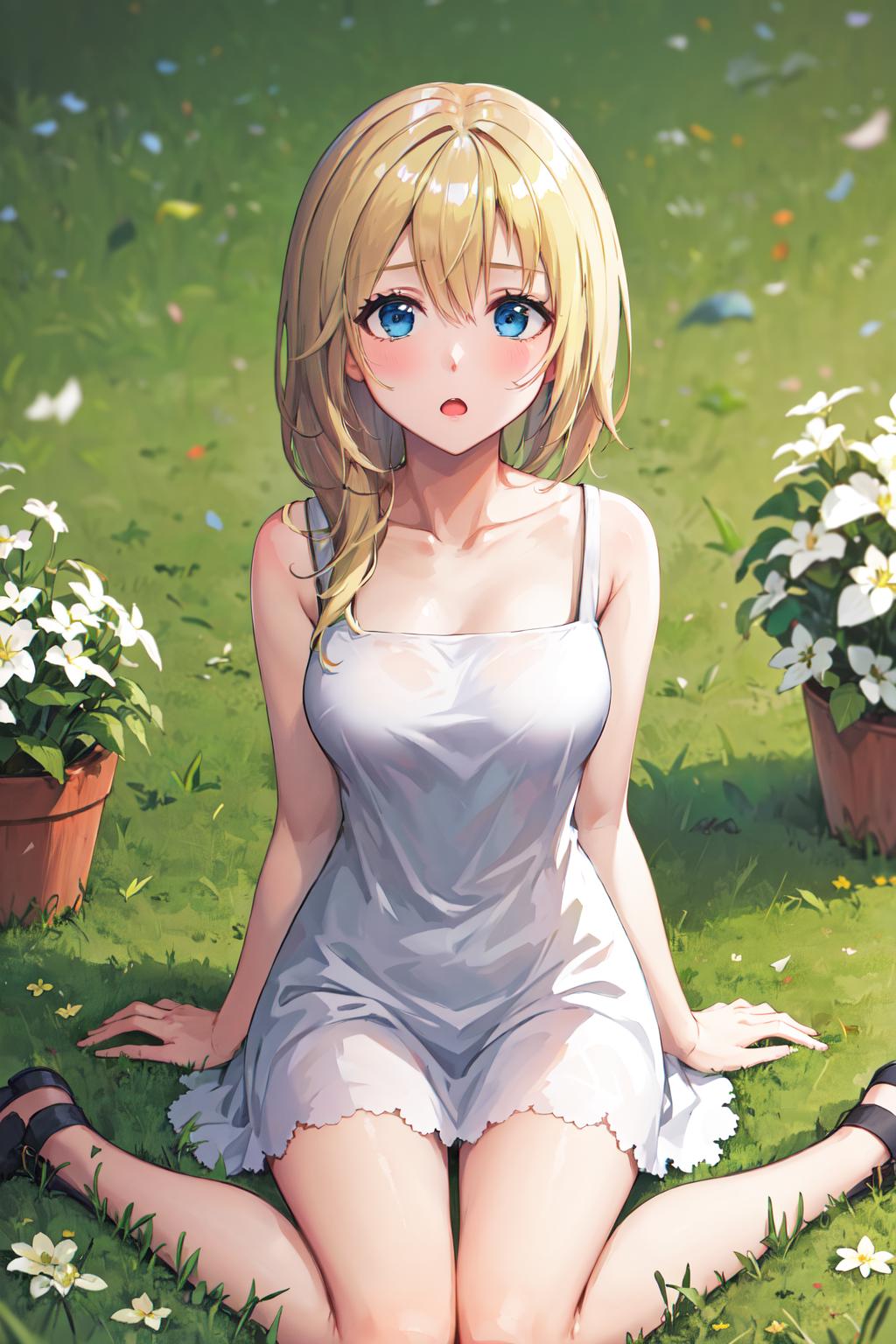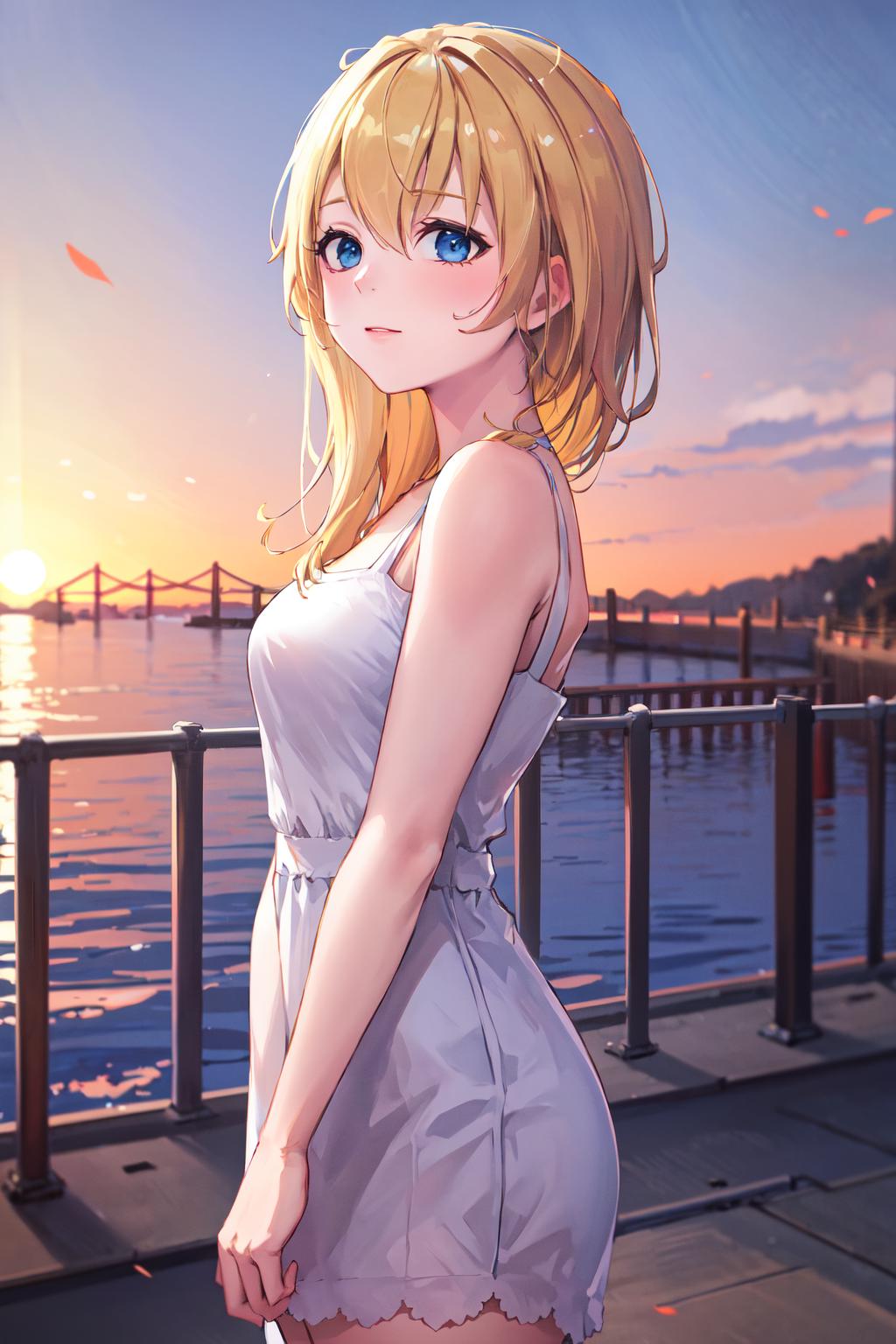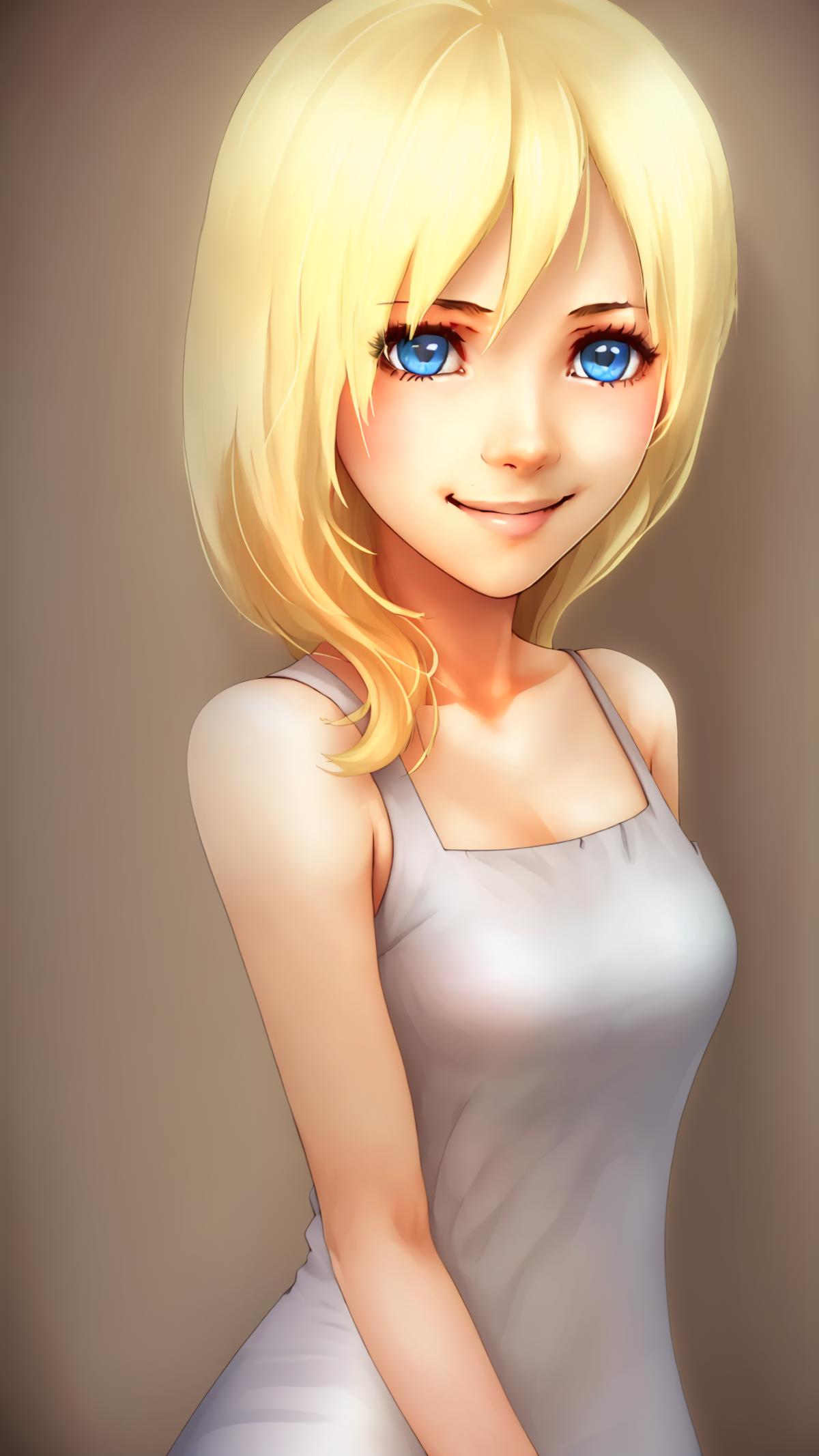 aanamine, blonde hair, bare shoulders, white dress, dress