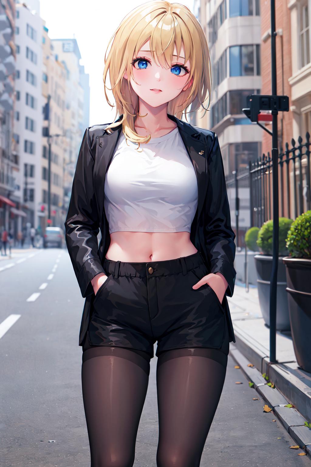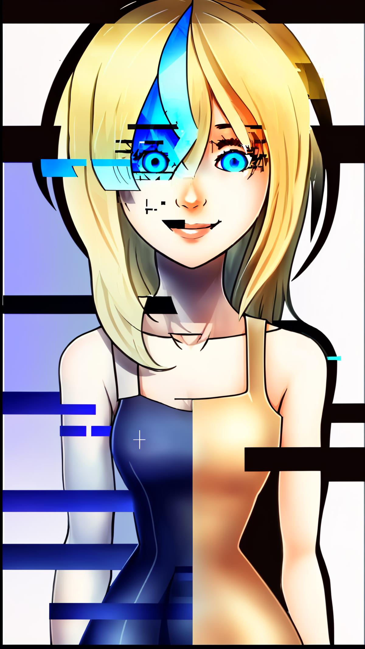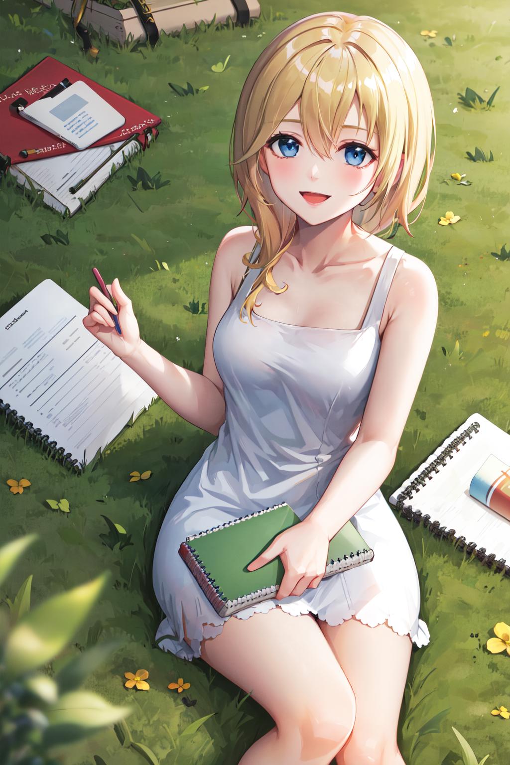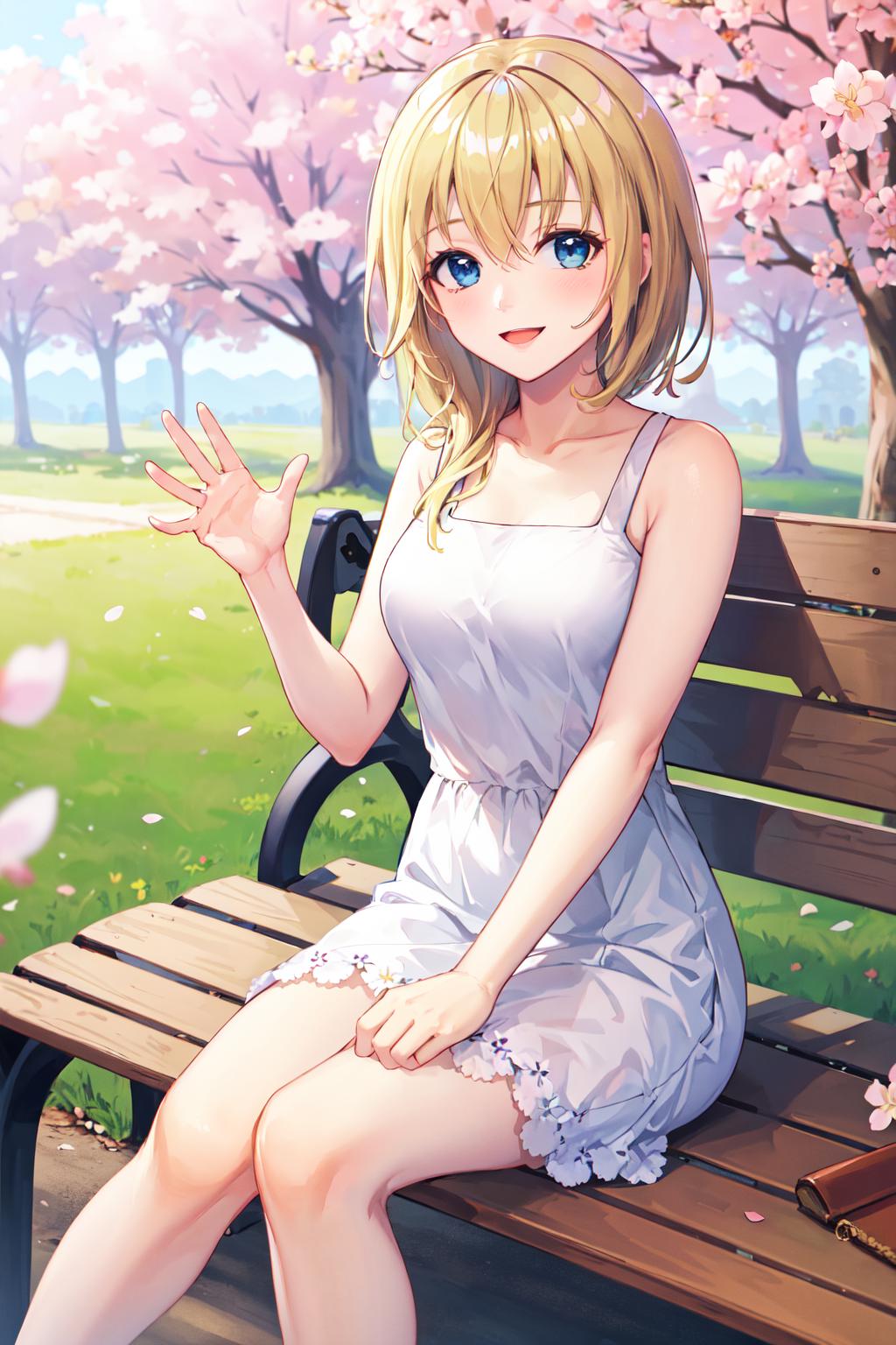 aanamine, blonde hair, bare shoulders, white dress, dress