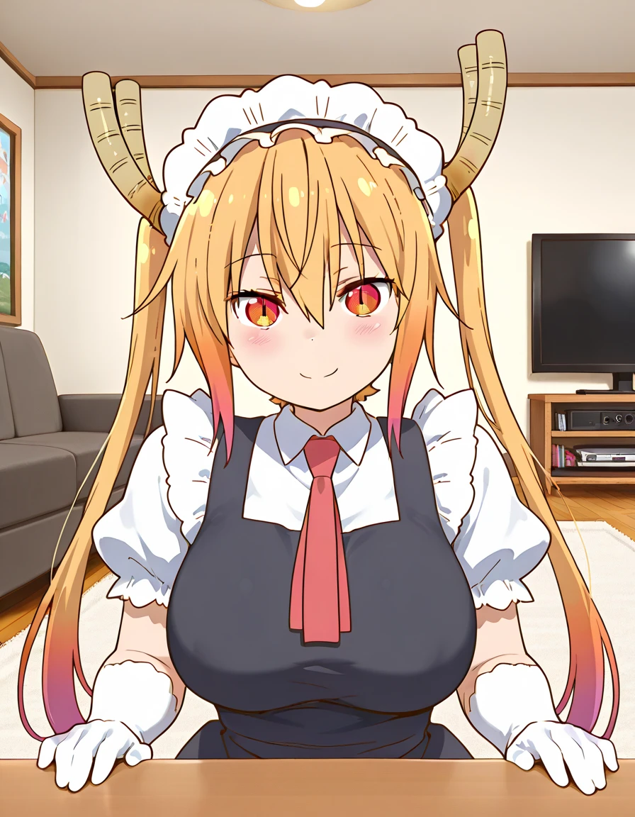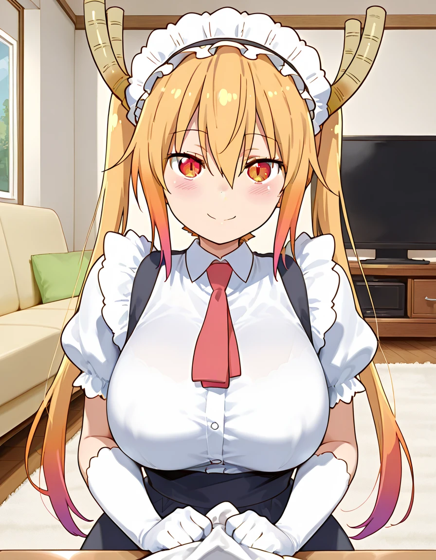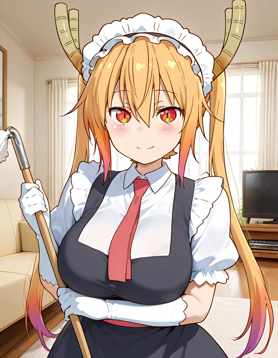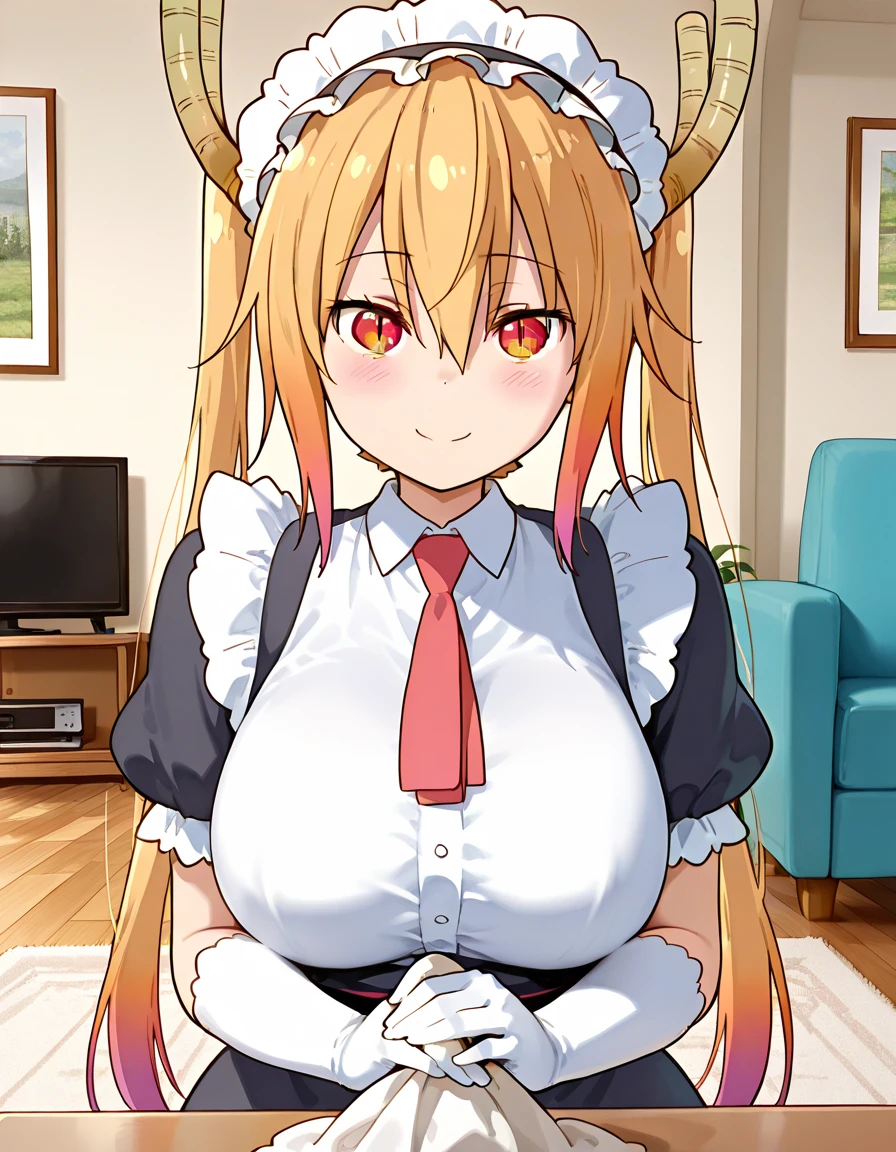 1girl, solo, long hair, blonde hair, dragon horns, dragon girl, twintails, multicolored hair, maid headdress, maid, gradient hair, red necktie, smile, slit pupils, looking at viewer, hair between eyes, white gloves, orange hair, blush, large breasts, short sleeves, red eyes, closed mouth, elbow gloves, bangs, puffy sleeves, maid dress, upper body