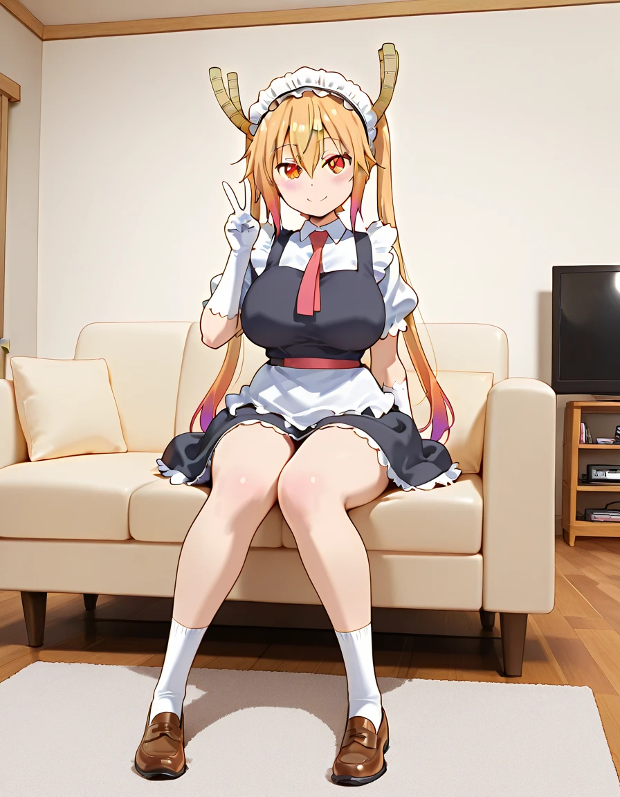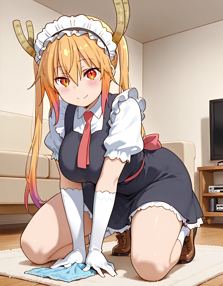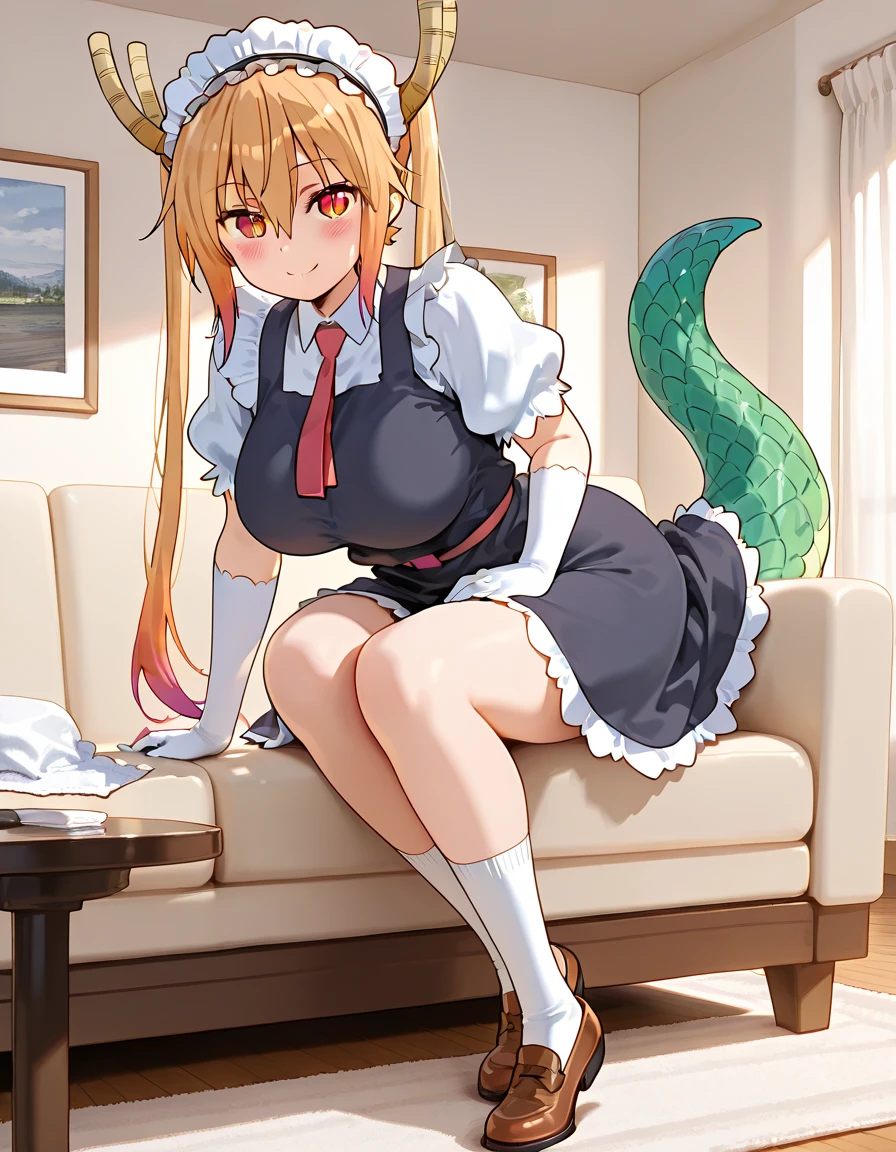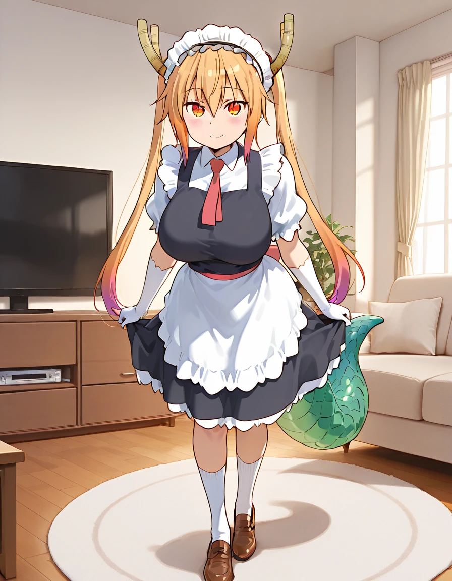 1girl, solo, long hair, blonde hair, dragon horns, dragon girl, twintails, multicolored hair, maid headdress, maid, gradient hair, red necktie, smile, slit pupils, looking at viewer, hair between eyes, white gloves, orange hair, blush, large breasts, short sleeves, red eyes, closed mouth, elbow gloves, bangs, puffy sleeves, maid dress, upper body