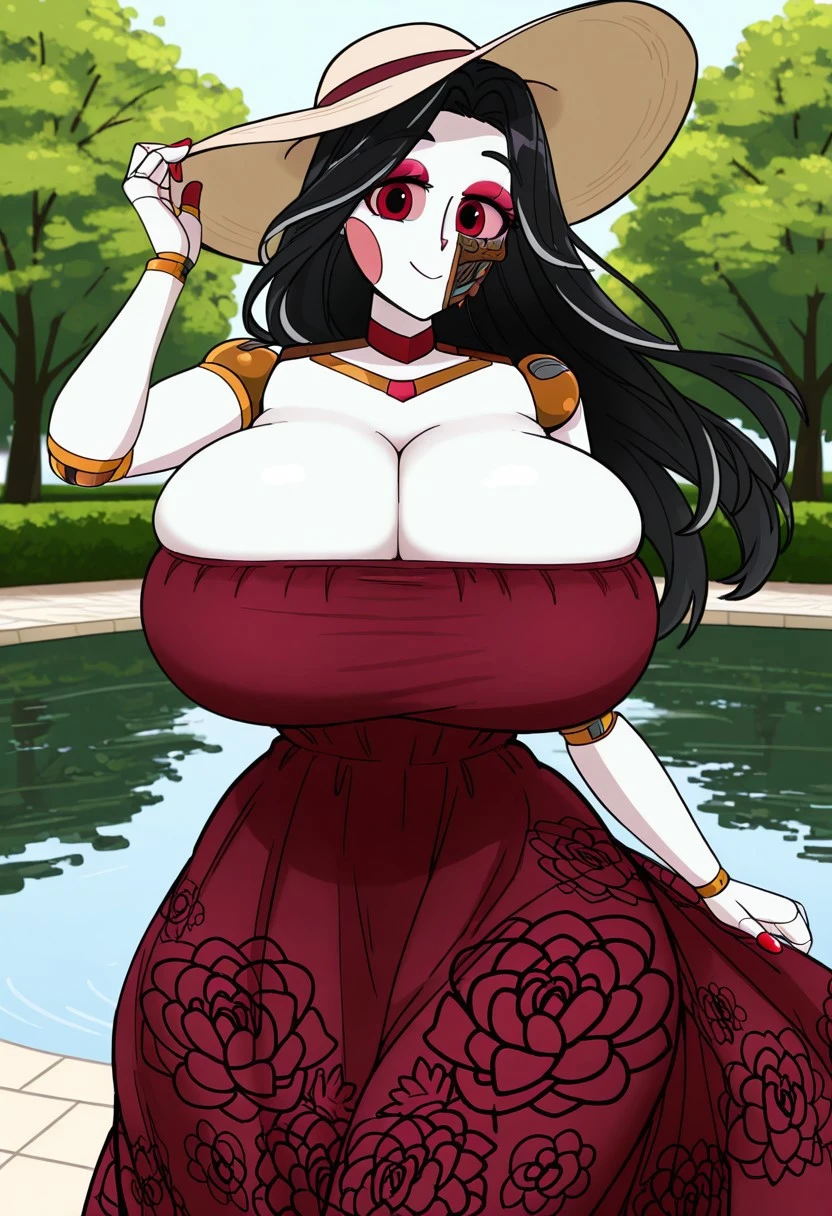 Black Hair, Multicolored Hair, Long Hair, Short Hair, Red Eyes, Colored Sclera, Red Sclera, Red Nails, Nail Polish, Joints, Doll Joints, Robot Joints, Android, Robot, Makeup, Eyeshadow, Red Eyeshadow, Blush Stickers, Monster Girl, Mature Female, Choker