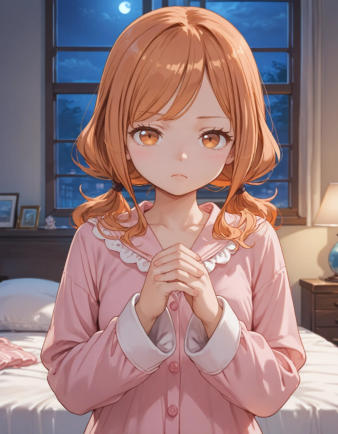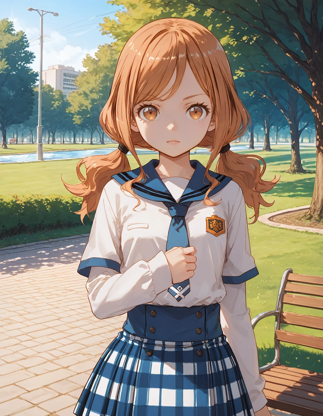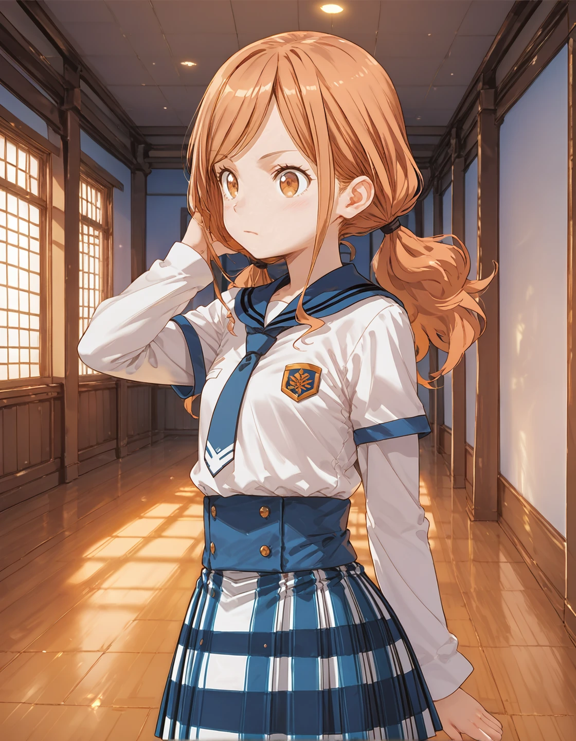mgrcaimieri, orange hair, orange eyes, low twintails, black hairpins, white with blue shirt, white short over long sleeves, blue tie, high blue with white plaid skirt