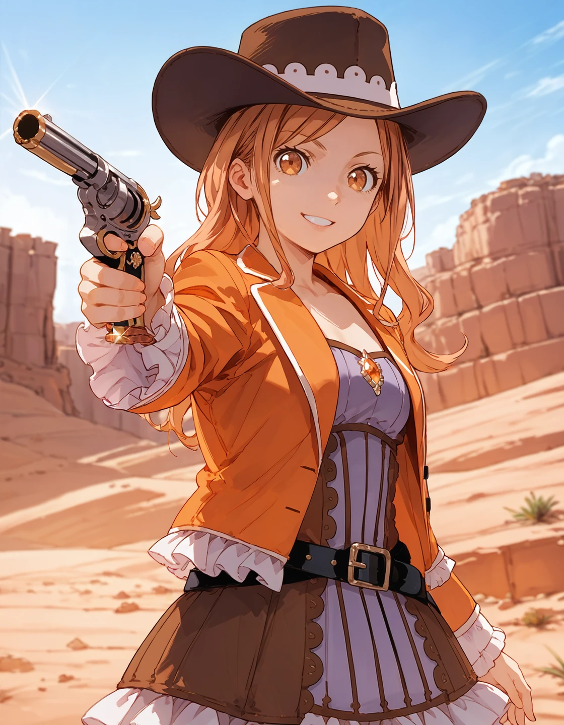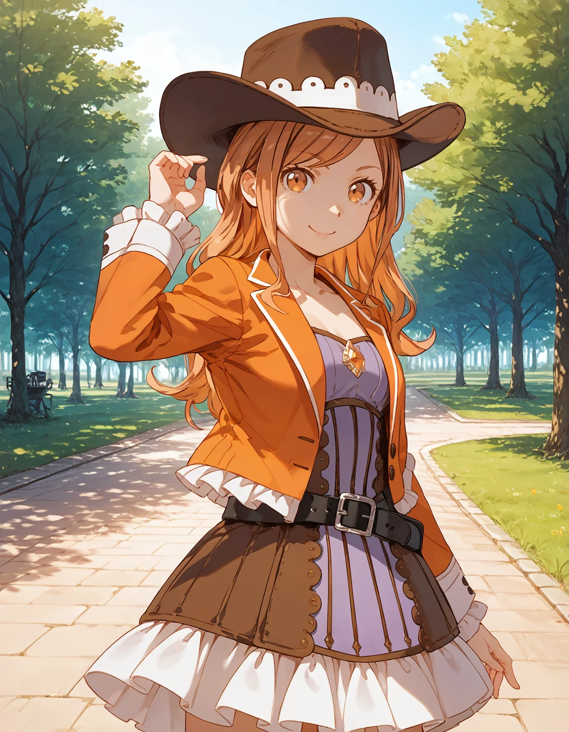 mgrcaimieri, orange hair, orange eyes, long hair, brown with white cowboy hat, frilled orange jacket, orange chest gem, purple with brown frilled dress, black belt