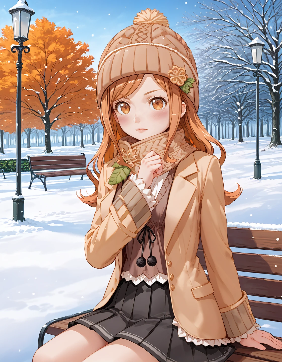 Winter outfit: mgrcaimieri, long hair, orange hat, orange scarf, white shirt, yellow blazer, brown vest with black bowtie, black pleated skirt, brown thighhighs